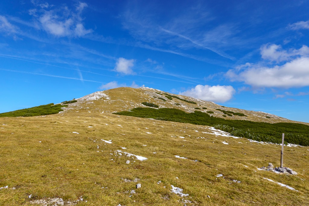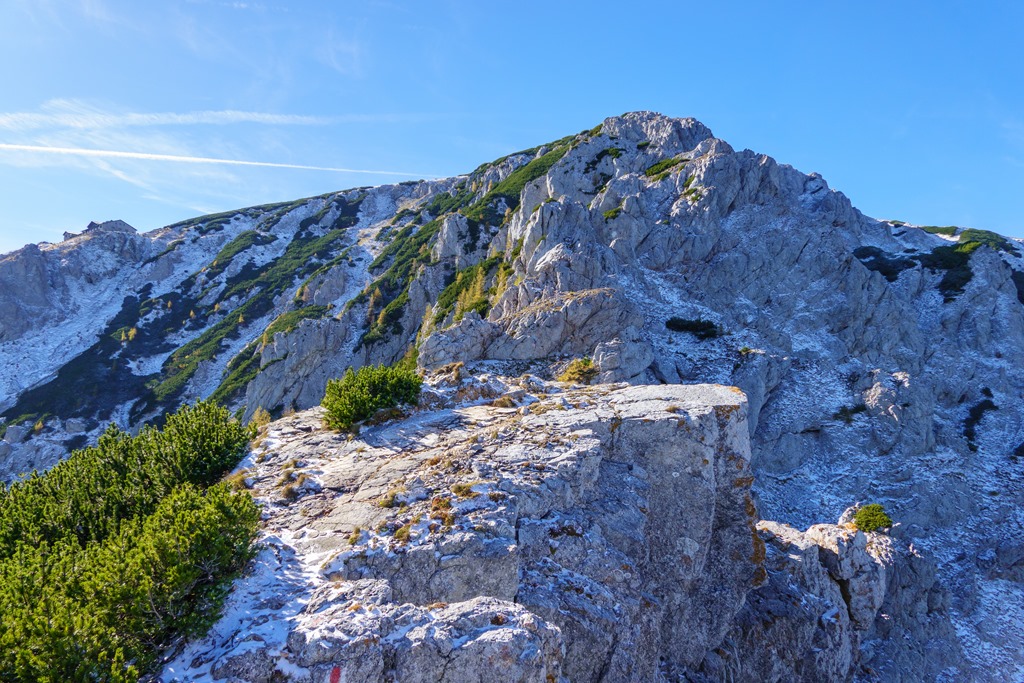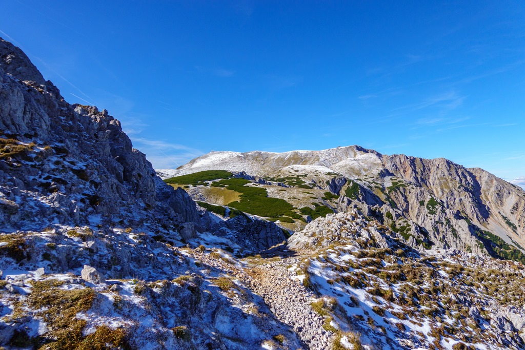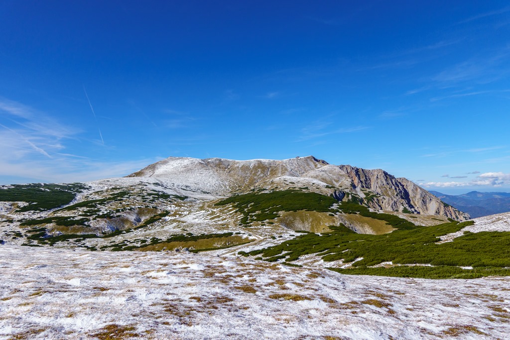 Ascher nyergen átbukkanva aztán elém tárul a Schneebrg teljes panorámája, amely enyhén cukrozott képet mutat. Ha van is hó, az nem lehet sok, tehát mindenképpen megpislantanám a Grafensteig vonalát (fenti és lenti képeken).
