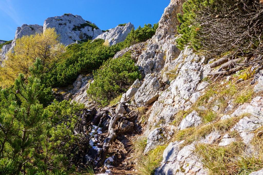 Nekem is pont egy északi útvonalat kell ilyenkor választanom, dohogok magamban, amint meglátom a valóban télies utat. Szerencsére ott, ahol a nap bevilágít, a hó máris olvadozóban, helyenként már teljesen el is tűnt. Amikor elérem a Felső Herminensteig beszállóját, még gondolkodom egy sort, hogy akkor most merre menjek. Tovább a Grafensteigen egy óra Baumgartner, majd onnan fel a platóra még legalább ugyanennyi idő. A Herminensteiggel bő egy, másfél óra alatt végeznem kéne. Ez adja meg a löketet ahhoz, hogy azonnal ráforduljak a Herminensteig vonalára (fenti képek).