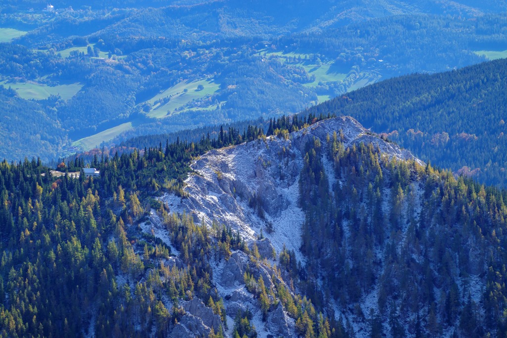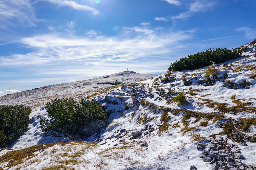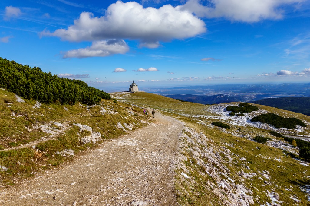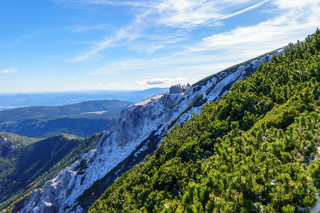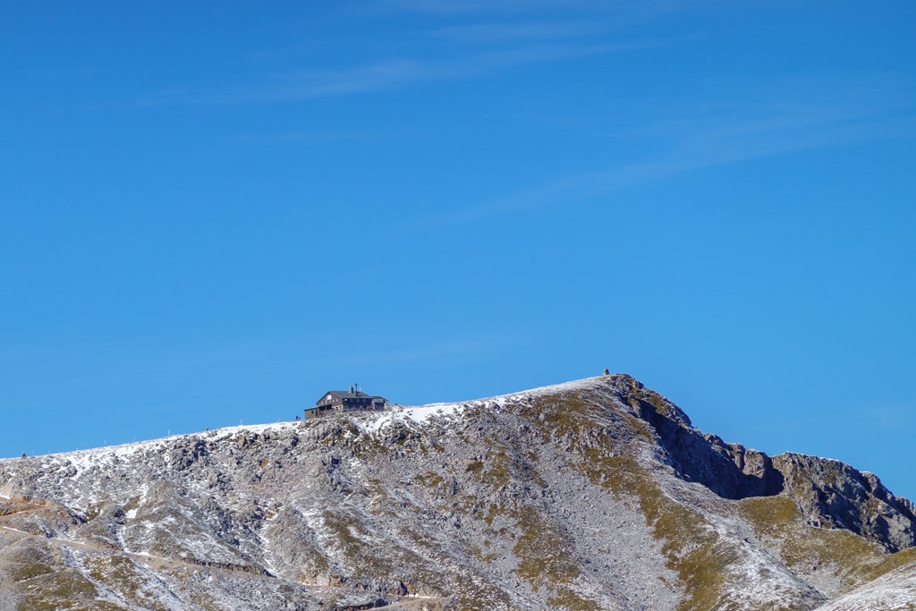 Tudniillik kissé meglep (szinte meghökkent), hogy amikor az autópályán szemben feltűnik a Schneeberg tisztán kivehető sziluettje, az vakítóan fehér. Ami olyan erősen visszaveri a napfényt, az bizony hó és jég! Na, erre azért nem számítottam! Máris alternatívákon gondolkodom, hisz télies körülmények közepette a Herminensteig egy egészen más kihívás. Majd elválik ha közelebbről látom. Addig is átfutom fejben a lehetőségeket. Mivel az idő tökéletes, visszavonulásra nincs okom, csak egy esetleges alternatív útvonal megválasztására.