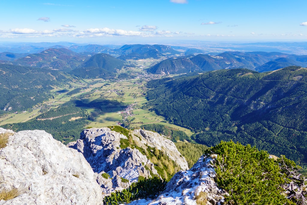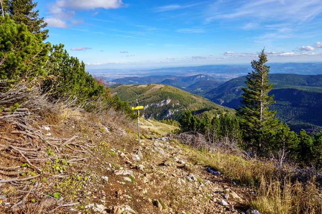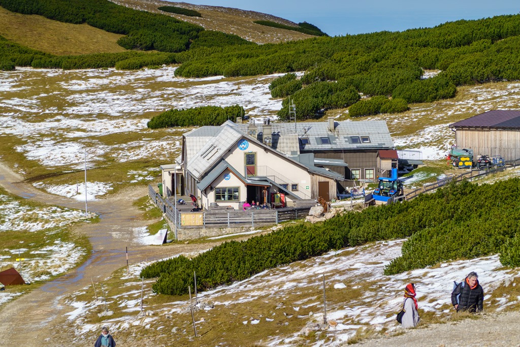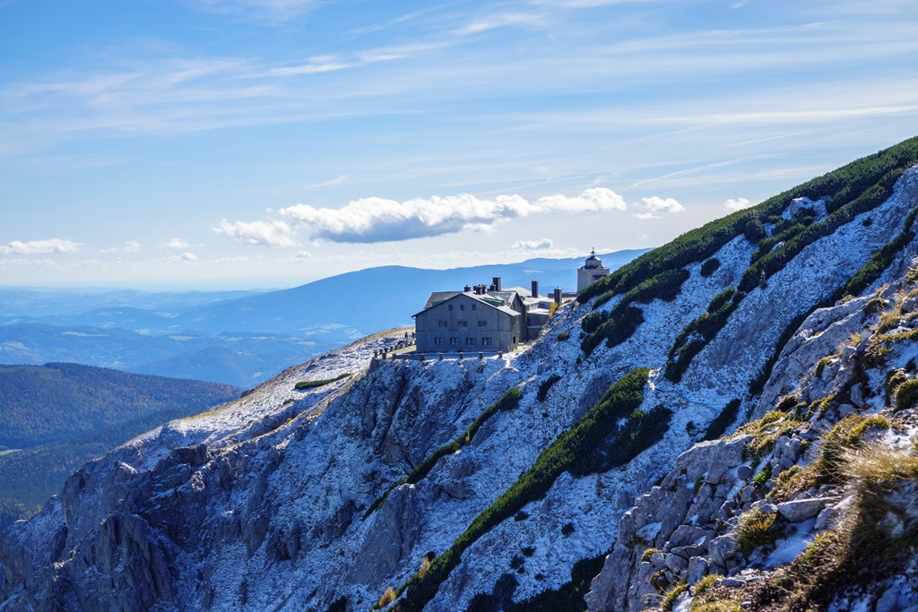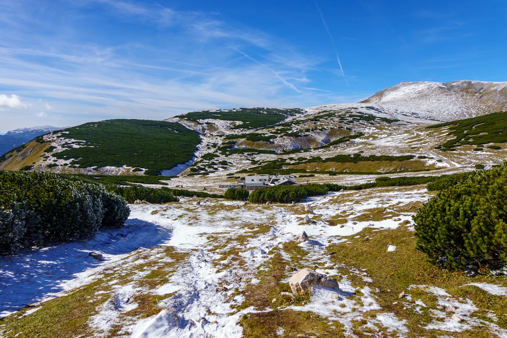 Tudniillik kissé meglep (szinte meghökkent), hogy amikor az autópályán szemben feltűnik a Schneeberg tisztán kivehető sziluettje, az vakítóan fehér. Ami olyan erősen visszaveri a napfényt, az bizony hó és jég! Na, erre azért nem számítottam! Máris alternatívákon gondolkodom, hisz télies körülmények közepette a Herminensteig egy egészen más kihívás. Majd elválik ha közelebbről látom. Addig is átfutom fejben a lehetőségeket. Mivel az idő tökéletes, visszavonulásra nincs okom, csak egy esetleges alternatív útvonal megválasztására.
