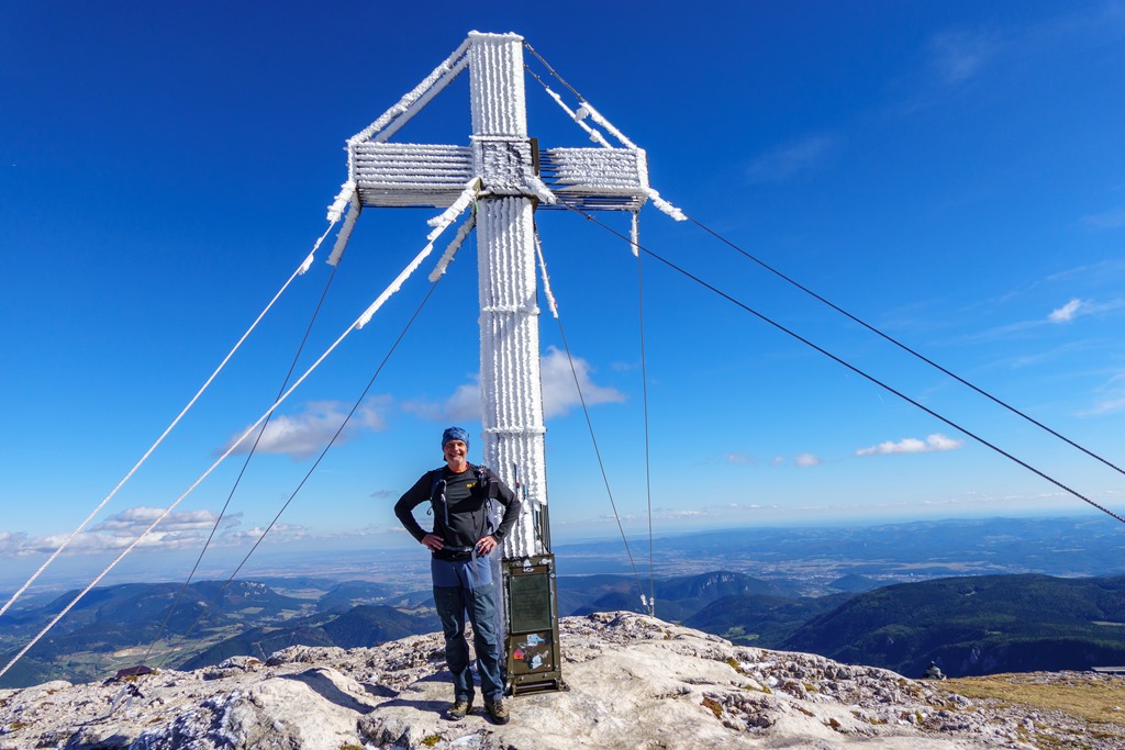 Háromnegyed egyre végzek a Herminensteiggel, ami cirka másfél órában adja meg a mászás időtartamát. Alig tíz perc elteltével már a zúzmarás csúcskeresztnél vagyok. A továbbiakban rendhagyóan a Damböckhausban ejtem meg déli pihenőmet (fenti és lenti képen). Szinte egészen pontosan 13:00 órára már le is huppanhatok odabenn, a kályha mellett, egy asztalnál.