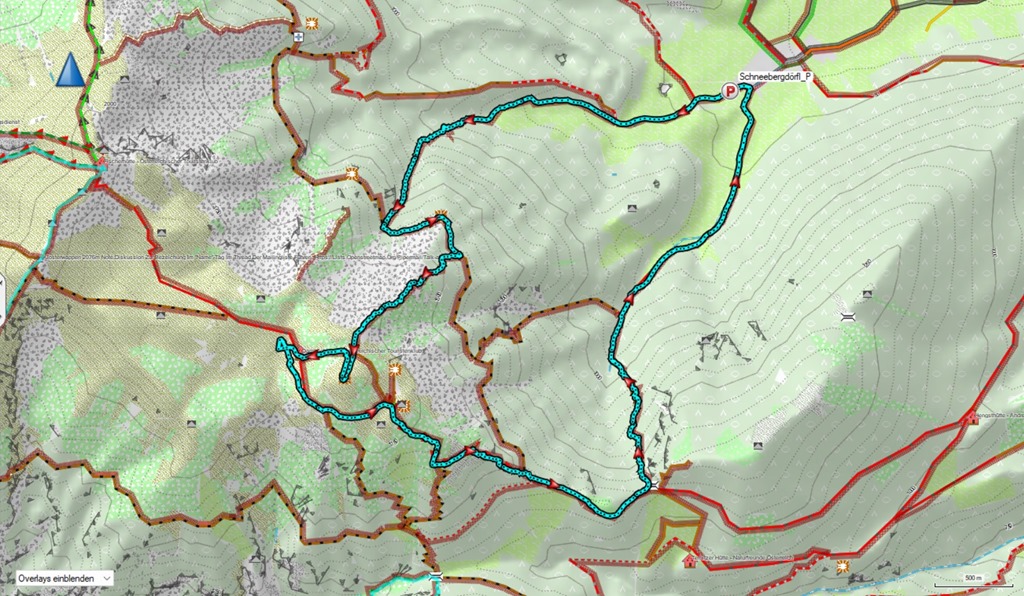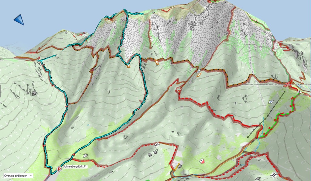 Mehetnék mondjuk a Hengst lábától a standard útvonalon a Szalamandra pályája mentén. Ez a teljesen gyáva variáns. Bátrabb forma, hogy felmászom a Grafensteig vonaláig és majd ott elválik, attól függően, hogy milyenek a viszonyok. Amennyiben túl sok lenne a hó, akkor még mindig folytathatom Baumgertnerig és onnan tovább fel a platóra.