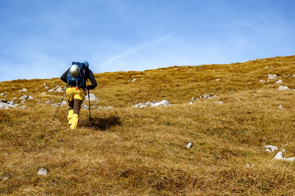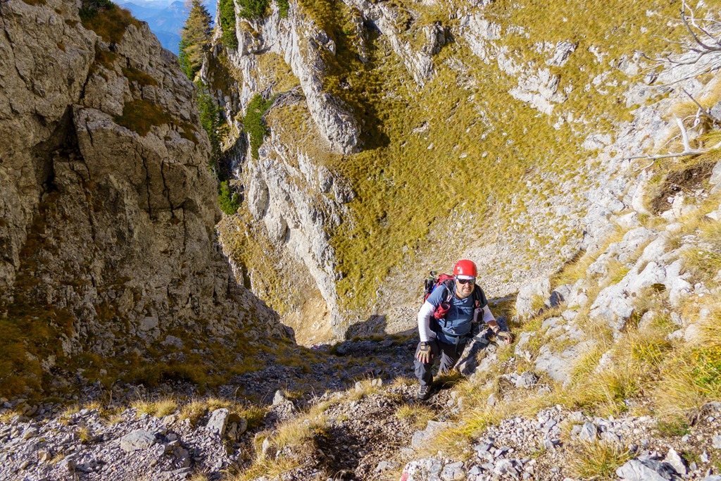Bő másfél óra alatt érkezünk a Rókalyuk beszállójához. Mivel a zergék odafenn pajkoskodnak, lökdösik lefelé a kavicsokat, nem árt óvatossági alapon, sisakot tenni a kobakunkra. A túrabotokat meg rendre elrakjuk. Igazi, élvezetes mászás jön 1-es majd a kulcsponton 2-es szinten. Onnan lehet tudni, hogy ez kettes, mert alaposan meg kell gondolni minden egyes fogást. Az egyes szint viszont általában nem szorul különösen körültekintő előkészítésre.