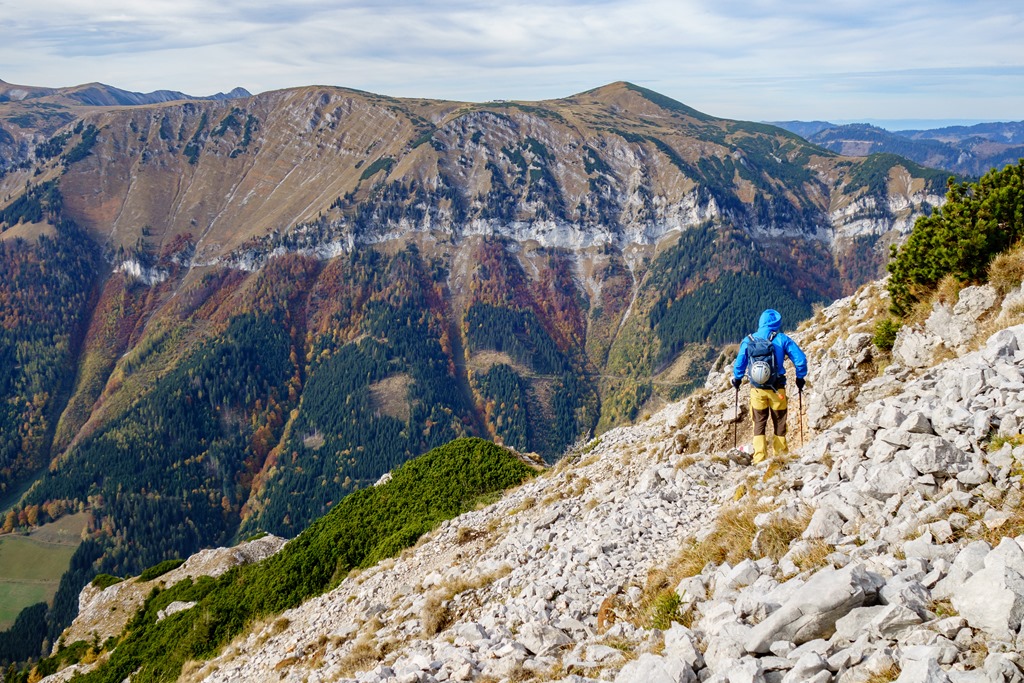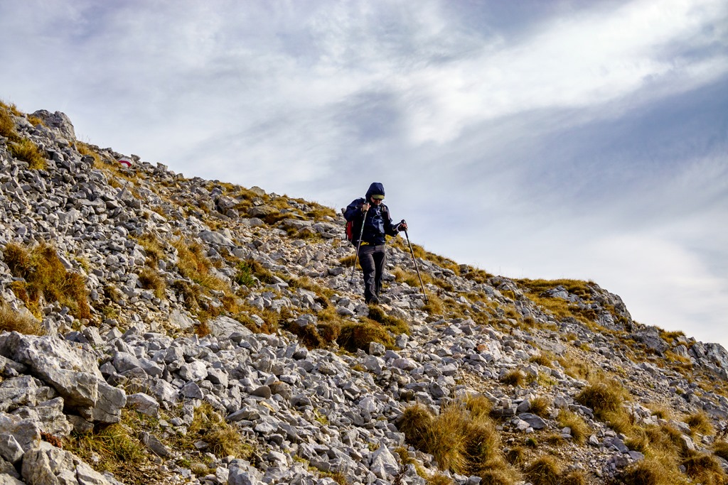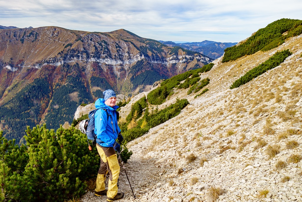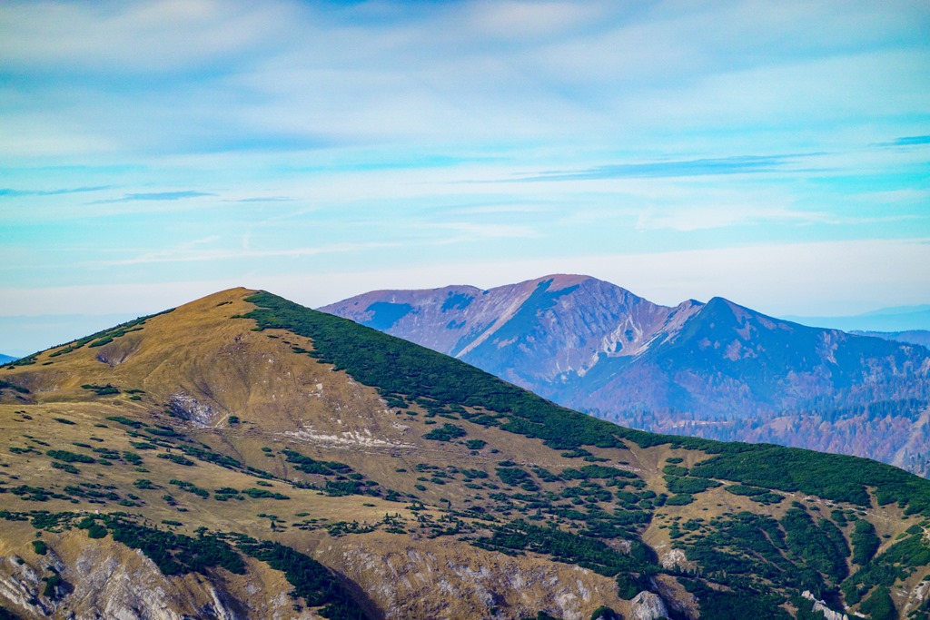 Ha a csúcson nem cibálna és nem próbálna minket döntögetni a heveskedő déli szél, akkor szinte ideális, melankóliás őszi időről beszélhetnénk. Szerencsére a széllöketek inkább csak az 1800 m szint feletti magasságokban tombolnak, lejjebb, helyenként még szélcsend is honol. Ritka ez a nagy különbség. Attila még nem ismeri a Nagy Rókalyukat, sem az Altenbergsteiget, így ez most annál is inkább természetes választás, mert napsütésben gazdag déli lejtőket vettem számba a mai napra.
