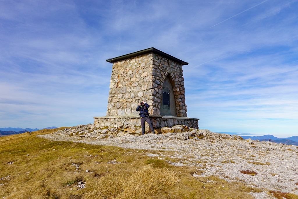 A csúcson állított emlékmű mögött van egy horpadás, amolyan gödör szerűség, mely valamelyest megvéd a legnagyobb szélrohamoktól, bár szélcsendről ott sem lehet beszélni. Mindenesetre legalább nyugodtan elő lehet venni valami kis itókát és majszolni a magunkkal hozottakból. Eredetileg a Moassa vendégfogadóban szeretnénk leöblíteni a túra terheit, de nem vagyunk benne biztosak, hogy vajon nyitva lesz-e. Elvileg igen, de miután október 26.-ával a Hüttek bezártak, felkészültünk az ellenkező eshetőségre is. Mindenesetre az Altenbergsteigen lefelé legalább másfél óra az út, amiből aztán kis híján kettő lesz.