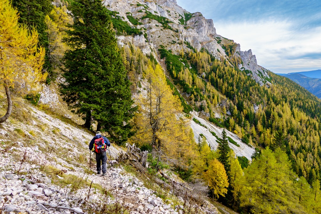 A Reißtalerhüttenél elhagyjuk azt a fő csapásvonalat, mely a népszerű Gretchensteig meg a Reistalersteig felé vezet. Elhaladunk a kunyhó alatt (fenti kép), majd a széles erdészeti útról hamarosan egy jobbra felfelé hajló keskeny ösvényre térünk. Hova tovább egyre jobban leszűkül az afféle “boka tördelő” csapásvonal keresztmetszete. Meglátszik, hogy a Großes Fuchloch (Nagy Rókalyuk) felé már jóval kevesebben vetődnek.