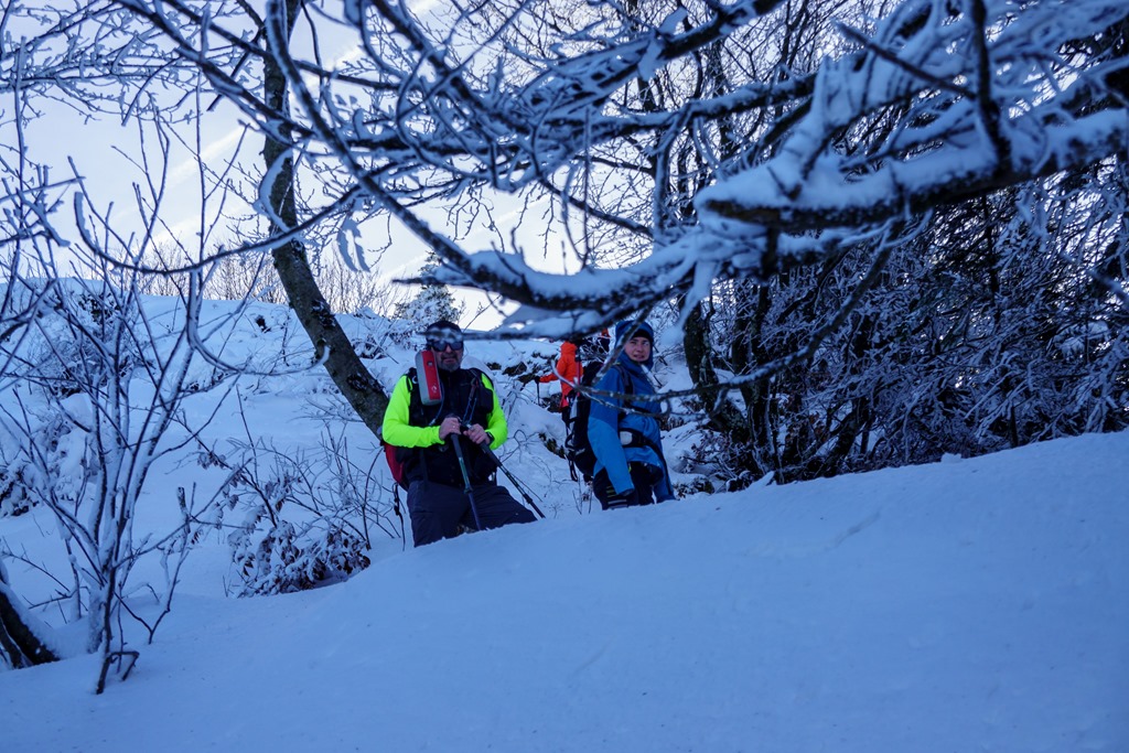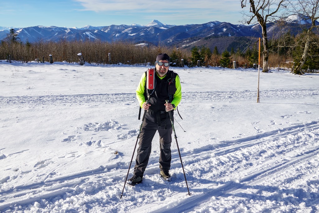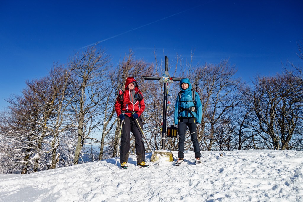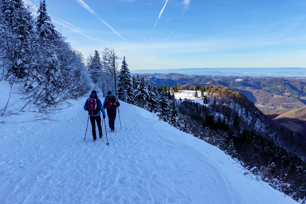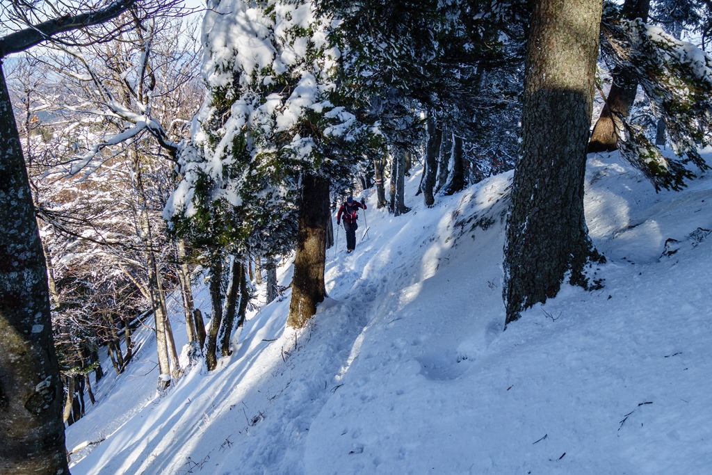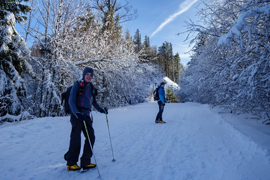 A továbbiakban újra kiérünk a Traisnerhüttehez vezető széles, hótorlaszokkal tarkított útra, amit kisvártatva, balkéz irányában ismét elhagyunk, hogy a hegy gerincén folytathassuk egészen a kunyhóig. A felettébb élénknek titulálható szél bizony tagadhatatlanul kemény téli élményben részesít, arra az esetre, hogyha még valamelyikünknek netán kétségei maradtak volna afelől, hogy ez itt most ténylegesen is a télről szól. Elkel bizony egy plusz réteg ruha, miközben a fejem még kapucni ellenére is hógolyóvá fagy.