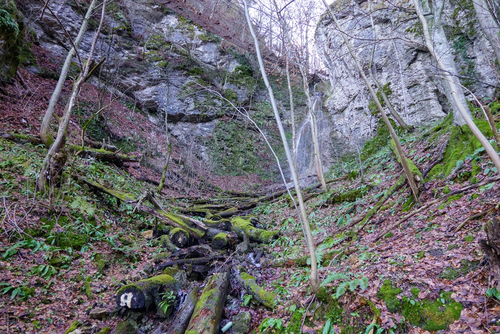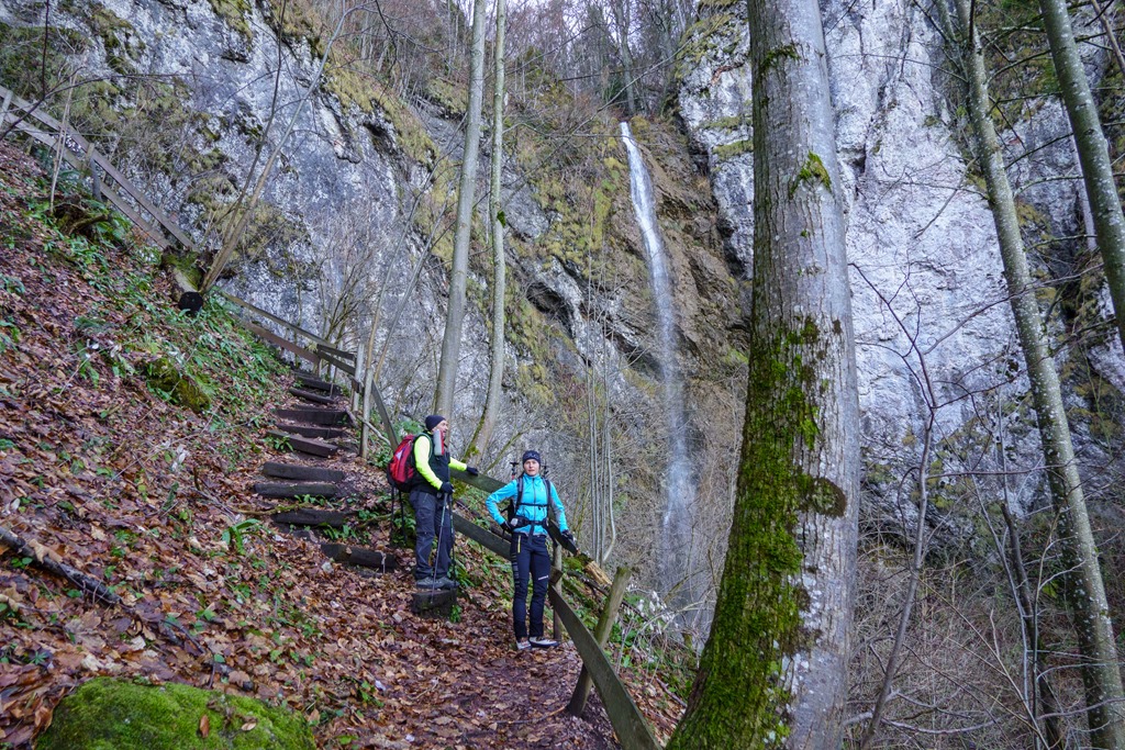 Hótalpakat akarva-akaratlanul az autó csomagtartójában hagyjuk, amikor 10:00 óra körül Cirmivel és Attilával nekilendülünk a Wasserfallwegnek (fenti kép). Amennyiben tartós a fagy, az itt lezúduló vízesések jégfallá merevednek és alkalmat adnak az arra felkészült sportolóknak a jégmászásra. Ilyenről ma szó sincs, a vízesések vidáman és akadálytalanul zúghatnak alá a magas sziklapárkányokról (lenti képek).