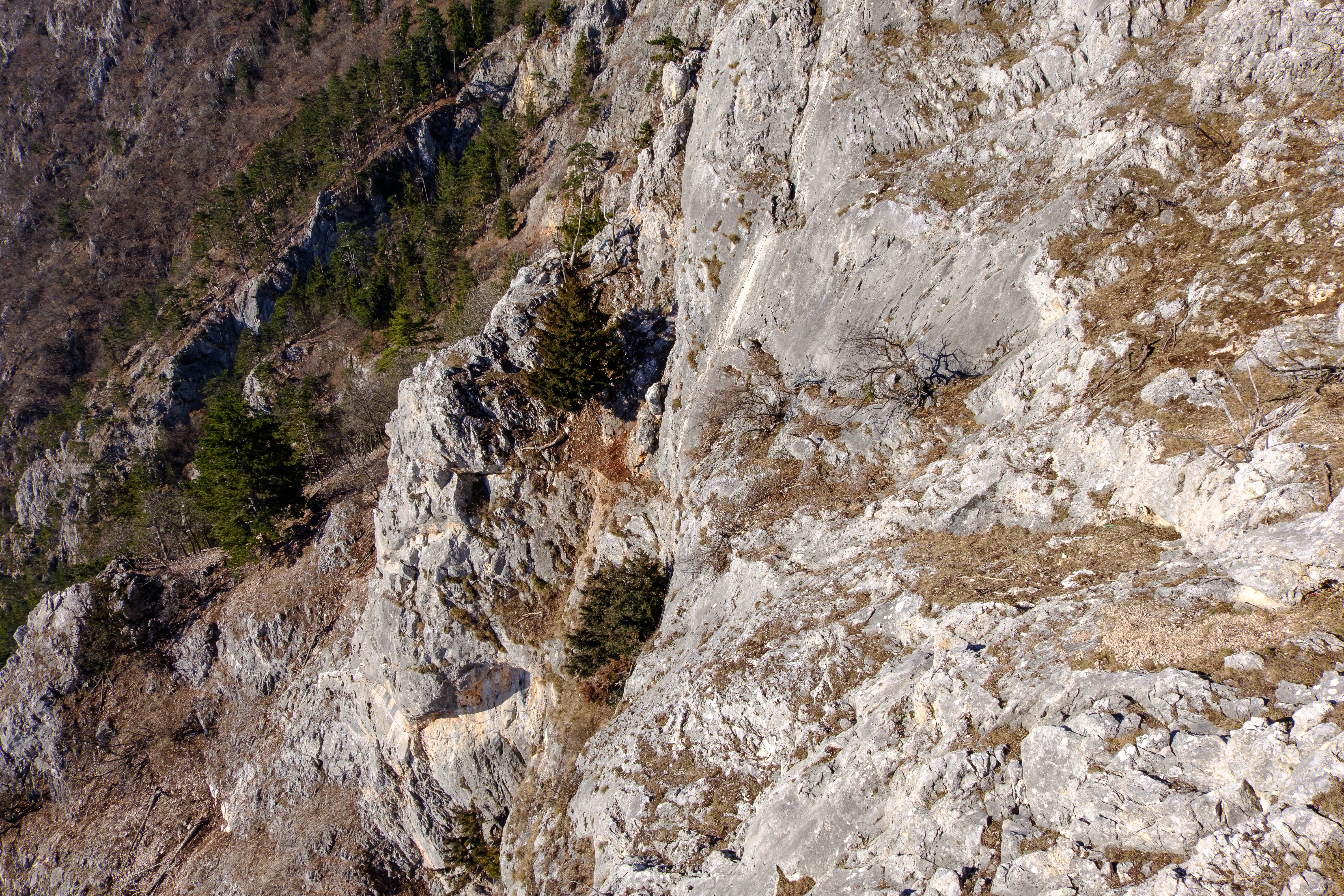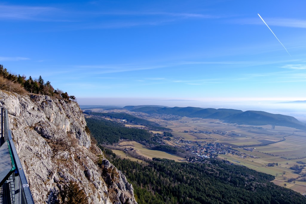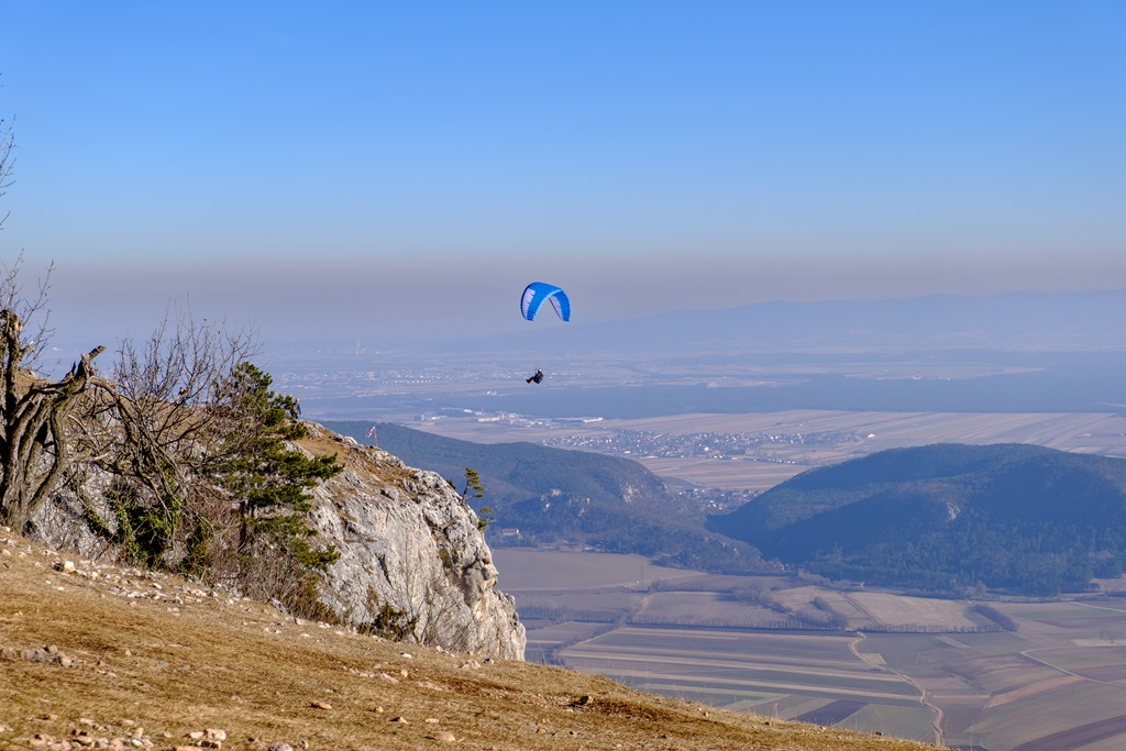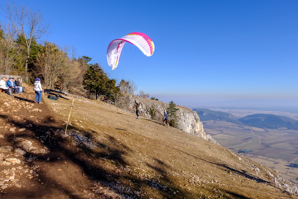 Visszaérkezve még egyszer kinézünk a napos platóra, ahonnan a siklóernyősök meg a sárkányrepülősök is indulnak. Figyelem, hogy a meleg nyári szezonnal ellentétben, most nem sikerül a már levegőben levőknek, jó, magasba lendítő légáramlatokat találniuk (ún. Termik). Valamennyien süllyednek lassan-lassan körözve, keresgélve. A nap melege még sajnos nem elég ahhoz, hogy felforrósodjon a Hohe Wand déli fala és megfelelő, felhajtóerőt produkáljon.