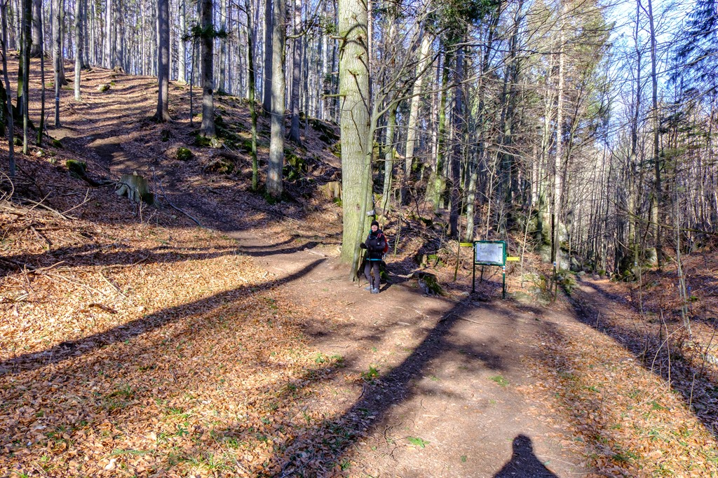 Folytatjuk tovább az Engelbertkirche felé, majd le a Saugrabenba, (ami egy árok, fenti képek) hogy aztán ott ahol a Große Kanzel vaslétrái invitálnának lefelé, rátérjünk a felfelé tekergő turistaútra, mely már aztán a Széncinke (Kohlmais/Kohlmeise) csúcson át a Waldeggerhaushoz visz. Indulástól számítva, nem sok híján 2:30 óránkba telik ide felérni.