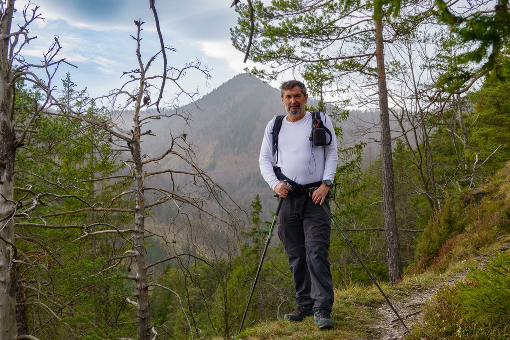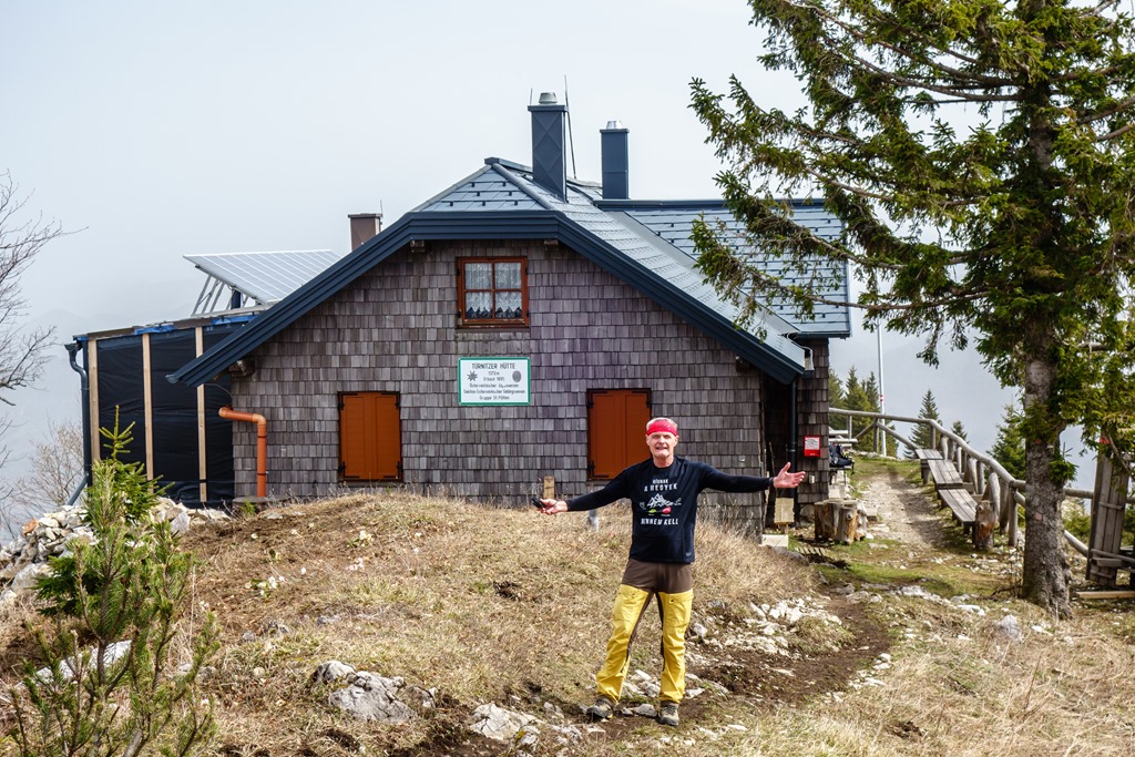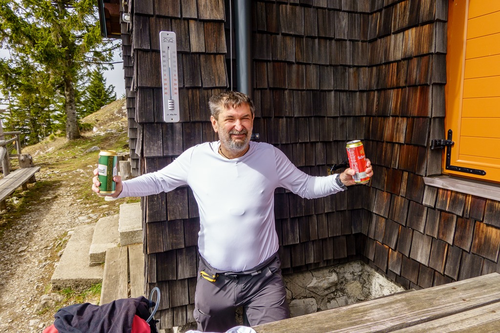 A sűrű, párás levegő miatt az Ötscher sajnos egyáltalán nem látható és a Schneebergnek is gyakorlatilag csak a sziluettje bukkan elő. A kunyhó melletti padokon, szélcsend és szűrt napsütés honol, letelepszünk hát egy szusszanásra, elfogyasztani megérdemelt elektrolit italainkat.