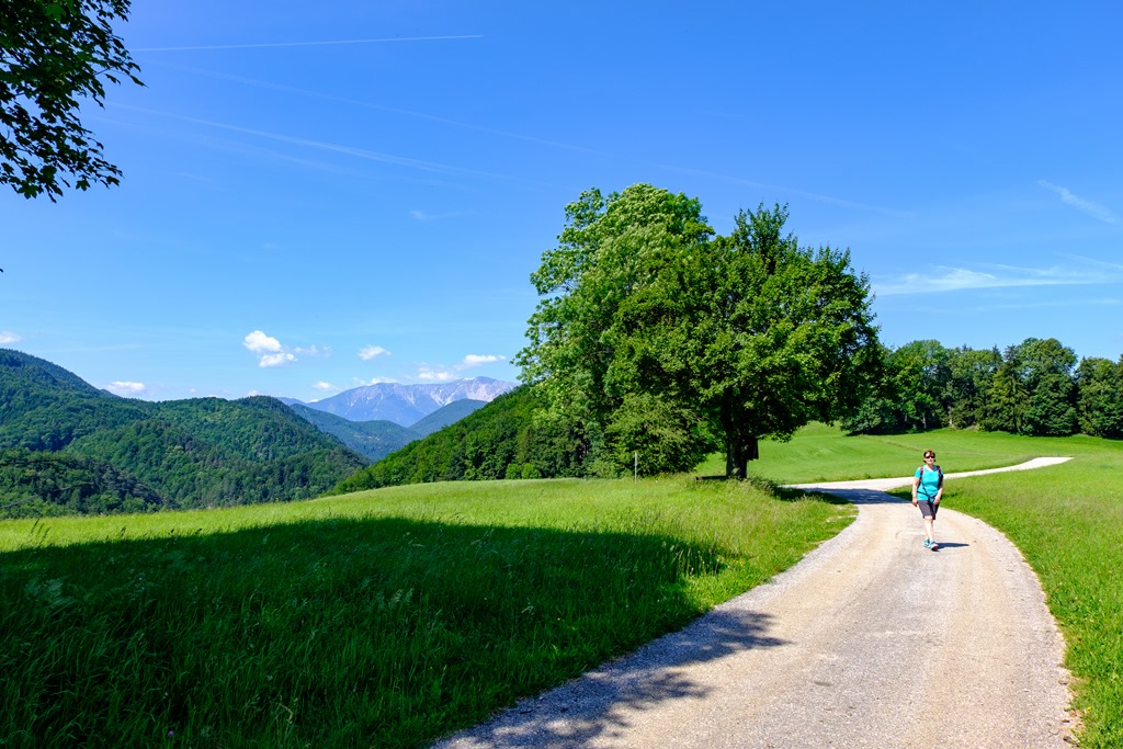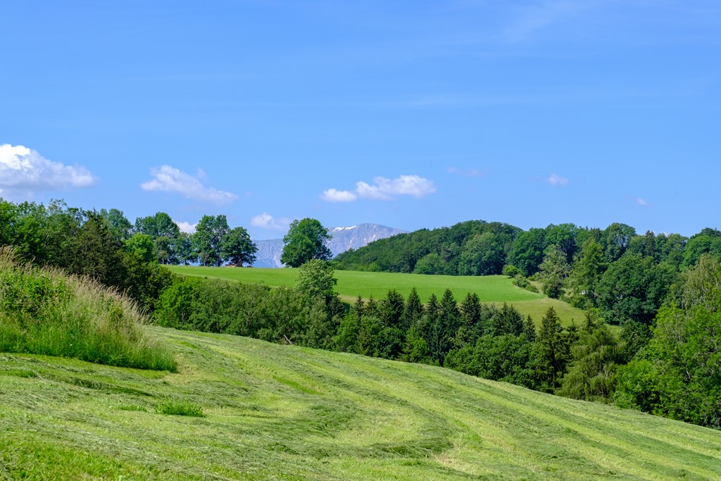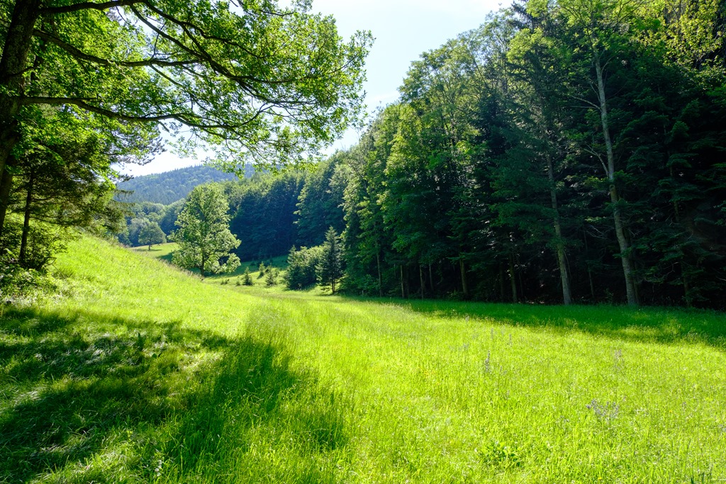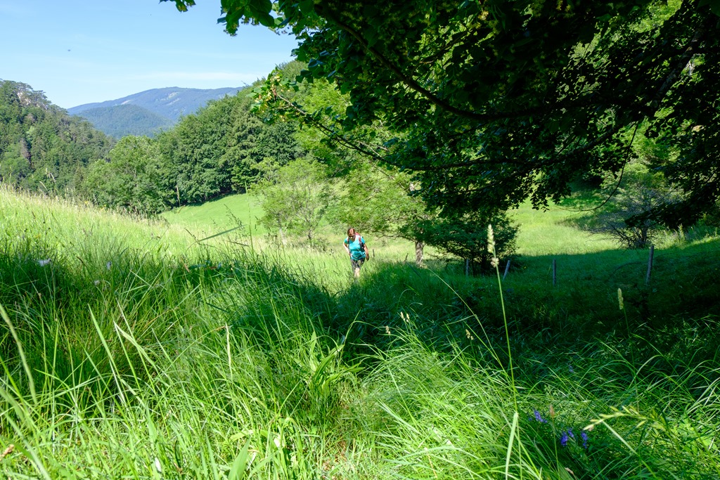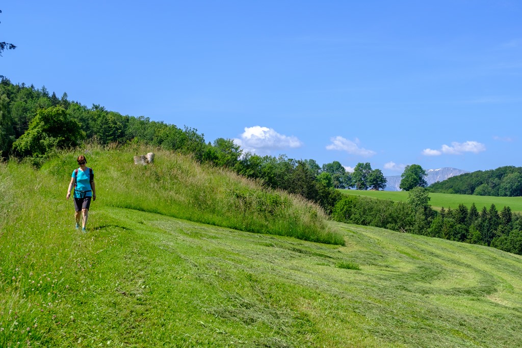 Jöhet a panorámaút, ami egy harmatos kaszálómezőn át visz (fenti képek). Az út folytatását itt nehézkes meglelni, mert nem sokan használhatják, bár úgymond minden út Rómába vezet alapon, egyszerűen csak a mező magasabban fekvő túloldala felé kell haladni, mindegy hogyan és miként alapon. A „panorámaság” pedig abban rejlik, hogy fordított irányban, azaz nyugat/délnyugati irányba tekintve, mi más, mint a Schneeberg köszön vissza.