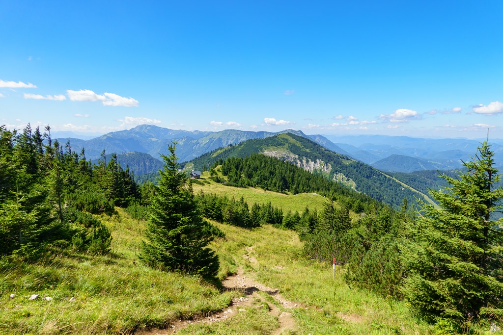 A távolban (jobrról balra) a Scheibe, Scheiblingstein és Bärenleitenkogel hegykoszorúja, illetve a Dürrenstein 1878m (egy majdani cél, már legalább 6 éve tervezem a megmászását)