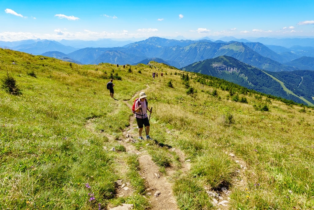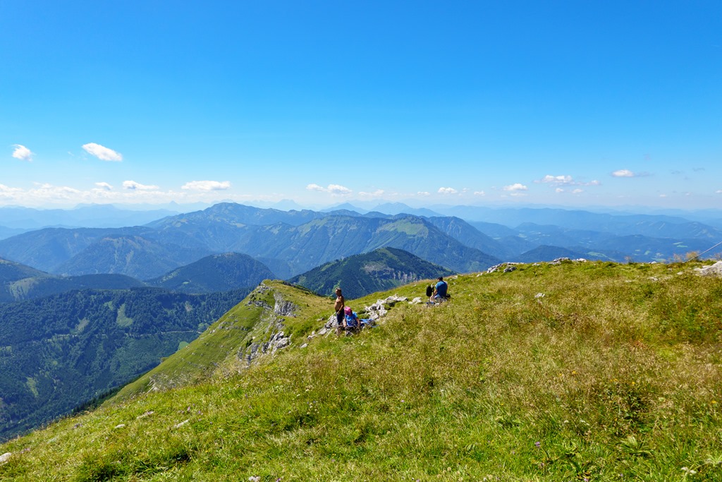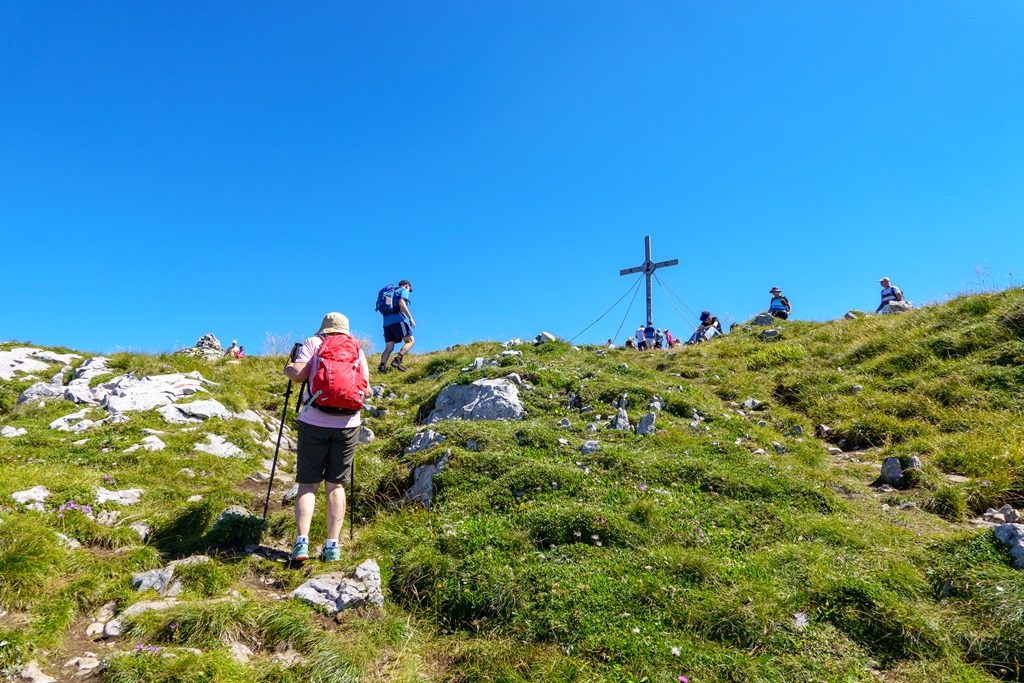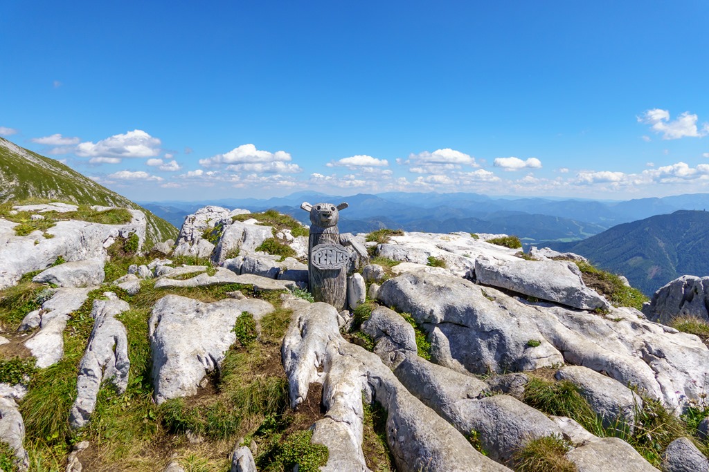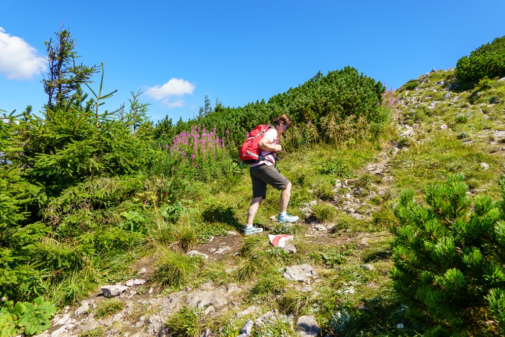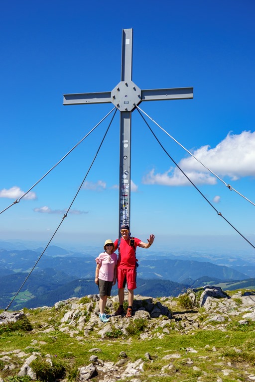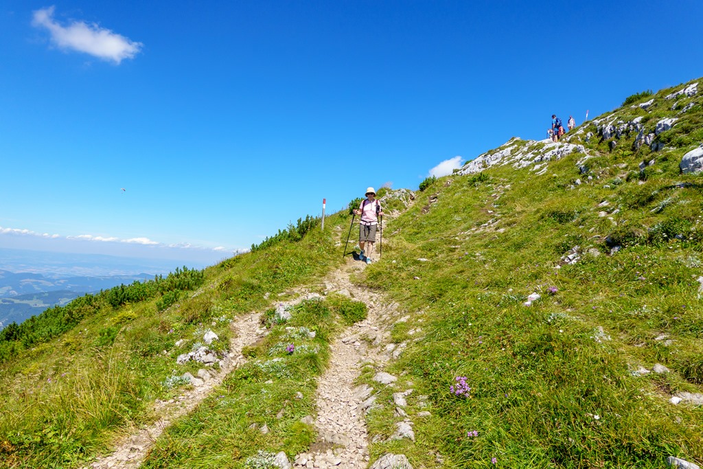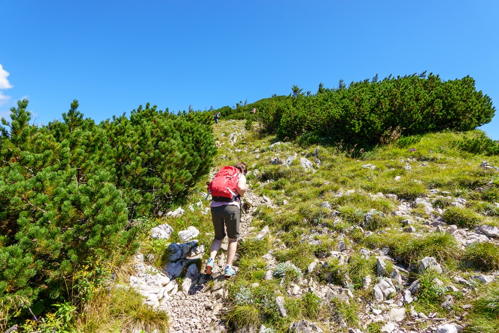 Első célunk a Nagy Ötscher csúcsa. Na, nem egészen lentről, hanem kényelmesen a kétüléses libegő 1418 méteren fekvő hegyi állomásából indulva. Eleinte még árnyékos részek is segítik valamelyest enyhíteni a nap hevét, de később, egészen a csúcsig, törpefenyős, magashegyi környezetben pirít a nap. A túra, önmagában, a helyenként sziklás, murvás talaj ellenére, még Angikának sem jelentene különösebb kihívást, hacsak nincs a tikkasztó hőség ami azért megteszi a magáét. Szerencsére a hegyek „léghűtése” aktiválva van, így a szinte folyamatos légmozgásnak köszönhetően a meleg elég jól elviselhető.