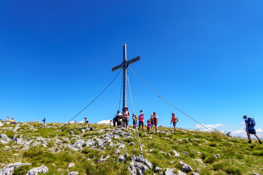 Vasárnap lévén, a látogatók száma is nagyobb. Érkeznek kicsik és nagyok, óvodák, apróságokkal, hátizsák-kosárban. A hivatalosan megjelölt papírforma másfél órában szabja meg az út hosszát. Mi nagyon laza, “bámészkodós” tempót nyomva is 1:45 alatt érjük el a csúcskeresztet. Az ilyenkor kötelező fényképek elkészítése után még leheveredünk a fűbe, és egyszerűen csak élvezzük a panorámát. Csodás!