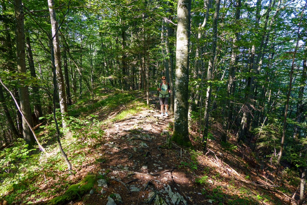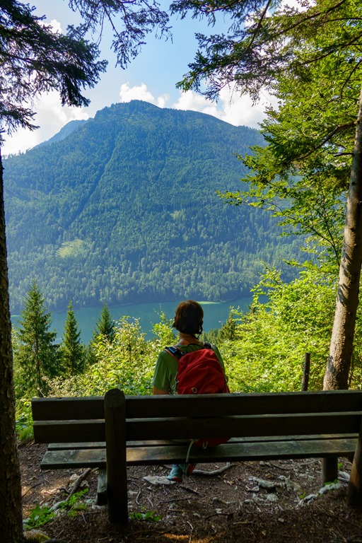 A tó mellett a látogatóknak fenntartott nagy parkolóból indulunk, mégpedig úgy, hogy először árnyékos erdők alján, de jó meredeken, felkaptatunk a tavat északról keretező Steinbauernbergre. Később kidudorodik előttünk a hegy elég szűkre szabott, fagyökerekkel gazdagon tűzdelt gerince (lenti kép). Kilátás a tóra az erdő fái miatt egyetlen helyen van, ezt ki is aknázzuk (fenti képek).