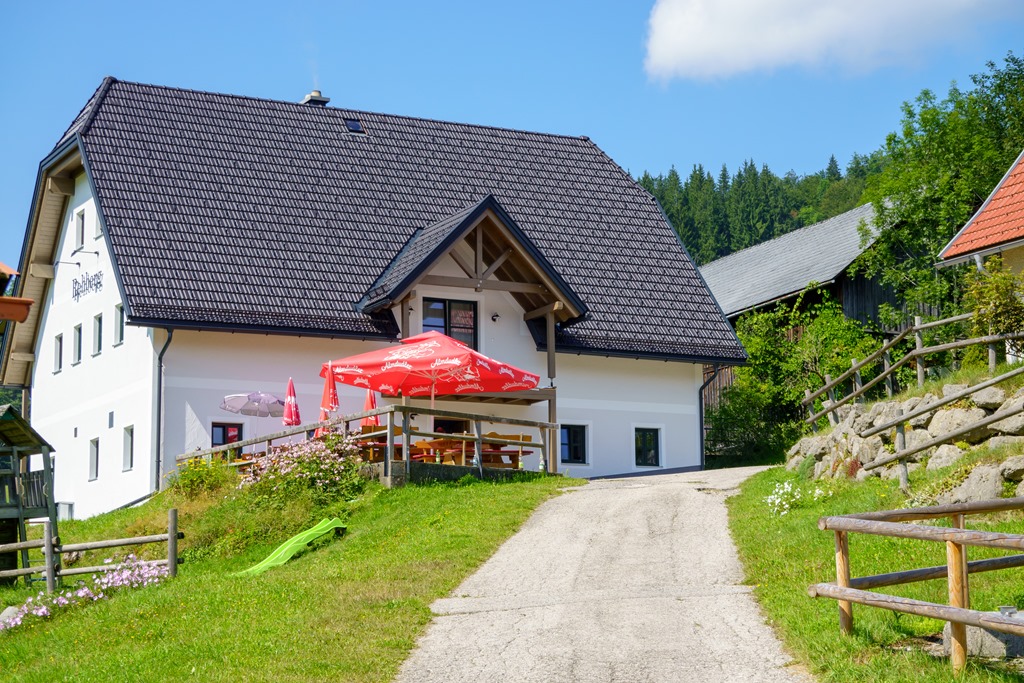 Hamarosan ereszkedőre fogja az út és elérjük a Rehberg-kunyhót (lenti képen), ahol a tikkasztó időjárással szinkronban, pótoljuk az elvesztett elektrolitokat. Ebéd még azonban korai, és így folytatjuk a megtervezett úton immár lefelé menetben a Seehof-kastélyszálló felé.