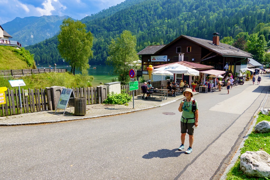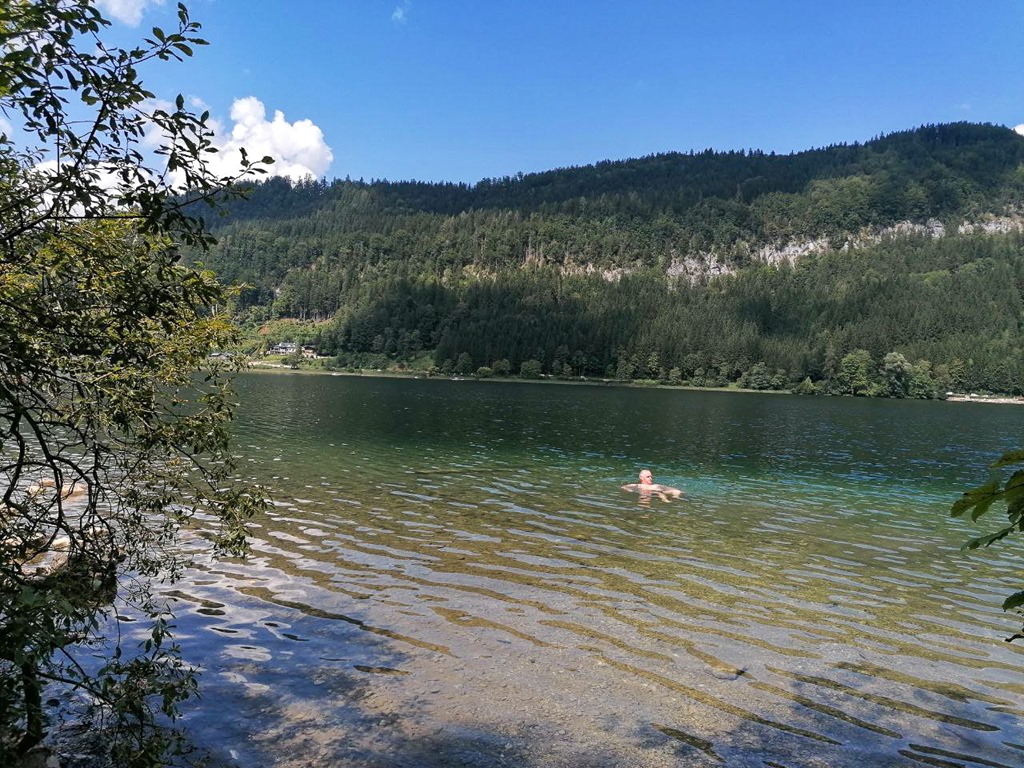A Seehof fogadó után (fenti képen), egy jó darabon napsütésben, majd ismét erdőben haladhatunk. Az út gyakorlatilag vagy 20-30 méterrel a tó tükre felett fut, és a meredek lejtőkön szinte lehetetlen leereszkedni a vízhez. Aztán hirtelen elérkezünk egy olyan pontra, ahol az út szalagja érinti a víz szintjét. Nosza bene, neked felfrissülés! Mindjárt belevetem magam a csodás tóba. Ki sem akaródzik jönni onnan, mert olyan fantasztikusan simogat a víz.