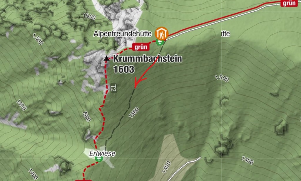 Visszafelé próbálom kikerülni a meredek ereszkedést, mert elvileg létezik egy a csúcsot elkerülő bekötőút (lásd a lenti térképen), ami a túloldali Alpenfreundehütte szintjén indul. A gond, hogy vissza kell fordulnom, mert az út a kidőlt fák miatt teljesen járhatatlan. Egy vándor, akivel szóba elegyedek a csúcson, hasonló állapotokról számol be az Alpleck felöli lejtőkön. Az is járhatatlan
