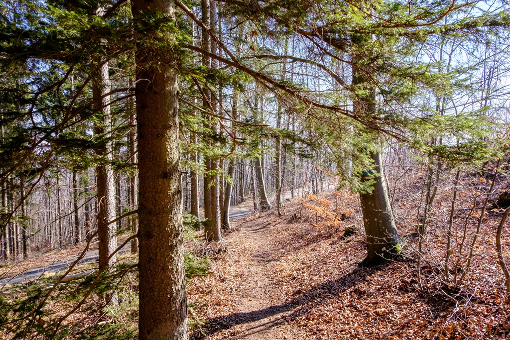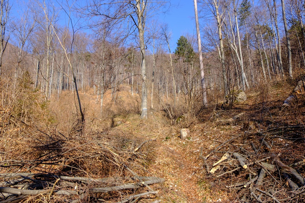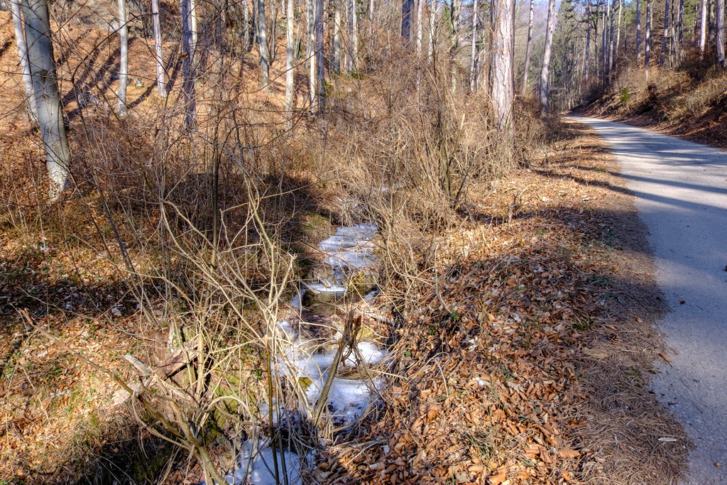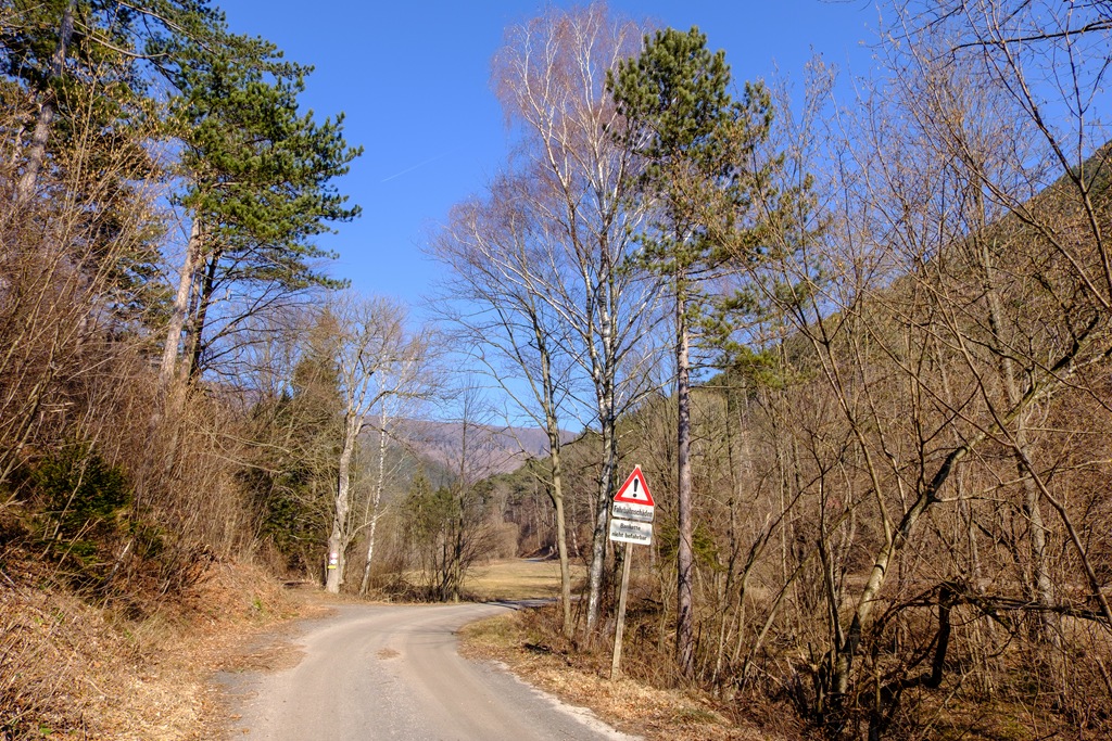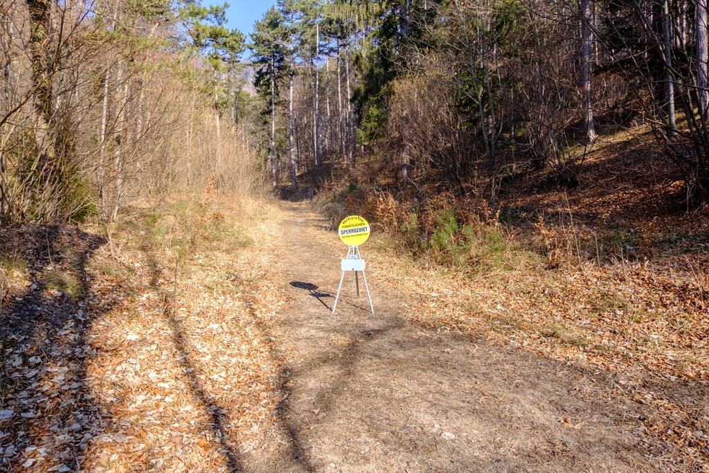 Választásom azért is esett erre a bizonyos Krenn-Wegre, mert déli oldal, hadd süssön csak jól rám a nap. Nyáron, az északi oldalról közelítve ajánlott, mert árnyékosabb. Kis bonyodalom, hogy az erdészet a jól ismert sárga táblájával tiltaná belépésem (lenti képen), ami meglep, mert akkor most merre és hová menjek? A határidőket nem feltüntető tiltás elhelyezése viszont egyértelműen illegális, mert korlátozás nélkül, állandó jelleggel, törvényt sért. Figyelmen kívül hagyom tehát, majd óvatos leszek. Láncfűrész meg ilyesmi hangját nem hallani. A terep állapota alapján úgy tűnik, az elmúlt napokban már éppen végezhettek a munkálatokkal. Kisebb-nagyobb ágak hevernek még az úton, de ezek nem jelentenek különösebb akadályt.