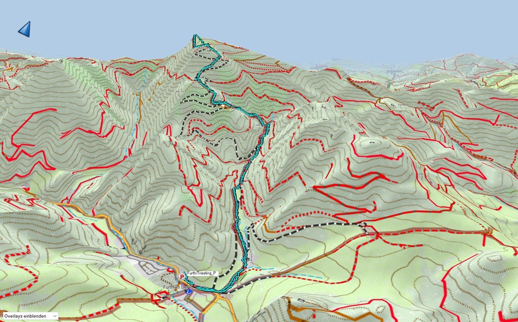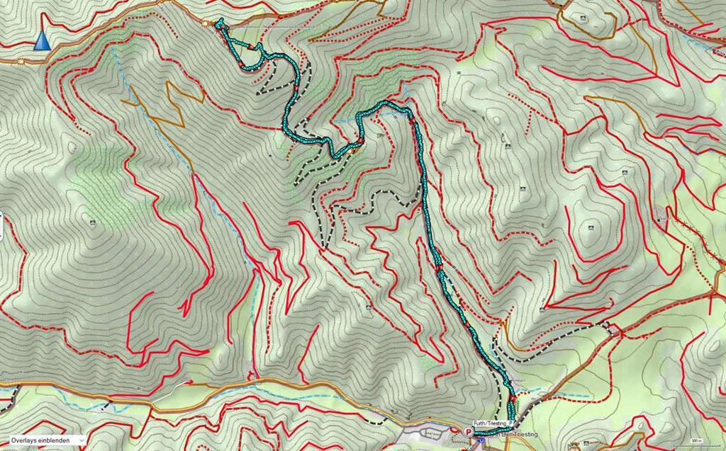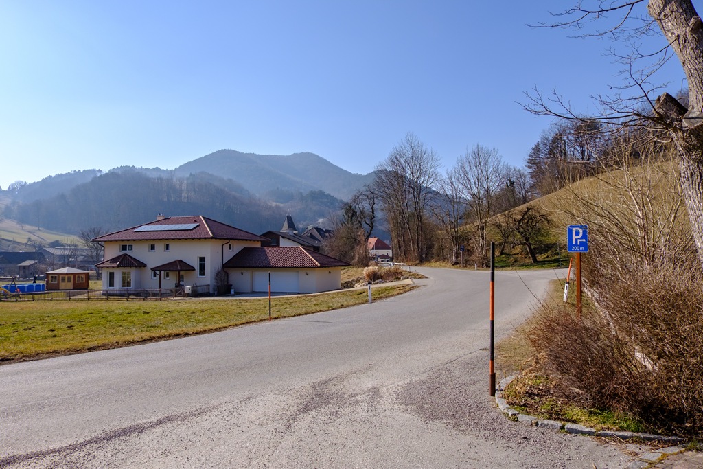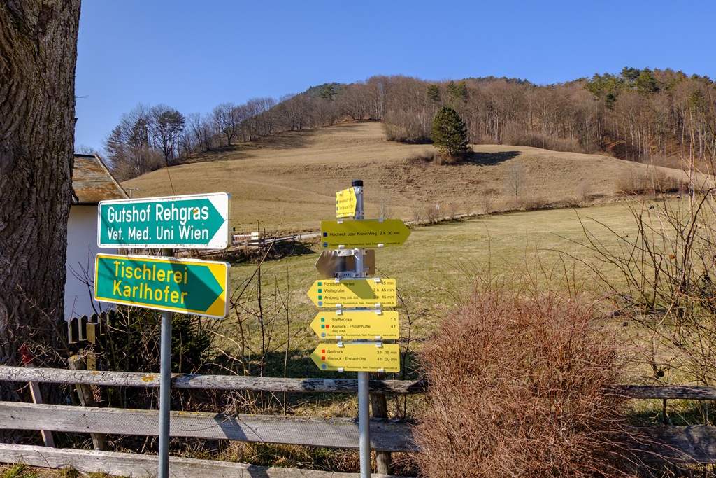 A lehető legrövidebb úton, Furth an der Triestingből, a Krenn-Wegen szeretném elérni a csúcsot, mely tetején a Meyringer kilátó található. Egy tábla odalenn 2:30 órás úttal riogat, amit kissé felfújtnak tartok, ám nem lehet tudni, ki, milyen indokkal nyújt ilyen félrevezető útmutatót. Jómagam, még visszafogott tempóban is, legfeljebb másfél órával számolok, ami egészen pontosan be is igazolódik.