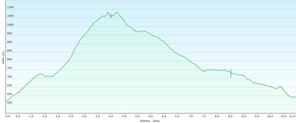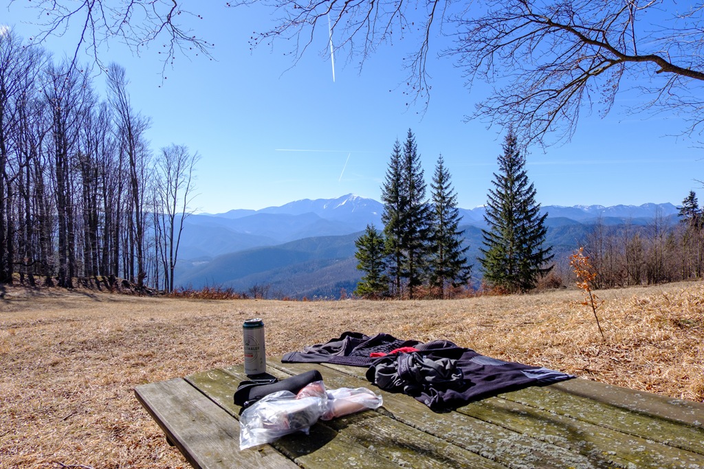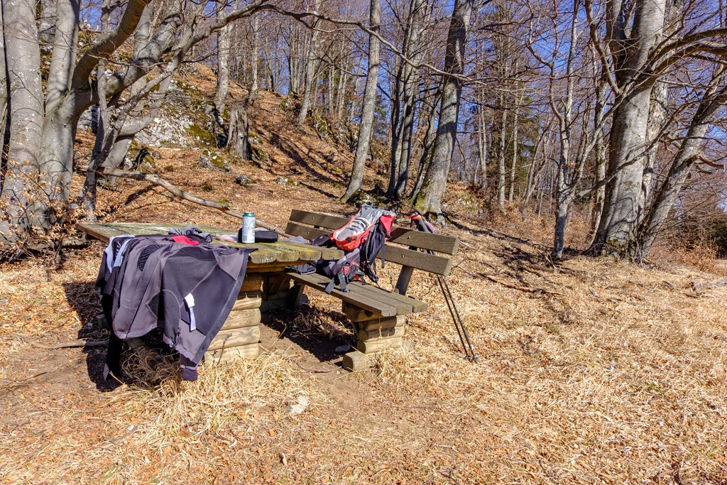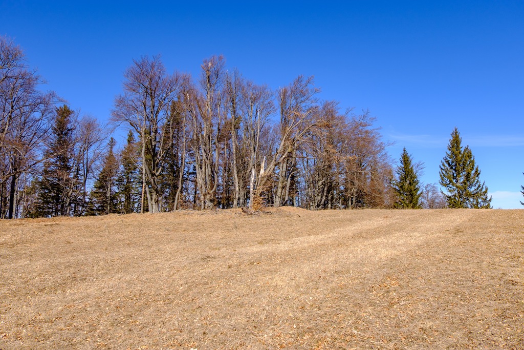 Utam első része egy direkt kaptató az Almesbrunnbergre, amit szegről-végről 1:20 óra alatt érek el. A hegy gyakorlatilag szelíd felépítésű. Egy hatalmas nagy lapos rét (kaszáló, fenti képen) fogad odafenn, ám maga a csúcs, még fák mögött egy szinte oda nem illő sziklás felépítményen található. Fatörzsre szögezett kereszt jelzi az elért 1079 méteres tengerszint feletti magasságot. Csúcs-szemle után visszaereszkedem a mező szintjére, ahol két padot is találok, asztallal egyetemben. Mi a szösz! Erről sem tudtam.