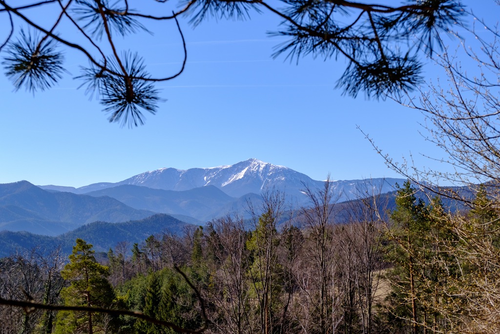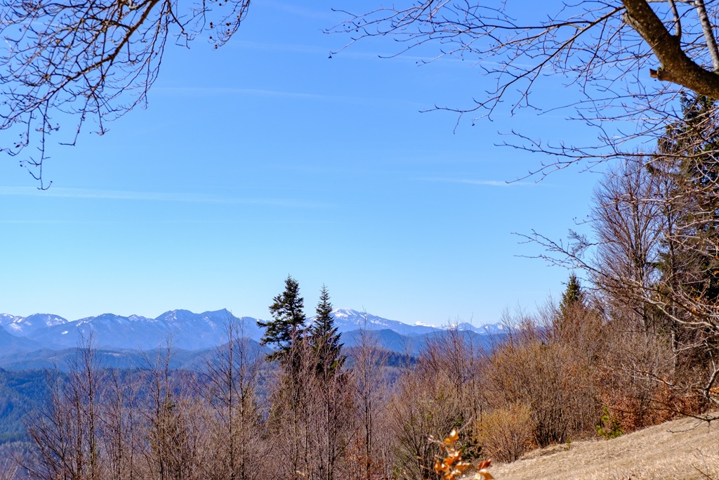 A távolban a kép közepén a Göller fehérlik, kissé balra a fenyőktől, pedig a Gippel, jellegzetes formájáról ismerhető fel