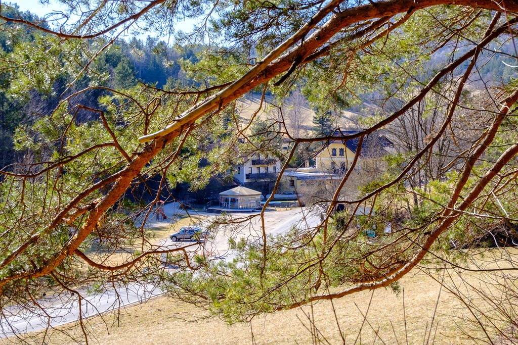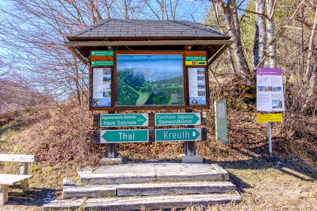 Remek, koratavaszi idő ígérkezik, ragyogó napsütéssel, felhőtlen kék éggel. Ez kedvemre való. A Myrafälle (vízesések) felső szintjéről, a Karnerwirt vendégház tőszomszédságából indulok. Megjegyzendő, hogy a hóban szegény tél miatt, a Myra-patak alig-alig vezet vizet, így a vízesések sincsenek jól táplálva most (ha egyáltalán).