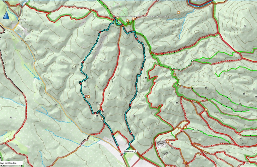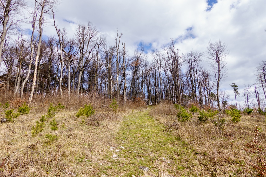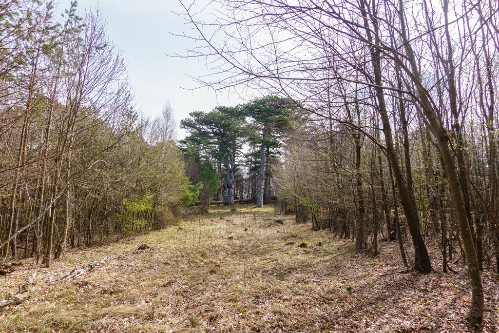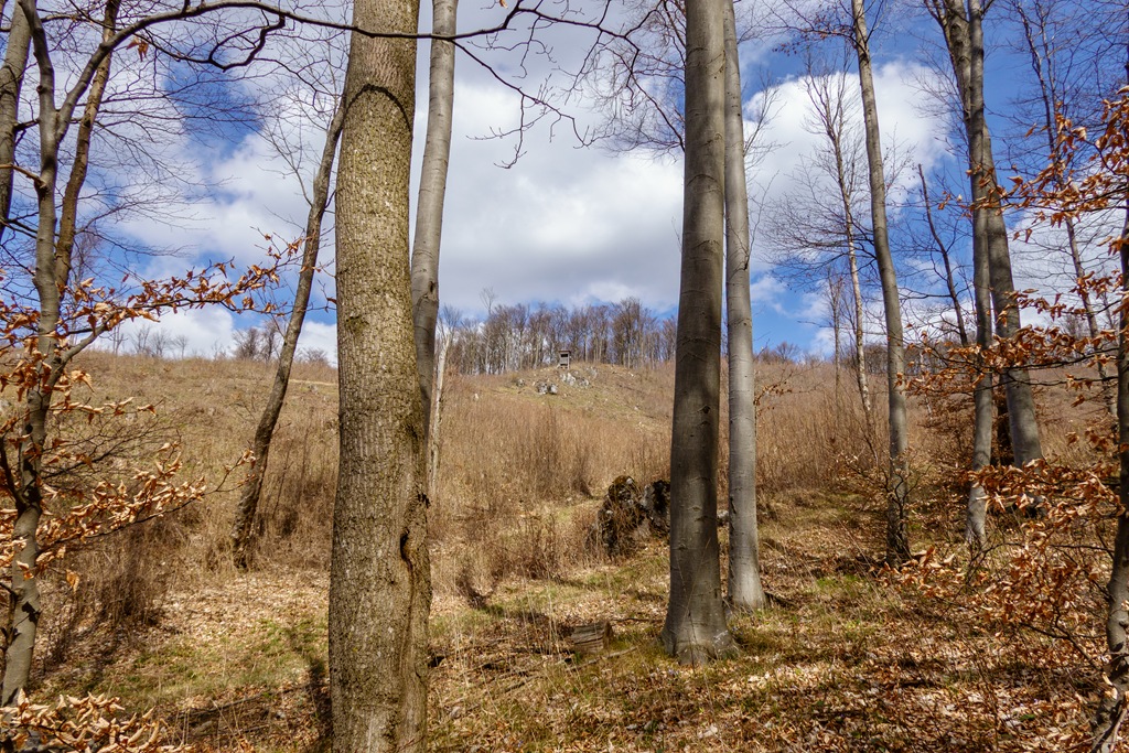 A feljutást kissé színesítendő, egy számomra még teljesen új, jelöletlen ösvényt szemelek ki magamnak. Merkenstein vára alatt elhaladva Merkenstein „rettenetesen magas” 572 méteres dombja felé fordulok, ami ugyan már nem új, ám ezen szakasz végéből válik le aztán ama jelöletlen ösvényem. A szakasz érdekessége, hogy a középkori vár külső, kőből rakott védvonala mentén, majd azon át vezet (lenti képen). Legalábbis én úgy gondolom, hogy a várhoz tartozó maradványokról van szó. Elég nagy területet kerít be, amit laikus szemmel tekintve, betolakodókkal szemben, nem biztos, hogy egyszerűen lehetett védeni.