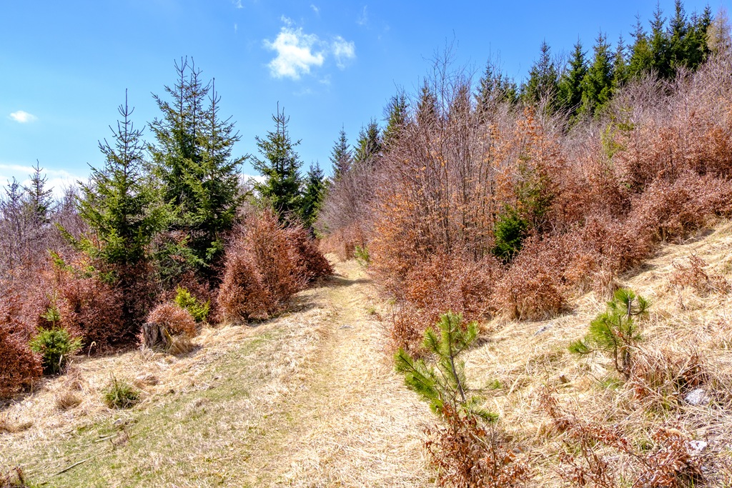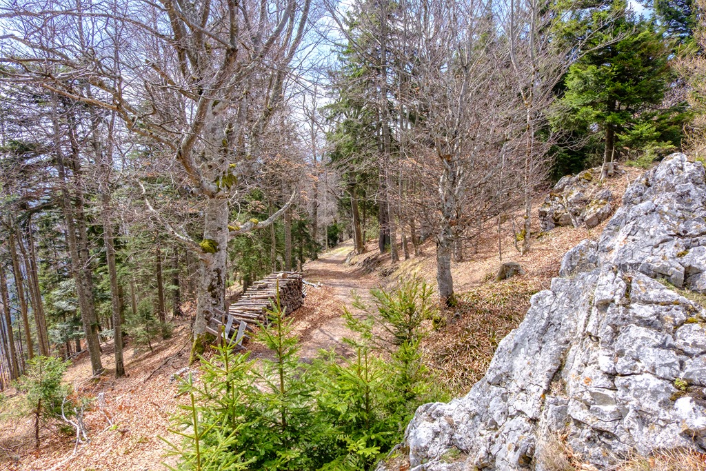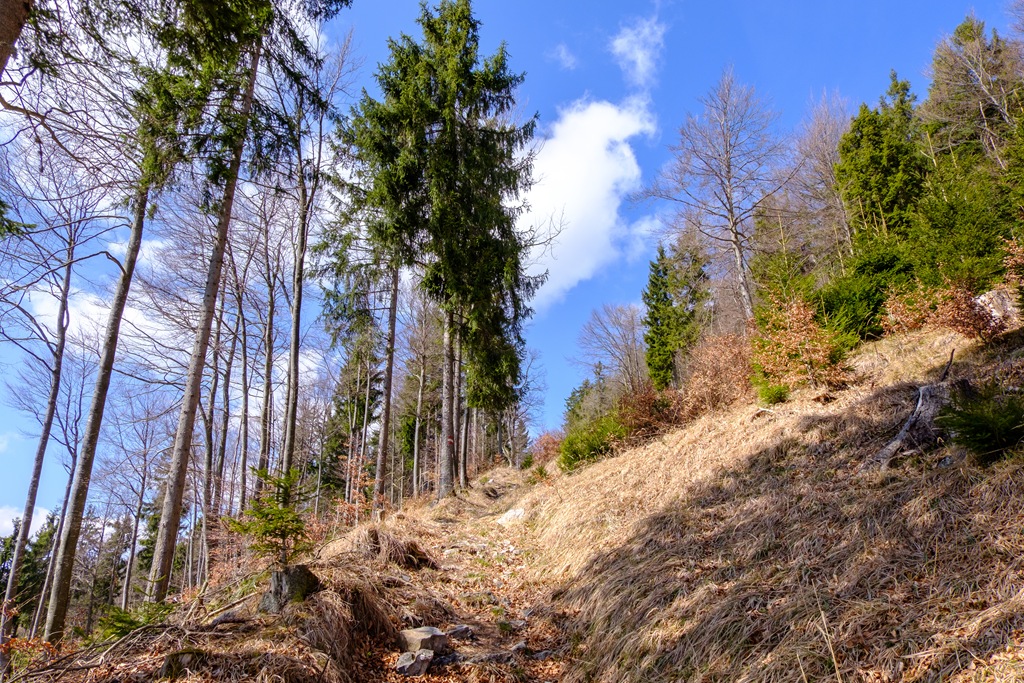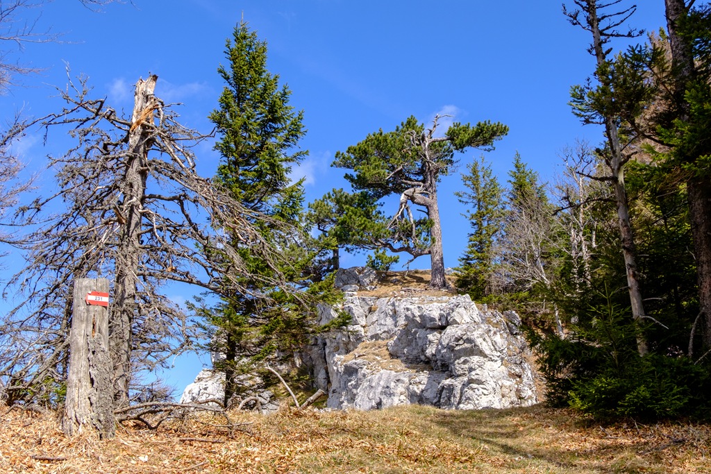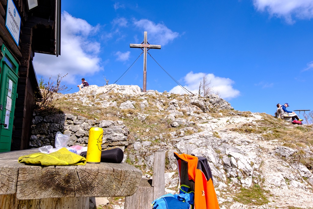 Cirka 2:10 óra alatt érem el aznapi célomat. Odafenn egy asztalon kirakom a magammal hozottakat és elverem éhemet-szomjamat (fenti képek). Mintegy félórás pihenőm után folytatom a hegy szép gerincén a Katherinenschlag (1222m) felé. Tavaly sikerült megtalálnom a kicsiny csúcskeresztet is, most viszont nincs hozzá valahogy humorom. Egyszerűen elbandukolok a púp-csúcs mellett a turistaúton.