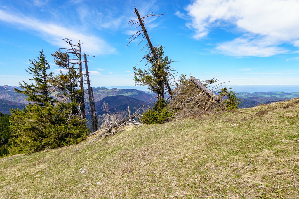 A kikelet még fiatal és a friss zöld éppen hogy csak elkezdett sarjadni, így a tájat még túlkiabálja az őszi, elszáradt avar barna színvilága. Felfelé a jól bevált kaptatót választom, ami egyenesen a csúcsra visz. Odafenn aztán folytatom tovább a szép kilátást biztosító gerincen, nyugati rányban. Később, keresek magamnak egy széltől némileg védett kis zugot (fenti képen), ahol elfogyaszthatom a magammal hozott déli elemózsiám.