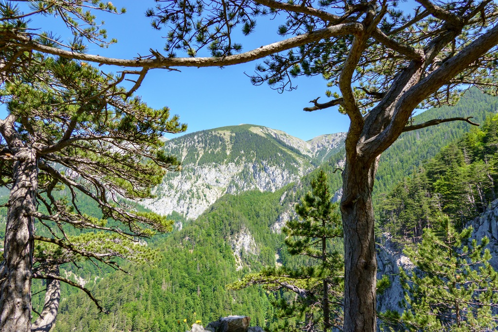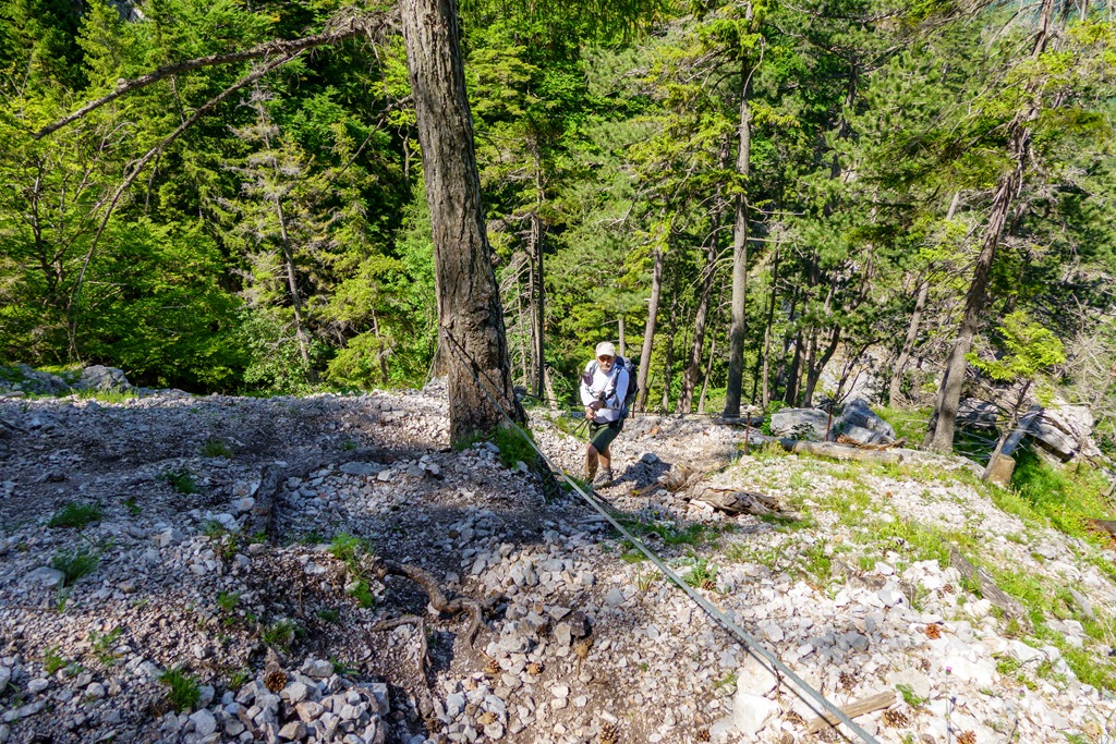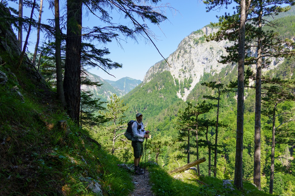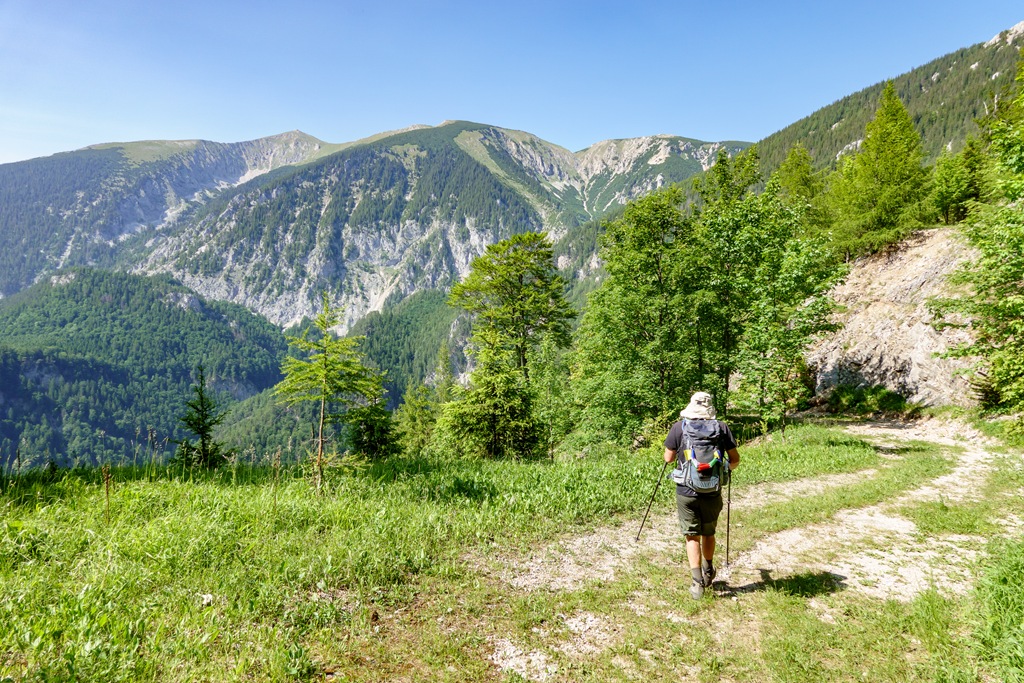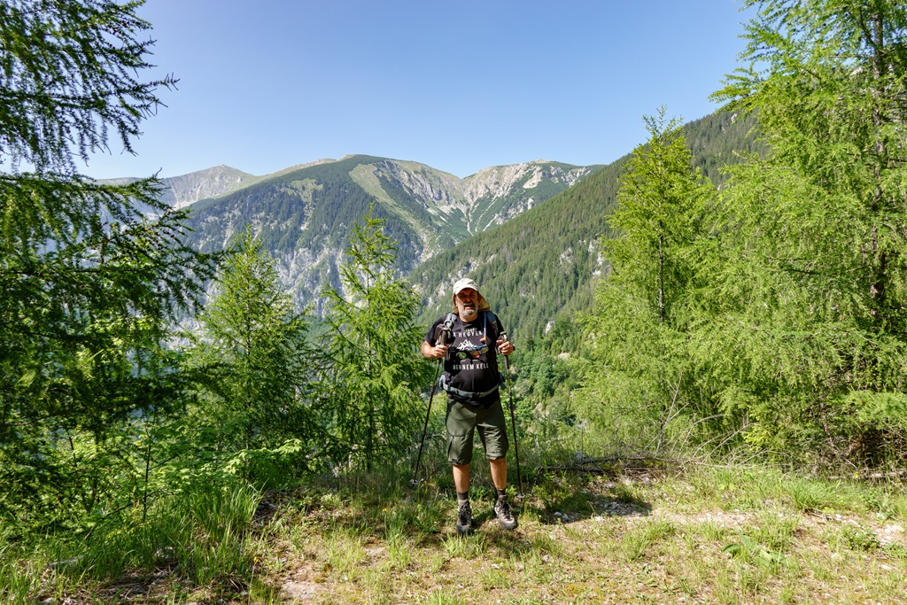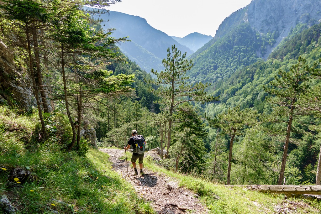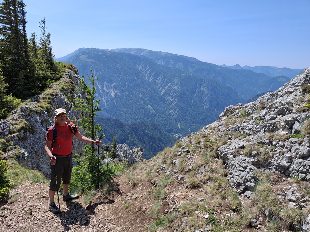 Háromnegyedórás ebédszünetünk után akarva akaratlanul, de muszáj mégiscsak feltápászkodni, hisz valahogy le kell érkezni vissza Kaiserbrunnba. A panorámaút ismét legszebb formáját mutatja, majd a drótköteles, morzsalékos, sziklagörgeteggel gazdag megszórt óvatos lépéseket, megkívánó út végére érve a nehézségeket is magunk mögött tudhatjuk. Egy kifejezetten optimálisra sikeredett túra, köszönöm Attilának, hogy újra társamul szegődött, vele nem unalmas a menetelések egyetlen perce sem.