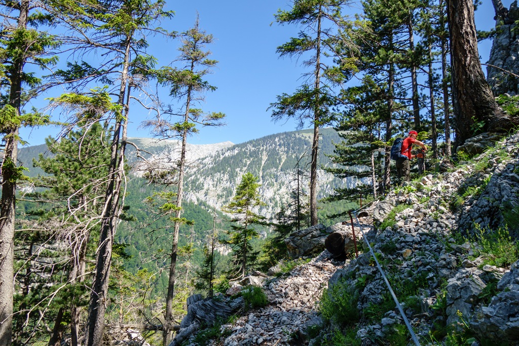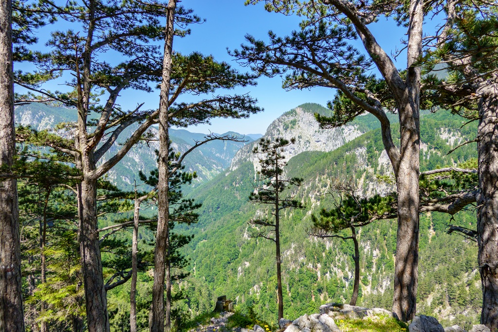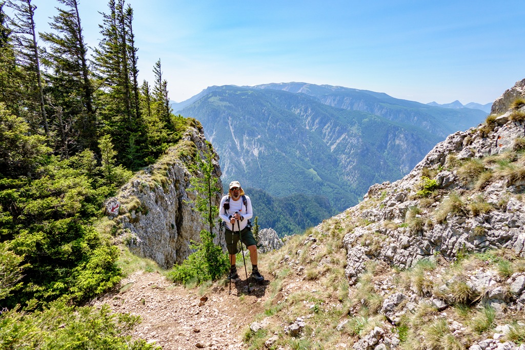 Eleinte mérsékelt emelkedőkön, helyenként szinte kisimult ösvényen, majd egyre meredekebben és egyre igényesebben kaptatunk, mígnem elérjük a kulcspontnak számító drótkötéllel és vaslétrával is biztosított szakaszt. Ezután viszont az ösvény újra jóindulatúan csavarodik fel arra a széles erdészeti útra, amely a Schneeberg-vidéke tekintetében az egyik legcsodálatosabb panorámát szolgáltatja. Nem is lehet annyi fényképet csinálni, amennyivel ki lehetne meríteni azon igényünket, hogy a táj legalább egy kicsinyke szeletét vihessük haza emlékbe.