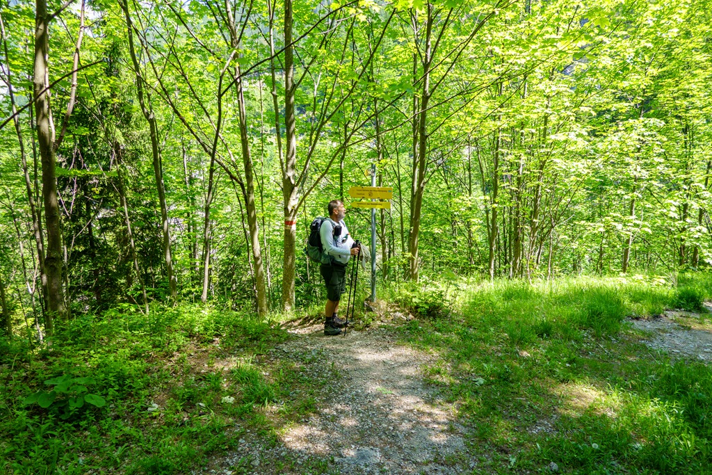 Elharangozhatták már a 10 órás misét a Kaiserbrunnban, amikor nekiveselkedünk. A Knofelebenig árnyékos erdők alján haladhatunk (fenti képek), ami nagy előny ezen a 16 órás napsütéssel megáldott nyári pénteken. Az út afféle tipikus harántoló fajta, mert jobbról a hegyoldal meredezik felettünk, balkéz felől meg a Knofelebengraben (árok) mélységei köszöntenek.