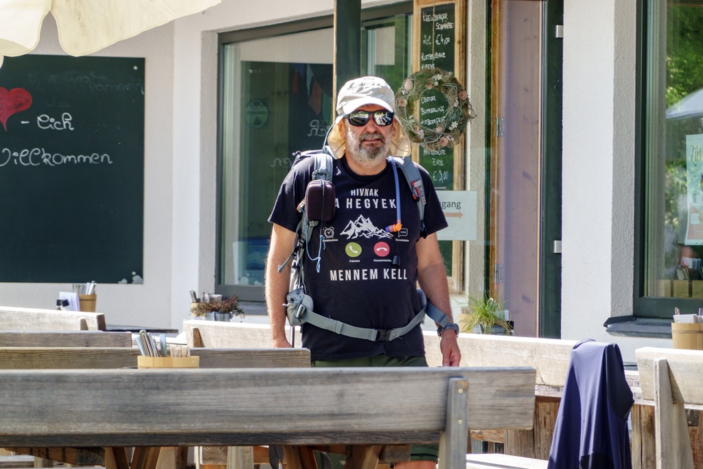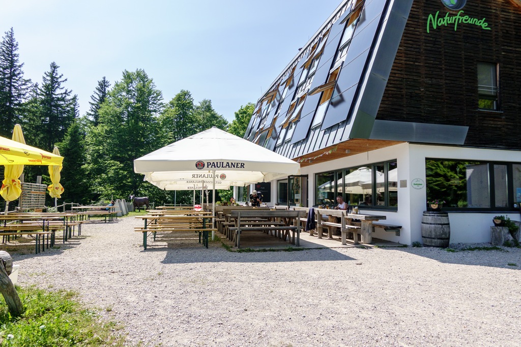 Cirka háromnegyed óra alatt érkezünk vissza Knofelebenre és a Naturfreunde-Hütte teraszára. Kissé csodálkozunk, hogy ilyen remek időben alig-alig akad vendég, de a gazda szerint másnap, szombaton itt majd tűt nem lehet leejteni. Meg kell jegyezni, hogy ez egy olyan szempontból is figyelemreméltó kunyhó, hogy itt mindig remek a kaja. Nagy a választék és kiváló a minőség, ízletes a főztjük, amit sajnos nem igazán lehet sok más jó pozícióban, szép helyszínen trónoló vendégházról elmondani.