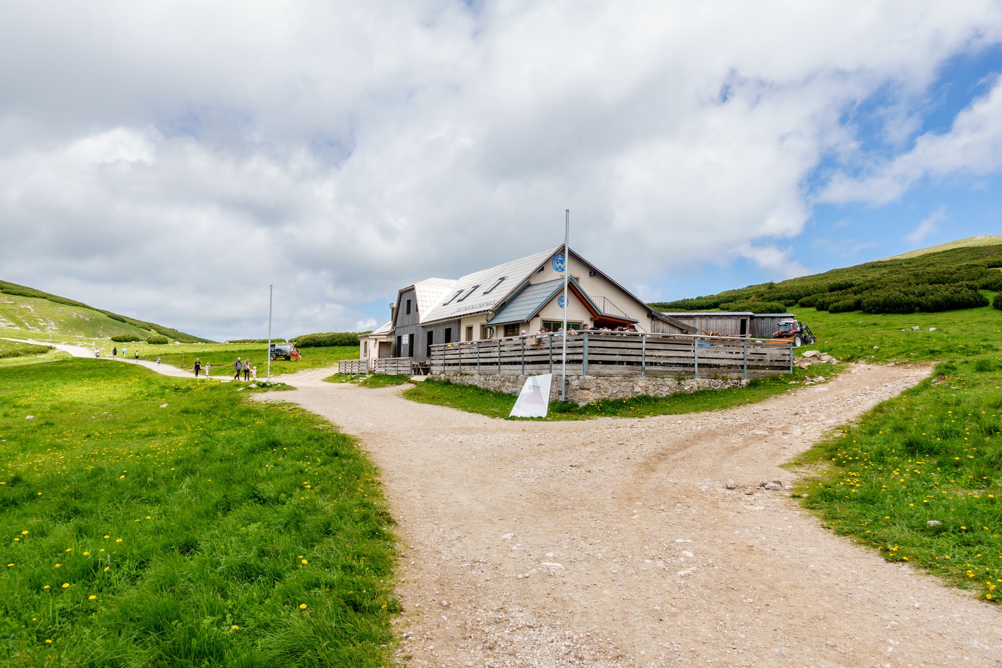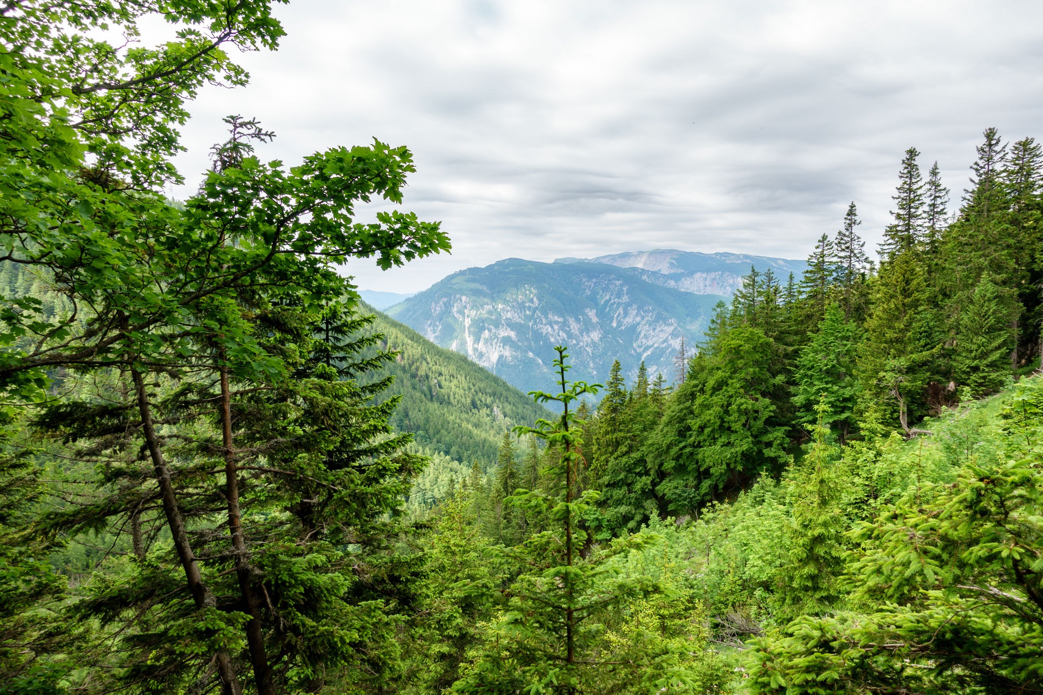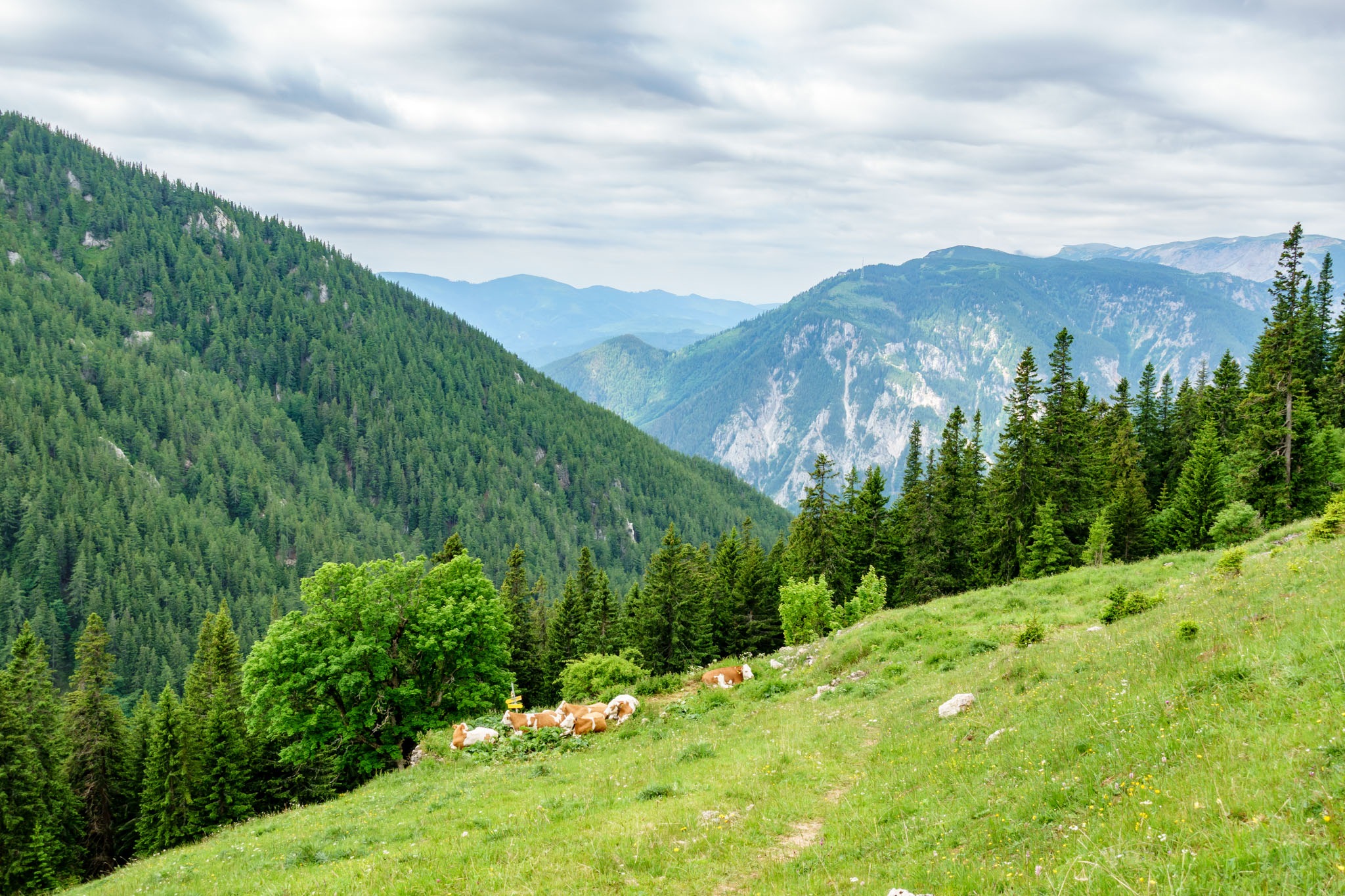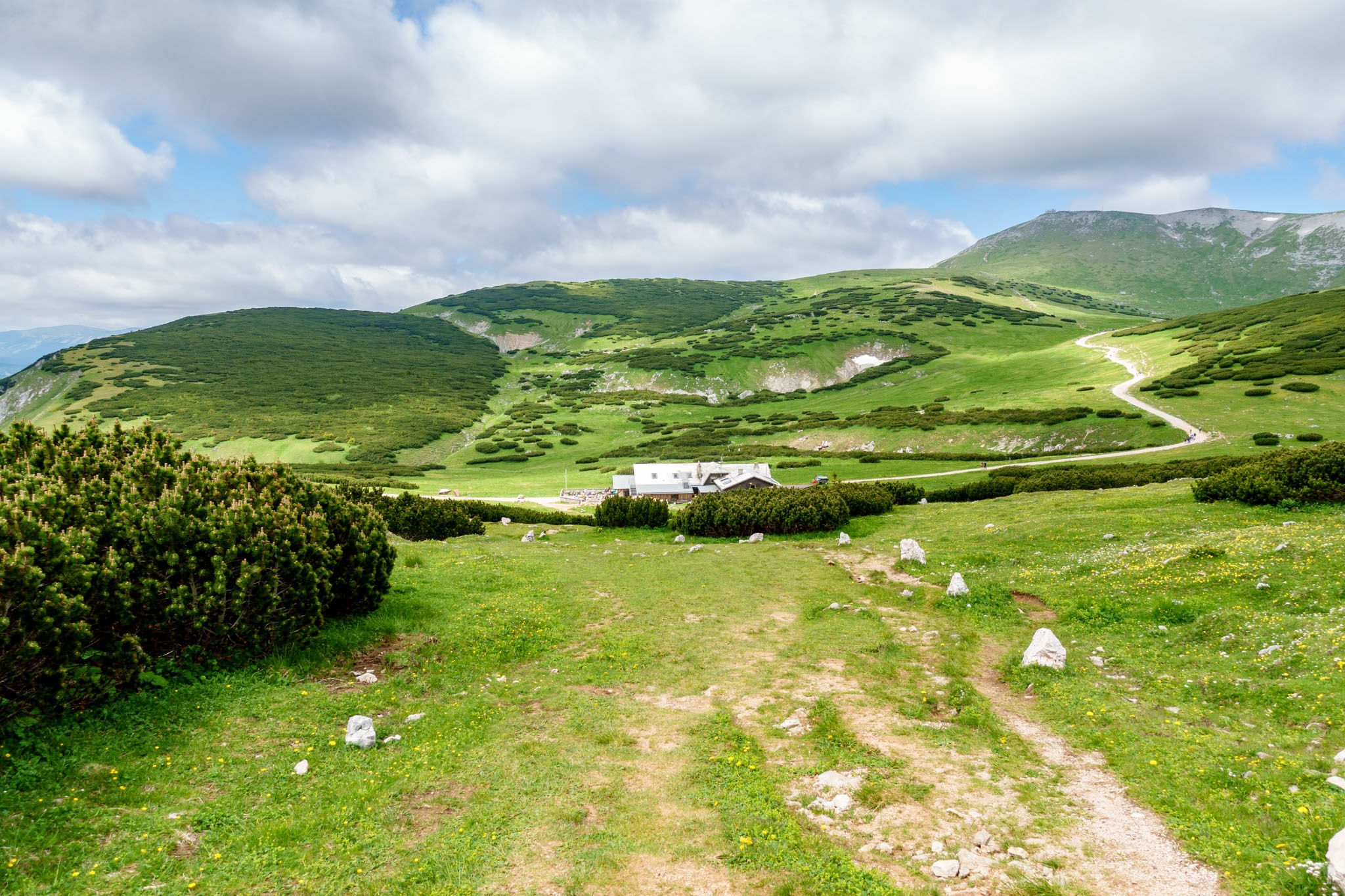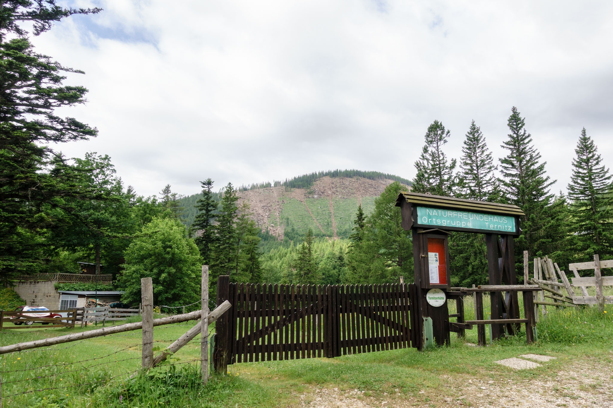 A tervem pedig úgy hangzik, hogy Rohrbach im Grabenból indulva a lehető legrövidebb úton, tehát a Nesselgrabenon át elérni a Krummbachsattelt, majd onnan az Emmysteigen fel a Waxriegelre (1888m) illetve utána a Damböckházban megejteni az ebédemet. Nos, így is van. Szépen felkapaszkodom a Rohrbachgrabenban, majd mérsékelt emelkedőn, széles erdészeti úton masírozok a Ternitzerhütteig (fenti képek). Az időjárás kissé hűvös és az ég el is van rendesen kámpicsorodva, de tudvalevő, hogy egy déli irányban fekvő ösvényen akarok felmászni a Schneeberg platójára, miáltal, ez akár áldásos is lehet (merthogy nem pirít majd a nap).