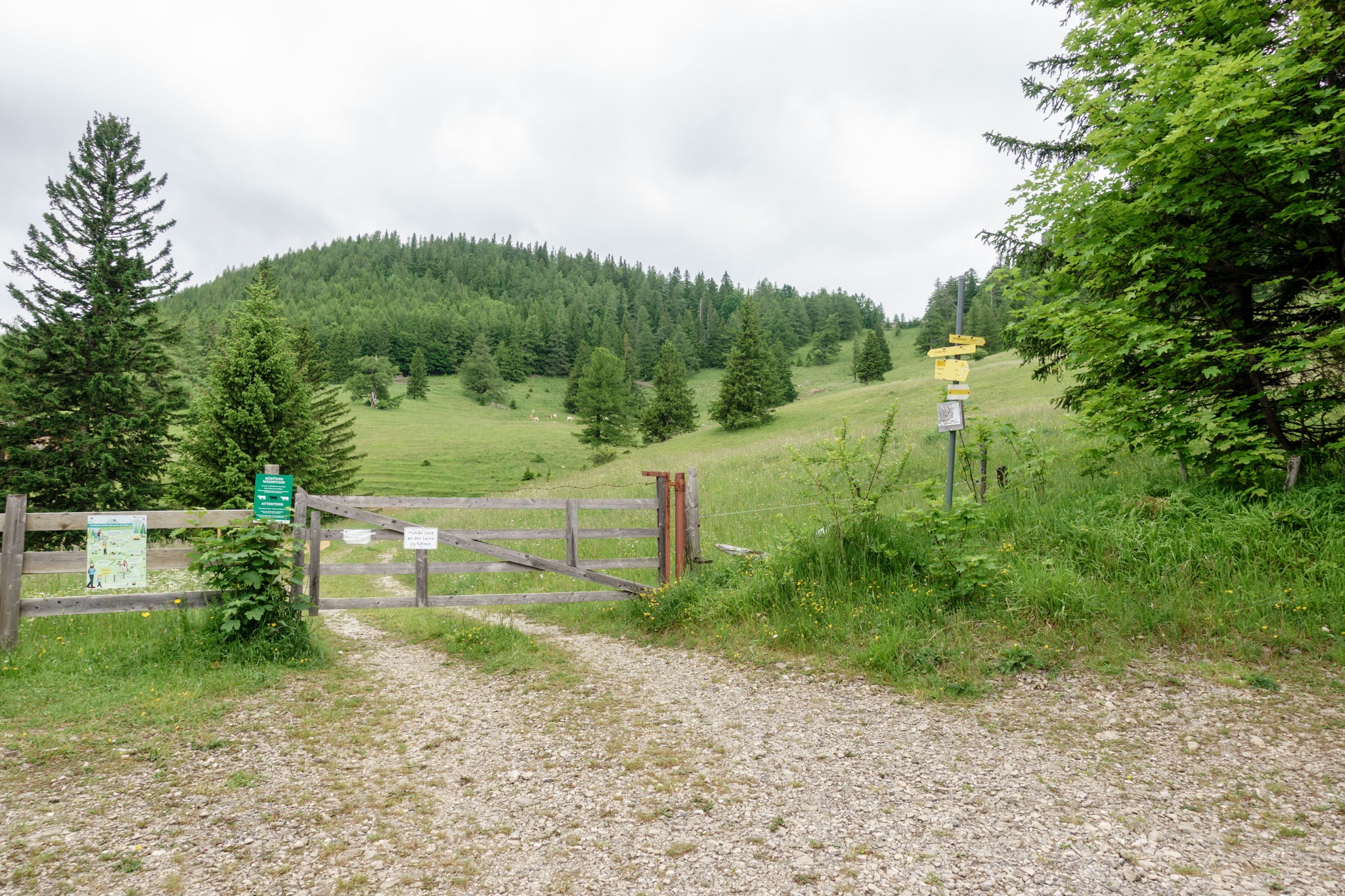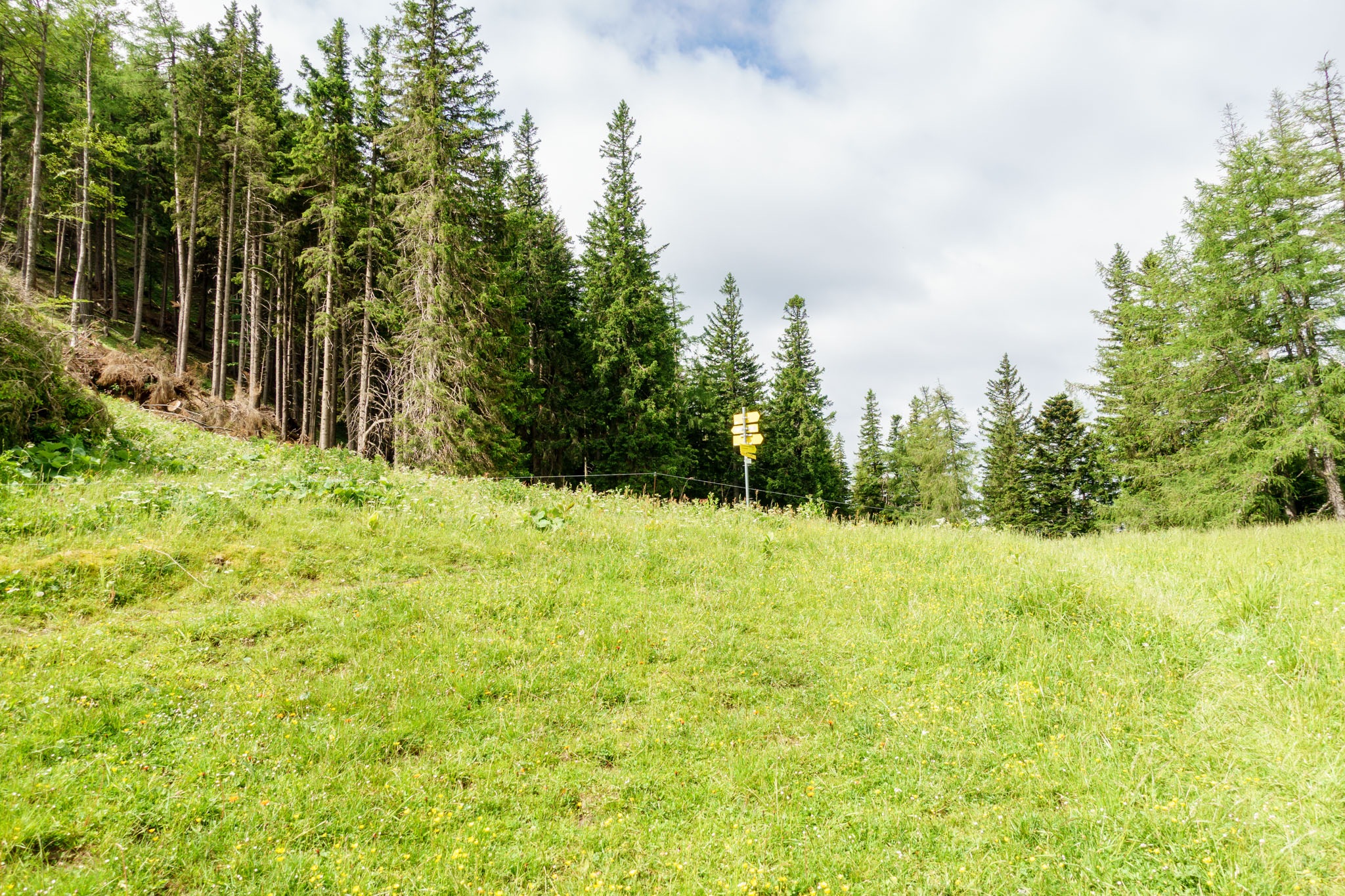 A továbbiakban még egy villanypásztor alatt kell átmásznom és íme, végre kiérek a Baumgartner felől érkező erdészeti útra. Összegzésként említsem meg, az útvonal követése így nyáron nem ajánlott, és amennyiben valaki mégis Rohrbach im Grabenból a Krummbachsattelt tenné meg céljául, akkor inkább másszon csak szépen fel a Bilekalmon a Kaltwassersattelba és folytassa Baumgertneron át, ami után két helyen is van egy-egy letérő balkéz felé a célhoz.