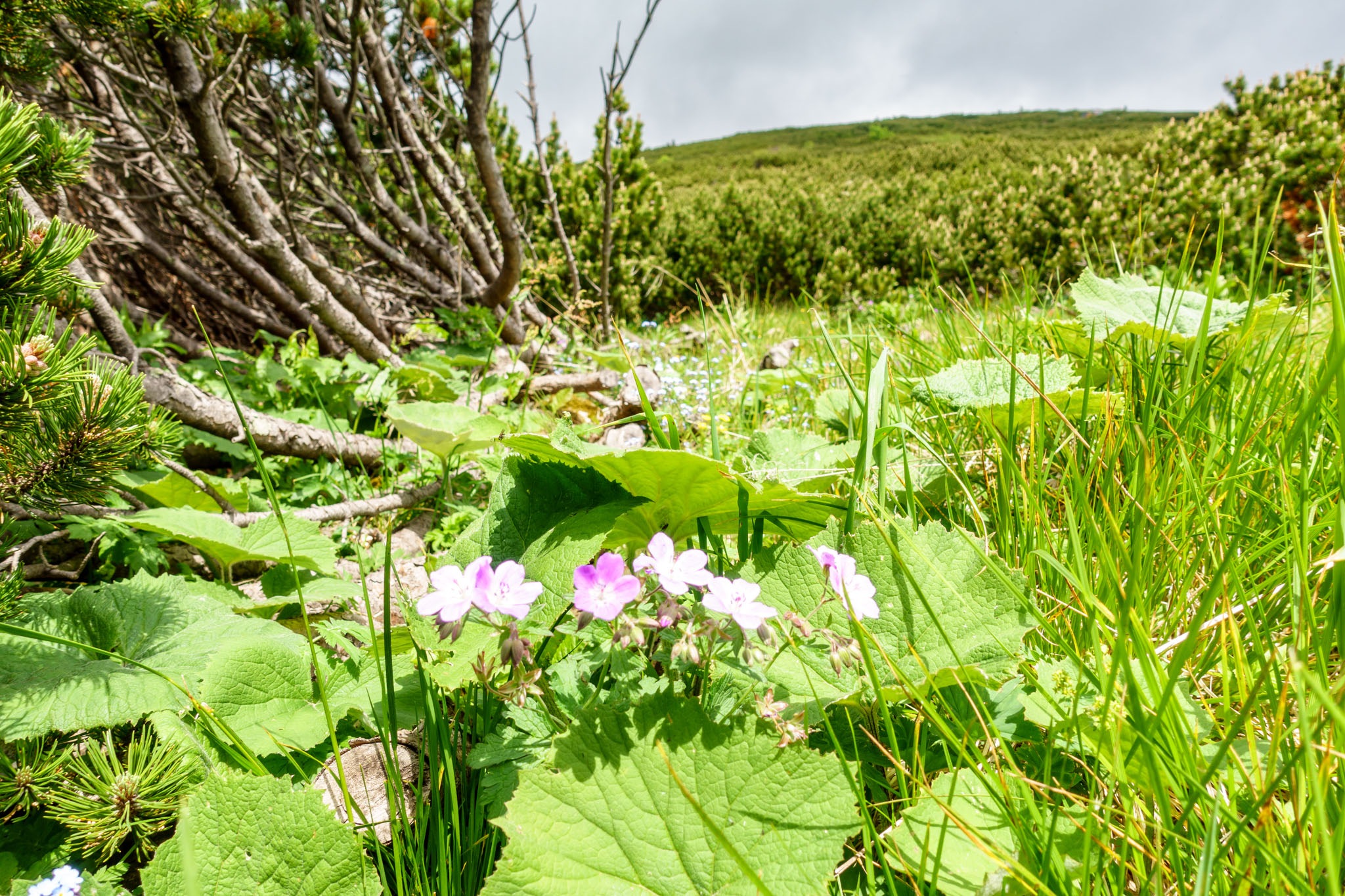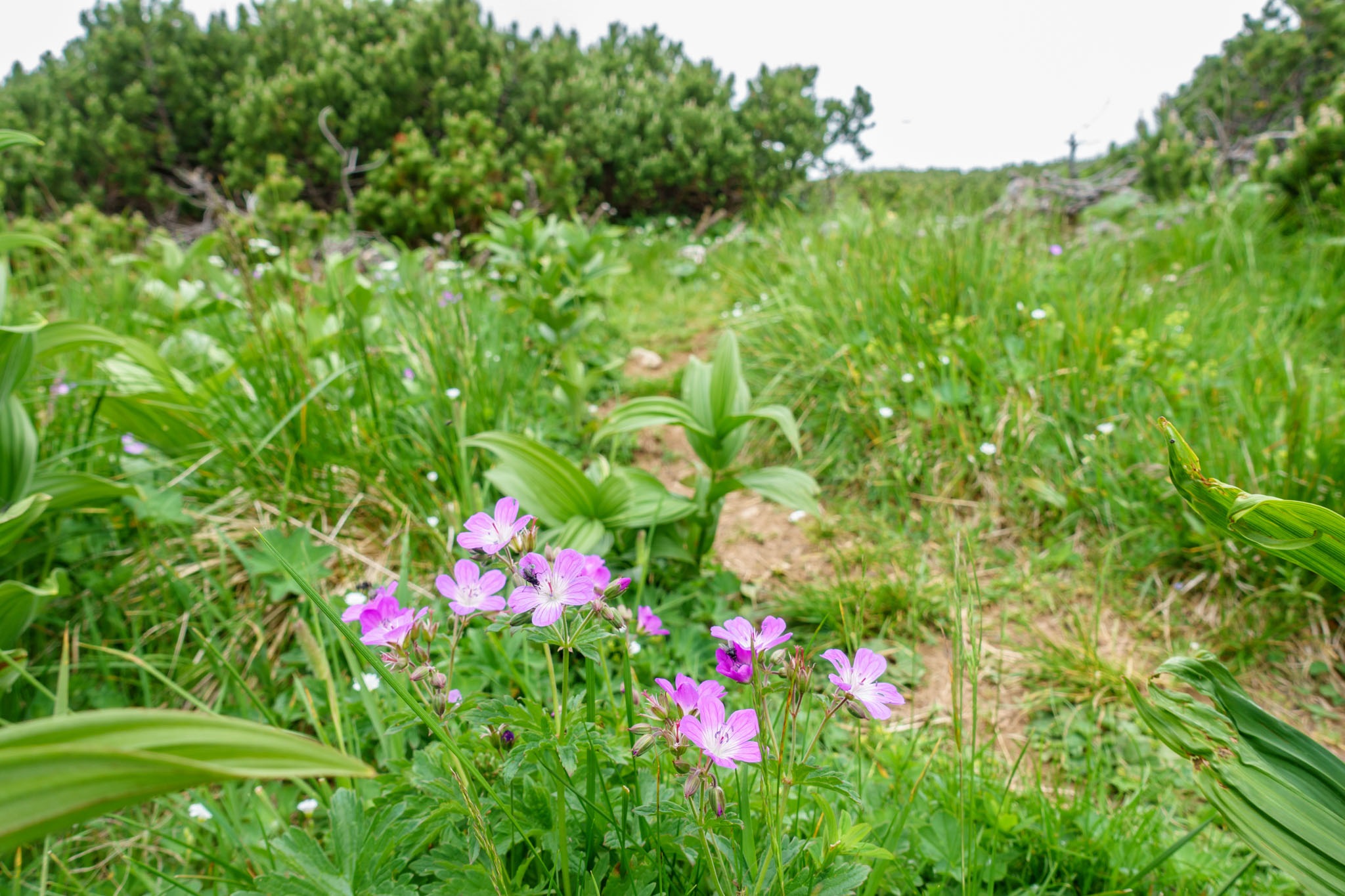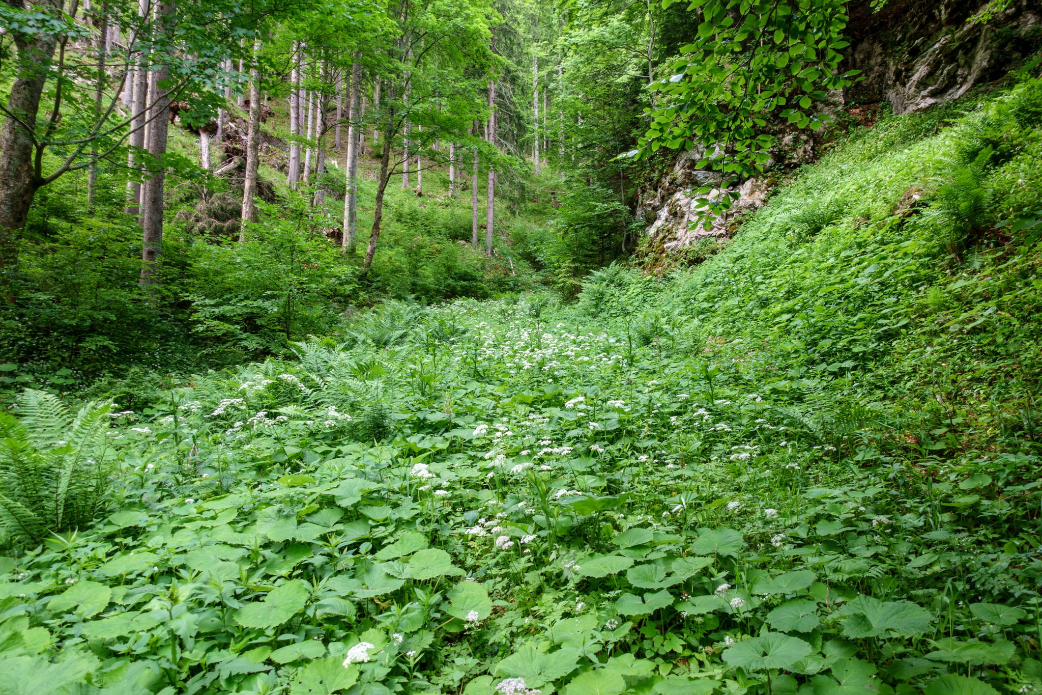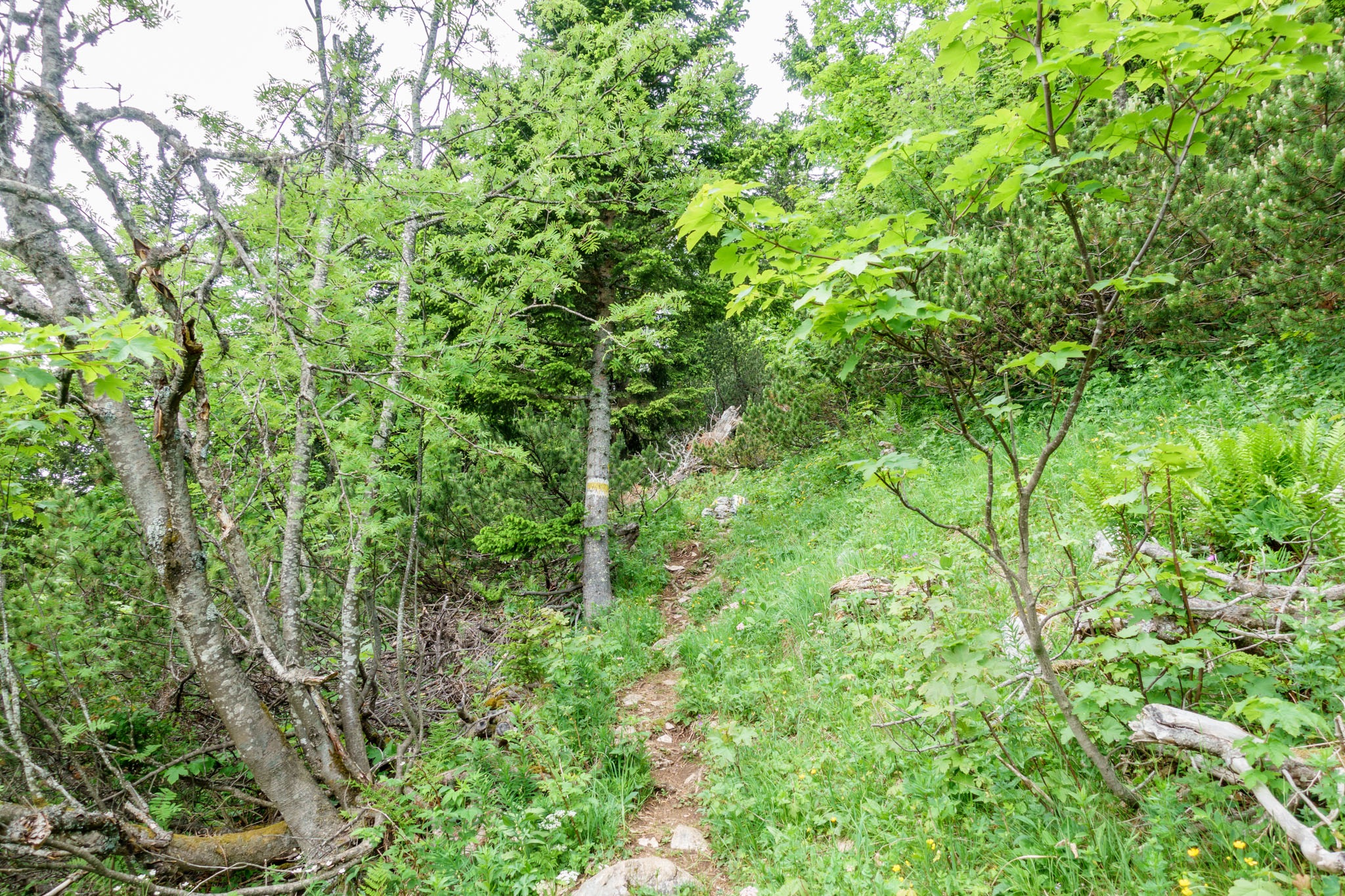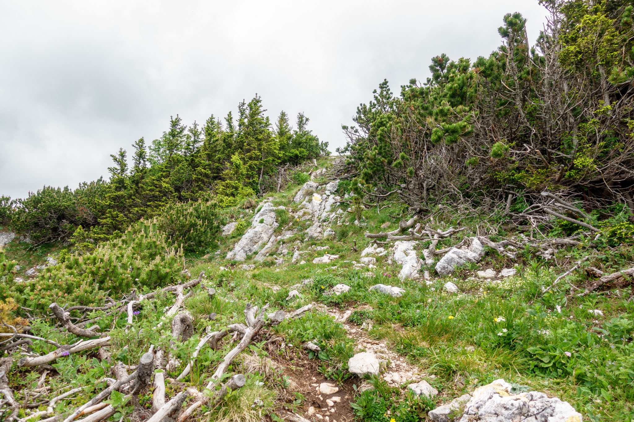 A Ternitzerhütte után következik a Bilekalm, amit legutóbb is Kaltwasseralmra lett átkeresztelve. Nem tudni mi okból. Itt nem mászom fel Baumgartnerhez, hanem maradok az erdészeti úton, mindaddig, amíg egy hajtűkanyarhoz nem érek, ahol az út balra hajlik és a Krummbachstein északi oldalán futna tovább. Jómagam viszont tartom az eredeti irányt és nyugat felé egyenesen belegyalogolok a Nesselgrabenbe (fenti képen). Kissé tétovázom, mert cirka egy méter magas salátás-susnyás kellős közepében találom magam (lenti képen), de mintha látnék egy halvány nyomot, ami tán több napos (vagy hetes) is lehet, de biztató.