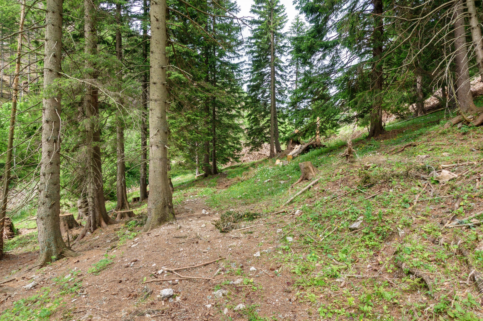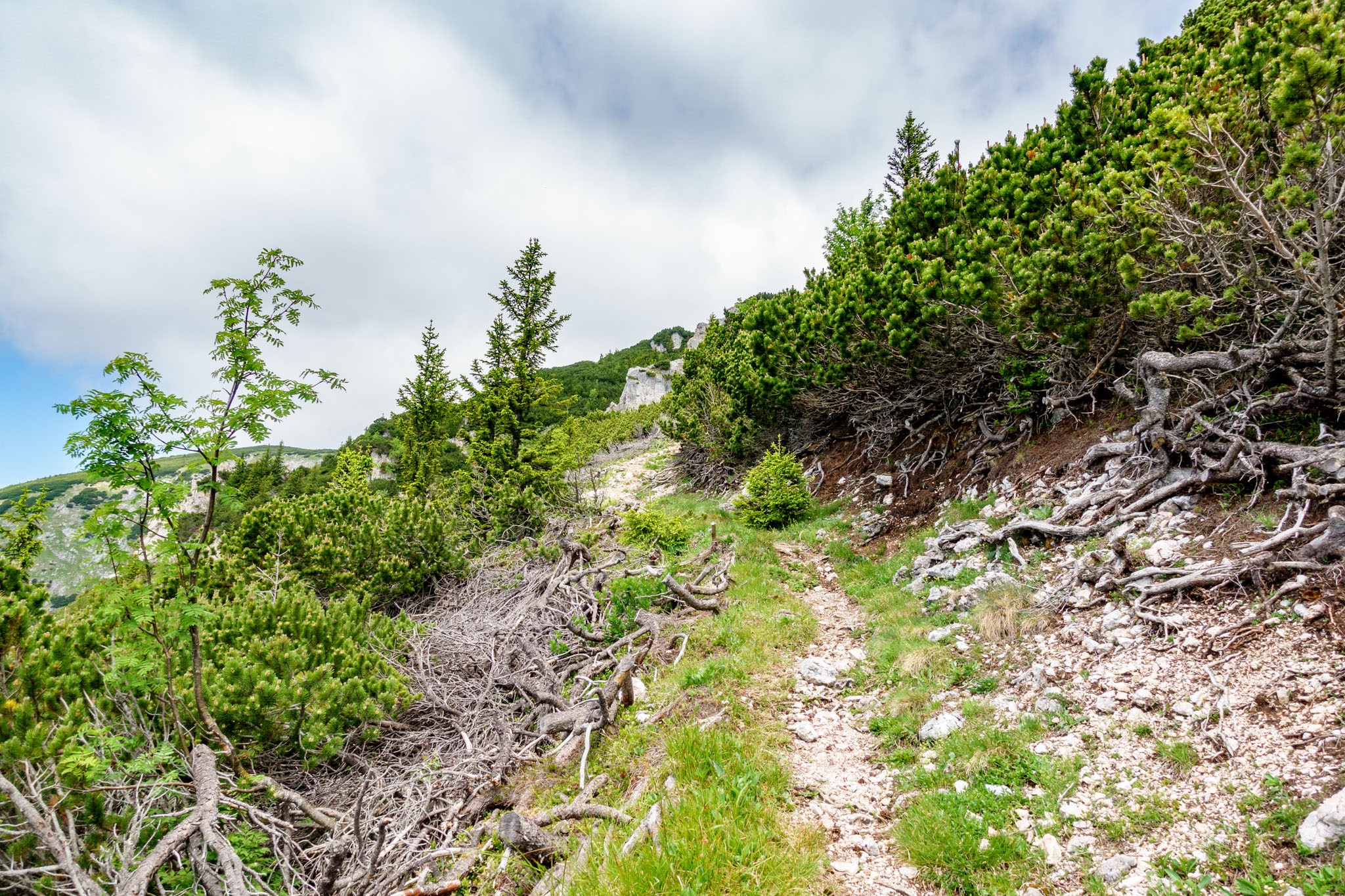 A fenyő úgy fekszik ott mint egy tüskés szörnyeteg. A lándzsaszerűén kiálló hegyes ágcsonkok, könnyen nyársra vehetik a hirtelenkedőket. Látszik viszont jobbra fel a hegyoldalba egy kitaposott kitérő, melyről úgy gondolom, ez a megoldás. Mi sem egyszerűbb mint követni. Hah! Hiba! Tudniillik ez a kitaposott mellékösvény csak tekereg még három más kidőlt fenyőt próbálva kicselezni, mígnem a semmibe vész. Nos akkor most mi legyen? Elég magasra jutottam már az eredeti út fölé, vagy visszafordulok, vagy pedig próbálok valahogy visszaereszkedni az útra. Két nagy vízszintesen fekvő fenyő törzse között látok egy tán használható rést, ahol ha levetem a hátiszákom, akár át is csusszanhatnék. Megpróbálom. A rés ugyancsak szűk, kínlódom vele. A gond, hogy egy irdatlan meredélybe érkezem és még vissza kell fordulnom, hogy kihúzzam, átrángassam a hátizsákom is valahogy. Nos, elég sokáig bajlódom így a dolgokkal, mire végezetül sikerül visszajutnom az út szintjére.