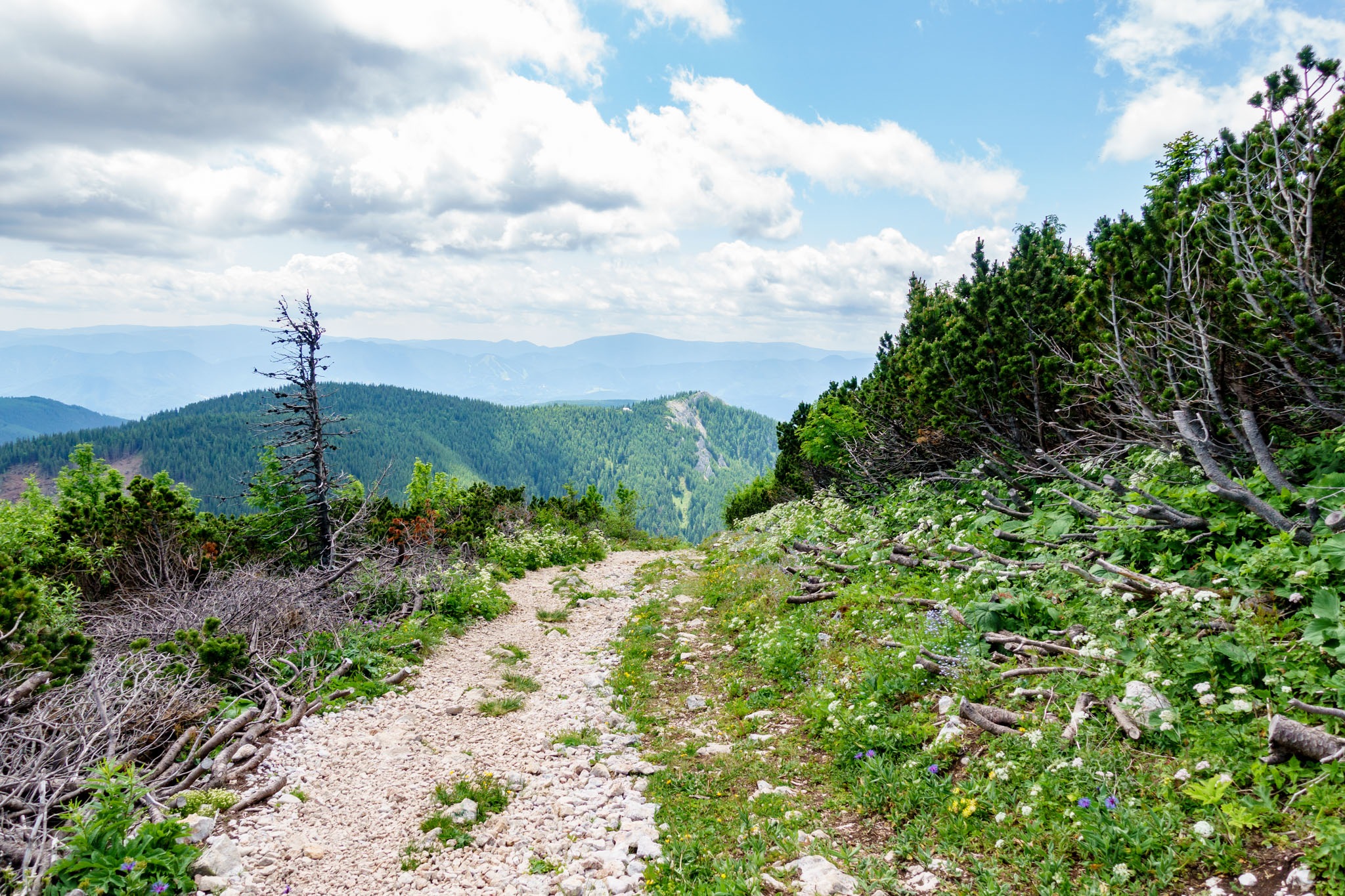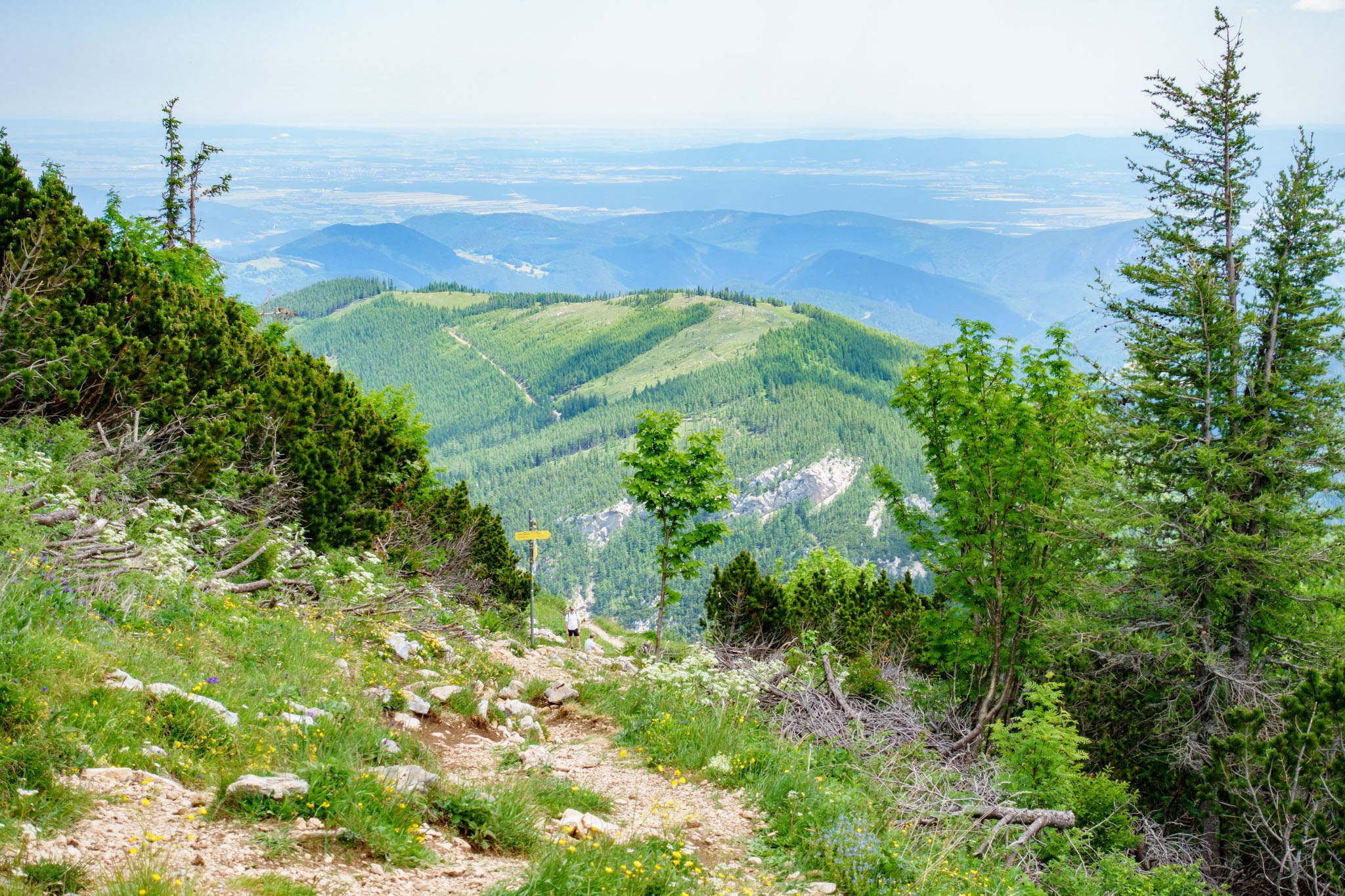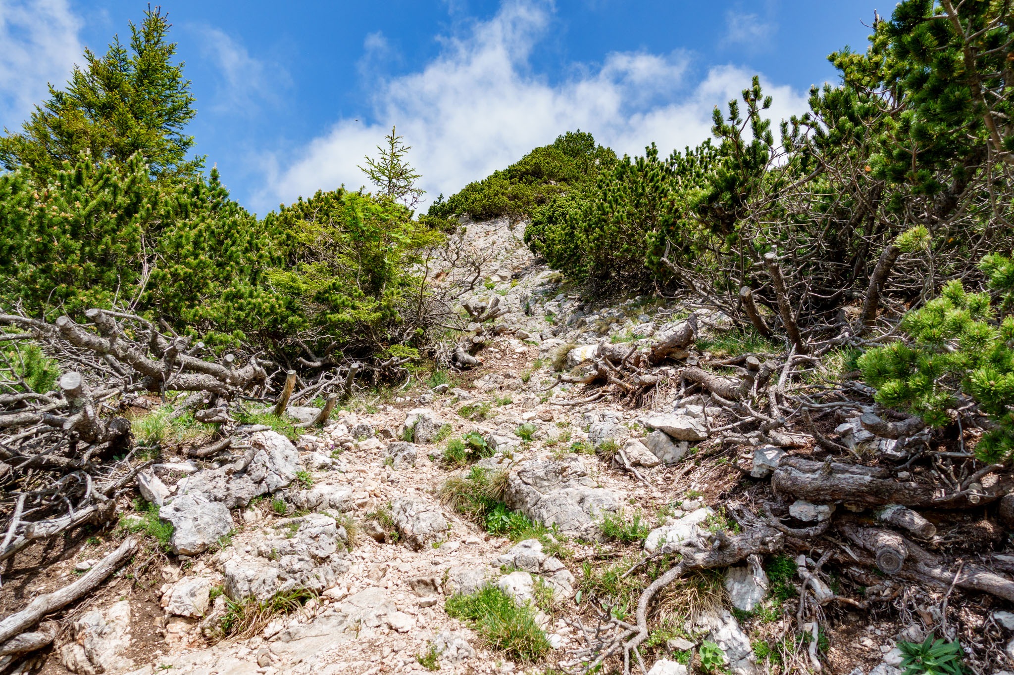 A Schneeberg alatti vidék térképére pillantva jól kivehető, hogy a Rohrbachgraben természetes folytatása nyugat felé a Nesselgraben, ami pedig a Krummbachsattelba torkollik, illetve ott ér véget. Télen, amikor kitölti a hó és a víz megdermed benne, már kétszer is volt szerencsém végigmasírozni a Nesselgrabenon mind felfelé mind pedig lefelé menetben, és most érdekelt, hogy így a nagy nyárban milyen arculatú és hogy használható-e? Hát előre bocsátanám, hogy nem, semmiképpen sem.