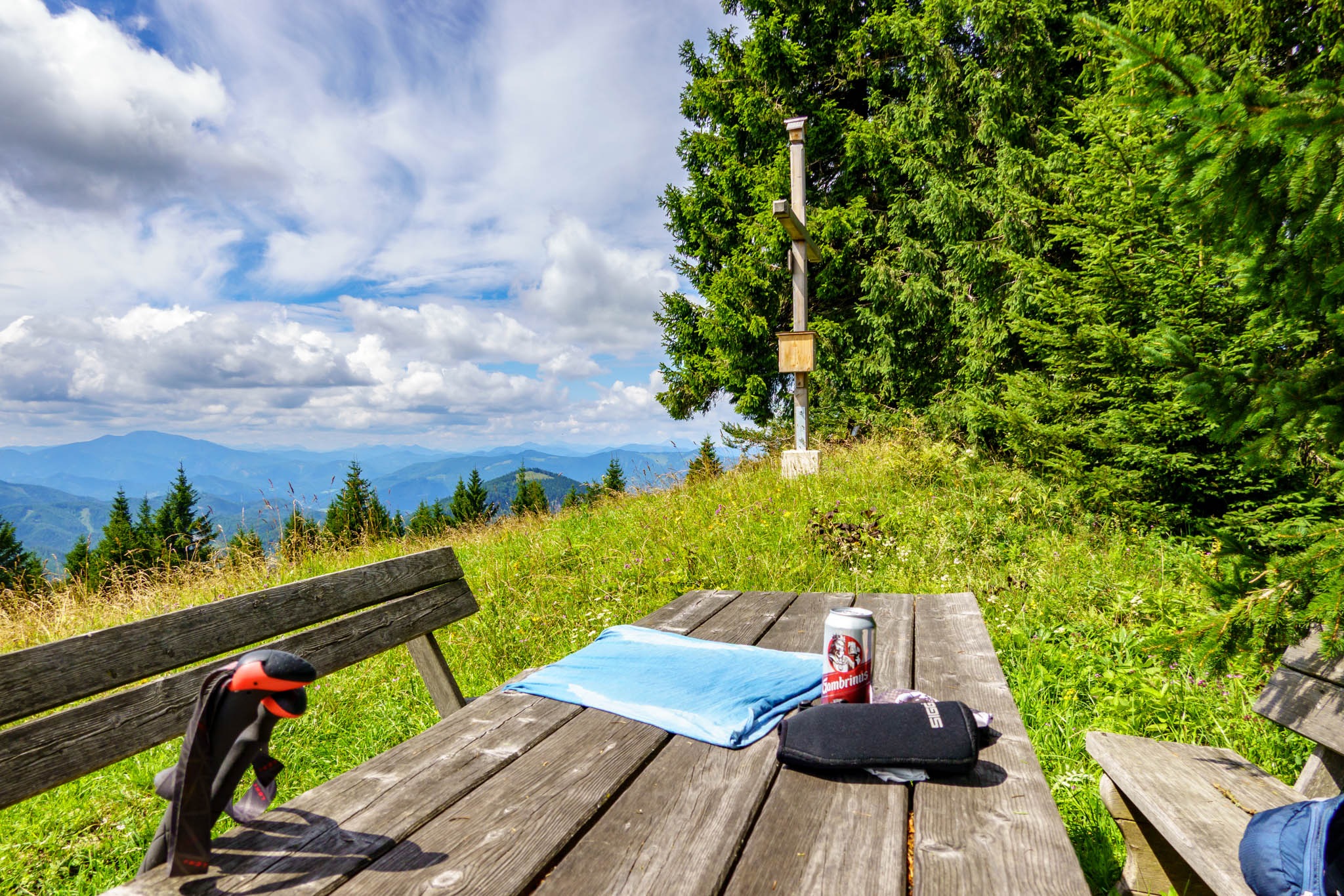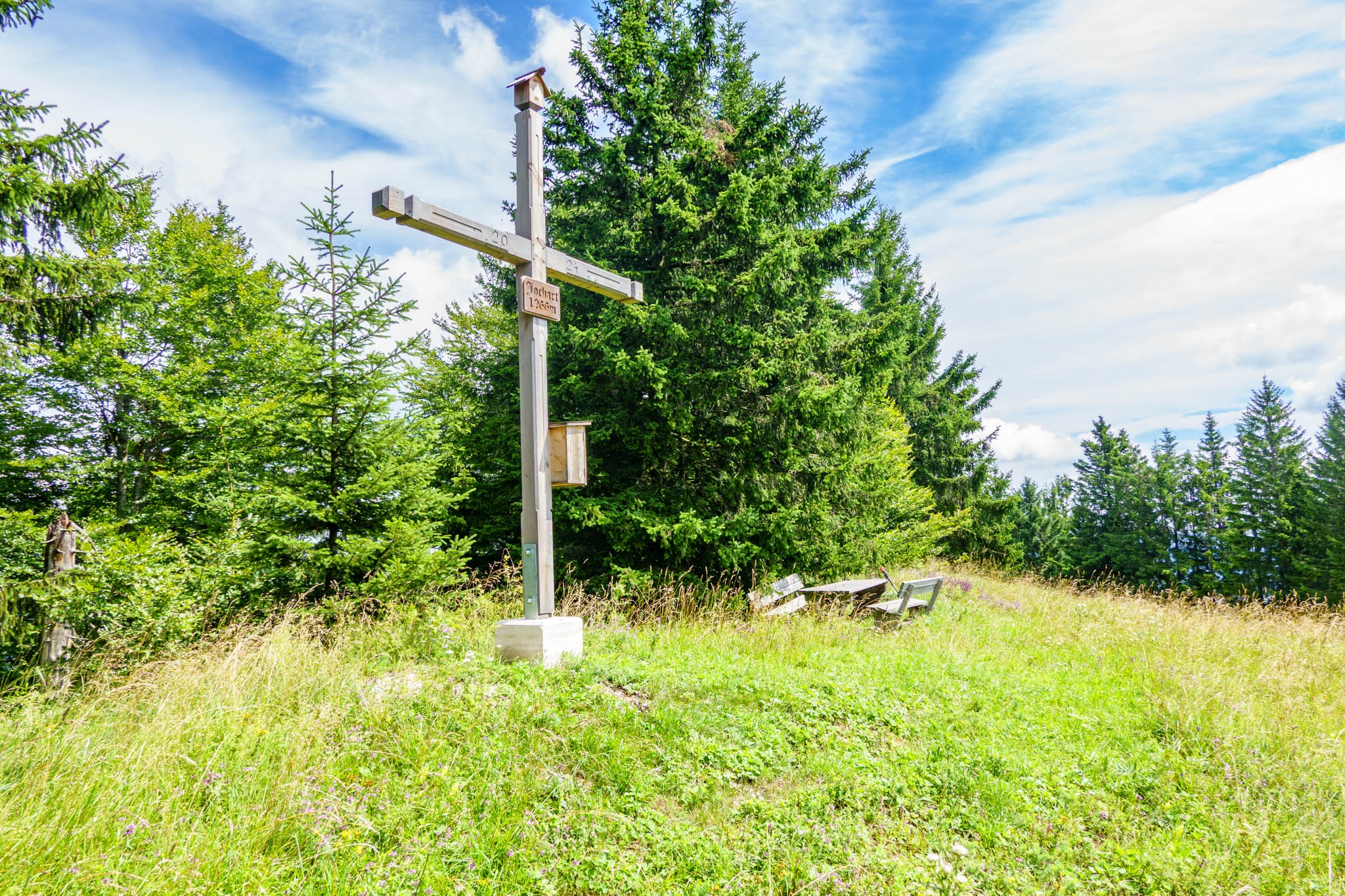 Nos tehát, némi izgalmas küzdelmek és útkeresés után elérem a végső, jól kivehető és szabad útszakaszt. Nini, a Jochart régi keresztje eltűnt! Vajon hová lett? Tábla jelzi, picivel odébb van egy pihenő hely (Rastplatz), nézzek el tehát oda. És valóban, meglelém az ebadtát. Szép lett, szebb mint a régi. Nagy örömömre ott van egy pad is, lesz tehát hol elköltenem a hamuban sült pogácsám. Remek! Teljesen odáig vagyok a viszonyokkal, különösen, hogy mire idáig érek, már a nap is majdnem folyamatosan ragyog, melenget és falatozáshoz kitárulkoznak előttem az ismerős hegyláncok is. Kis szépséghiba, hogy a láthatóság tipikusan nyári, a párás levegő miatt ködös, de ez engem egy cseppet sem zavar.