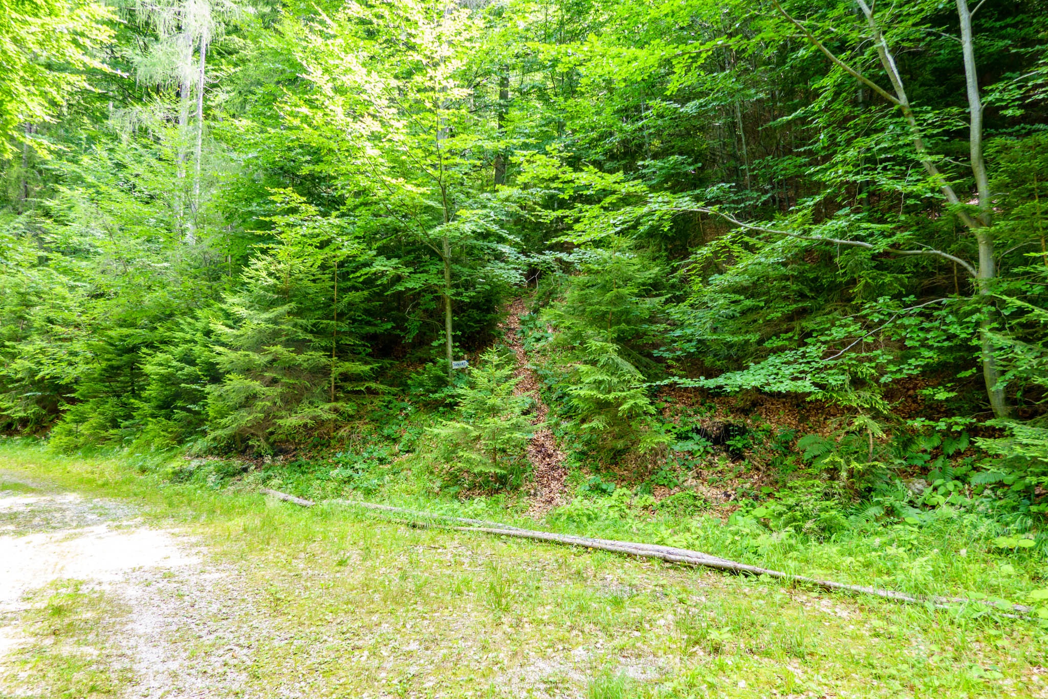 Az út második része a legfurfangosabb. Tudniillik itt vége a romantikus baktatásnak és egy nagyon kemény kaptató következik fel a „passzóba”, ami egy nyereg és Hammerleck (987 méteren) néven fut. Az erdészeti útról leválik jobbra fel a hegyhátra egy vékony ösvény (lenti képen), amit egy kékkel pingált tábla jelez. Én vesztemre rövidítek és hamarosan árkon bokron át érem el a jelzett ösvényt. Senkinek nem ajánlom, magamnak sem.