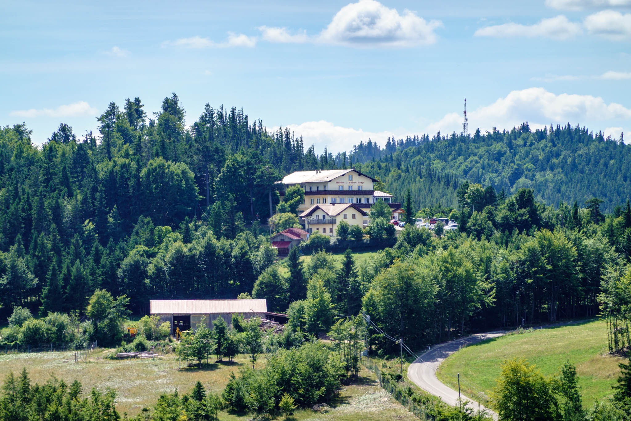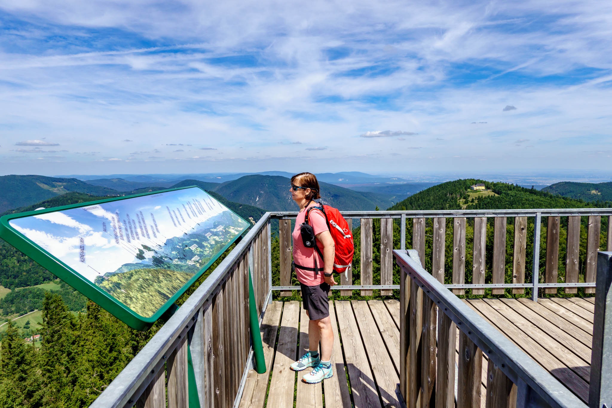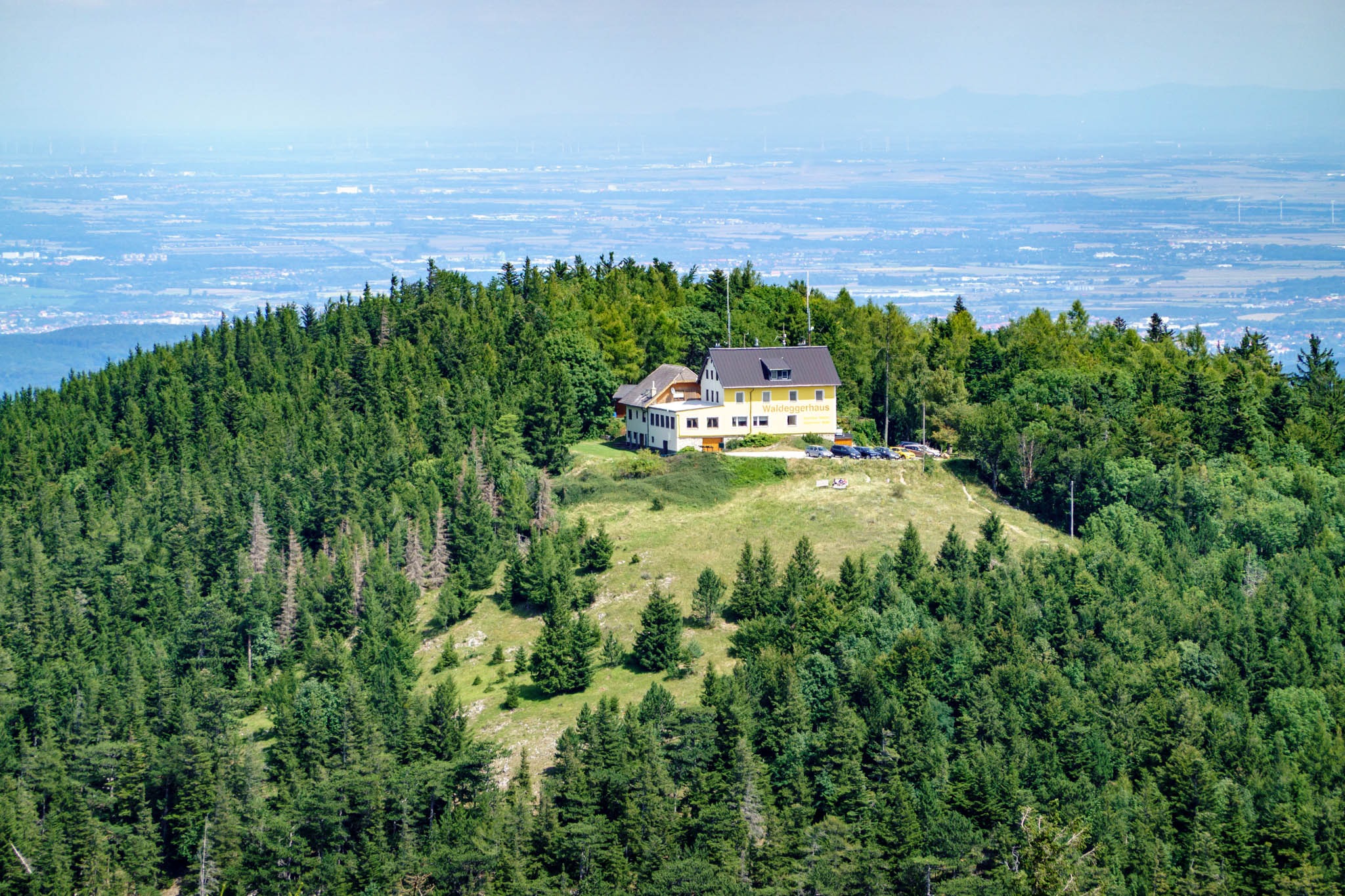 A Kleine Kanzel a kép bal oldalán és kinagyítva lenn a hasonnevű vendégház. Egészen távol a Schneeberg húzódik.