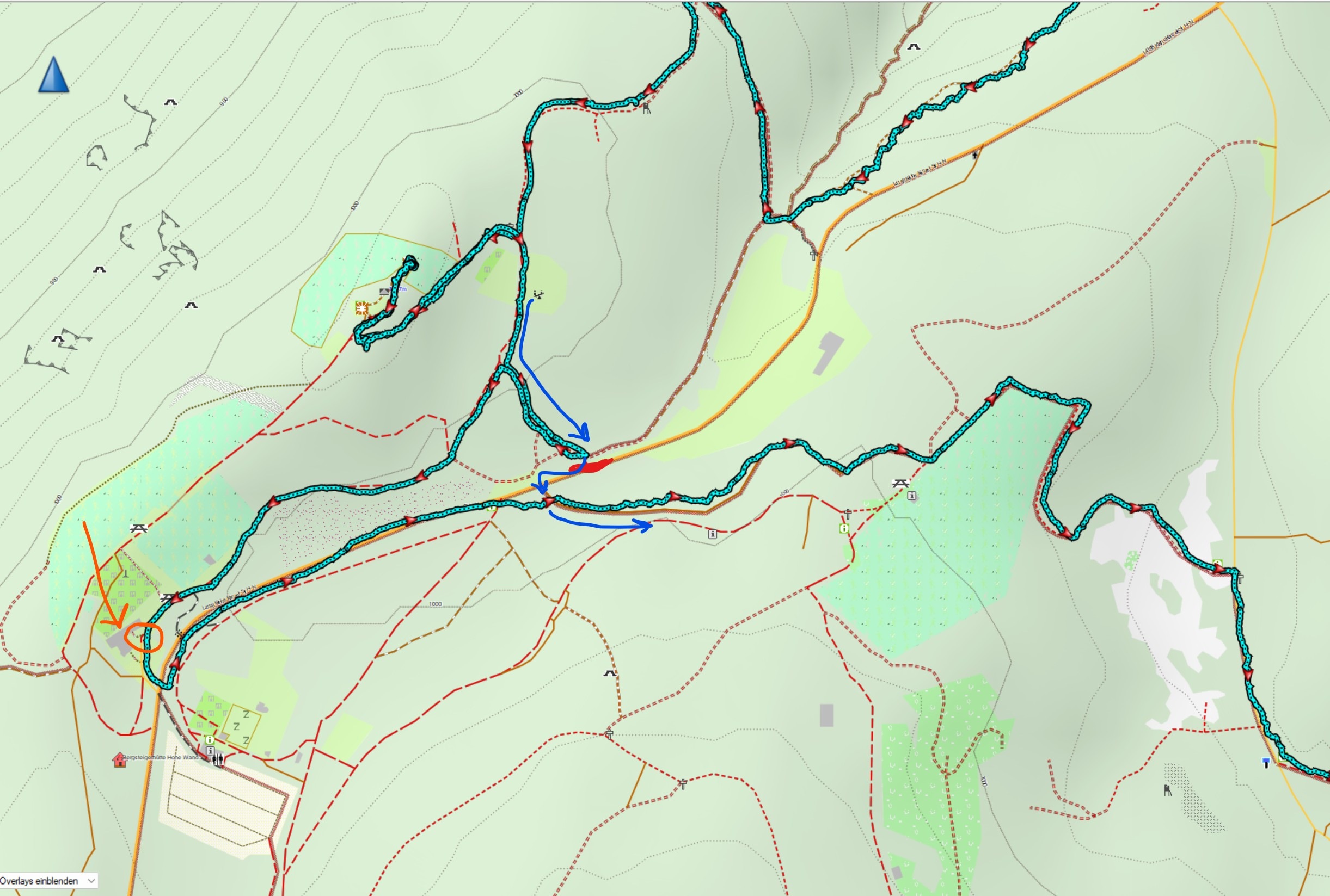 Történt ugyanis, hogy a szokott gyengéd kis körünkbe, ami a Waldeggerházat érinti (lásd GPX–nyomvonalat), visszafelére belekomponálok egy kis kitérőt a vendégházzal átellenes dombon található kilátóba. Remek! Jó az idő, minek sietni haza. A kilátót el is érjük gond nélkül, de ezzel benne vagyunk a csapdában. Tudniillik a Kleine Klause felől érkező Jagdsteig akadálytalanul vezet a kilátóhoz. Aki ugyanerre masíroz vissza, észre sem veszi, hogy tiszteletét tette a „restricted area”-ban. Mi viszont egy kijelölt turistaúton kívánjuk folytatni a Gasthof Postl felé, amit kékkel jelöltem az alábbi kiemelt részleten. Vastagon pirossal jelölve a lezárt kapu, illetve a bal oldalon pirossal karikázva egy forgókapu, ami nagylelkűen aztán mégis kienged (kattint a képre teljes felbontáshoz). A kilátóból a Kleine Kanzel felé vezető korábbi erdei út is imígyen el van torlaszolva (tavalyi tapasztalatunk) és a Kleine Kanzelt csak az aszfaltúton poroszkálva lehet újfent elérni.
