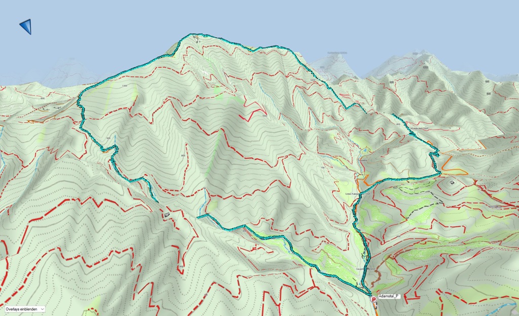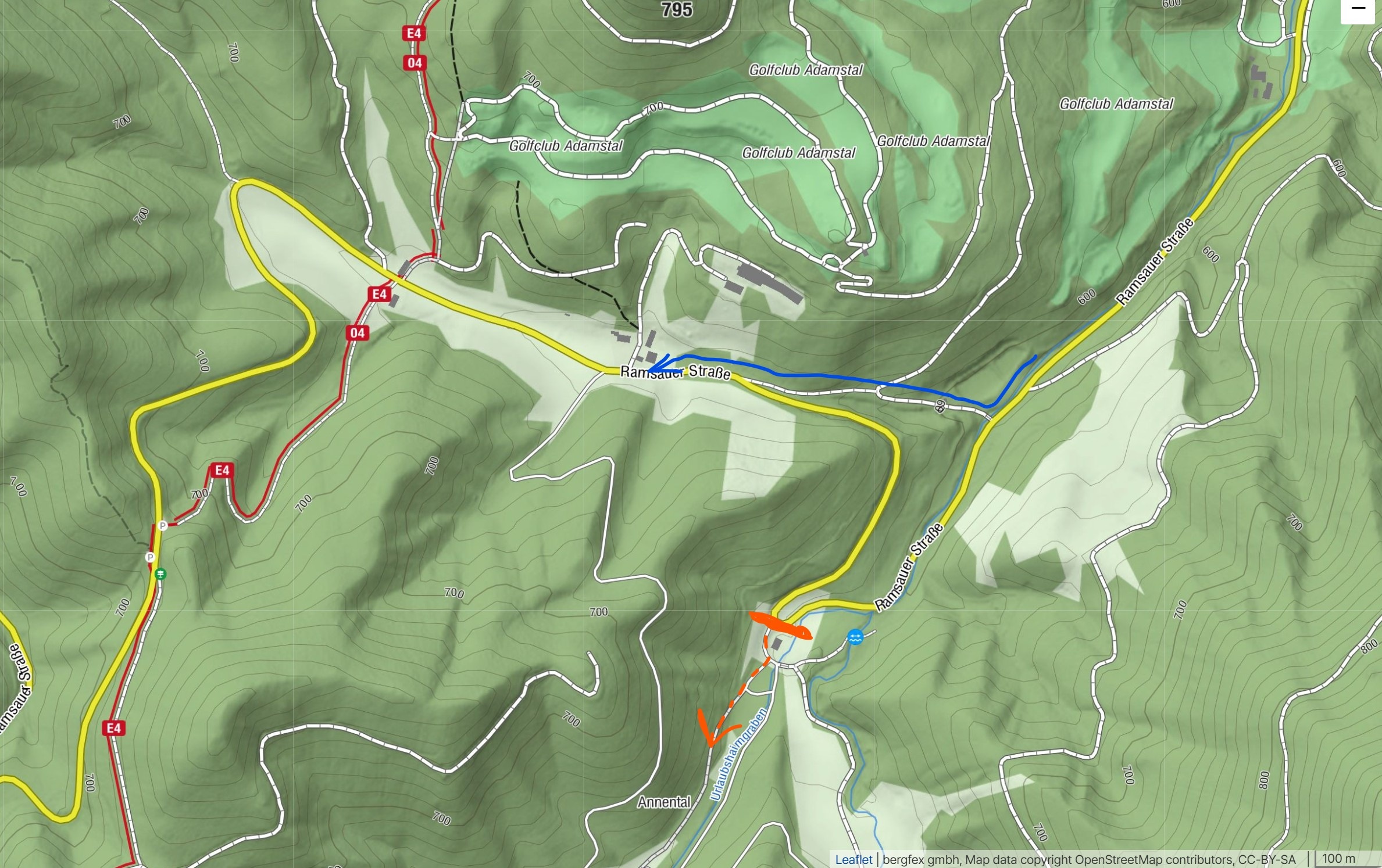 A legutóbb, eme megnövekedett igényeket tetézte, hogy mint akkor azt elmondtam, valakik megvették az Annentalt, az azon átvezető eredeti turistaúttal egyetemben. Na szervusz! A hivatalosan kijelölt kerülő az Adamstal északi oldalán elterülő golfpályákon át vezet, ami még egy kicsivel tetézi mind az útvonal hosszát mind pedig a szükséges szintemelkedést. Nézegetem, tanulmányozom a térképeket, hogy található-e estleg valami trükkös alternatívája a régi direkt útvonalnak. És képzeld, van ilyen. Alábbi térképrészlet mutatja a főutat sárgával. Kékkel bejelöltem a szerpentin lehetséges áthidalását egy erdészeti úttal. Vastag piros vonal jelzi a vaskaput, ami lezárja az Annetalt a köz elöl. És ez a tervezet, így valóban működik is. Fenti kép ott készült, ahol a kék nyíl eléri az aszfaltot.