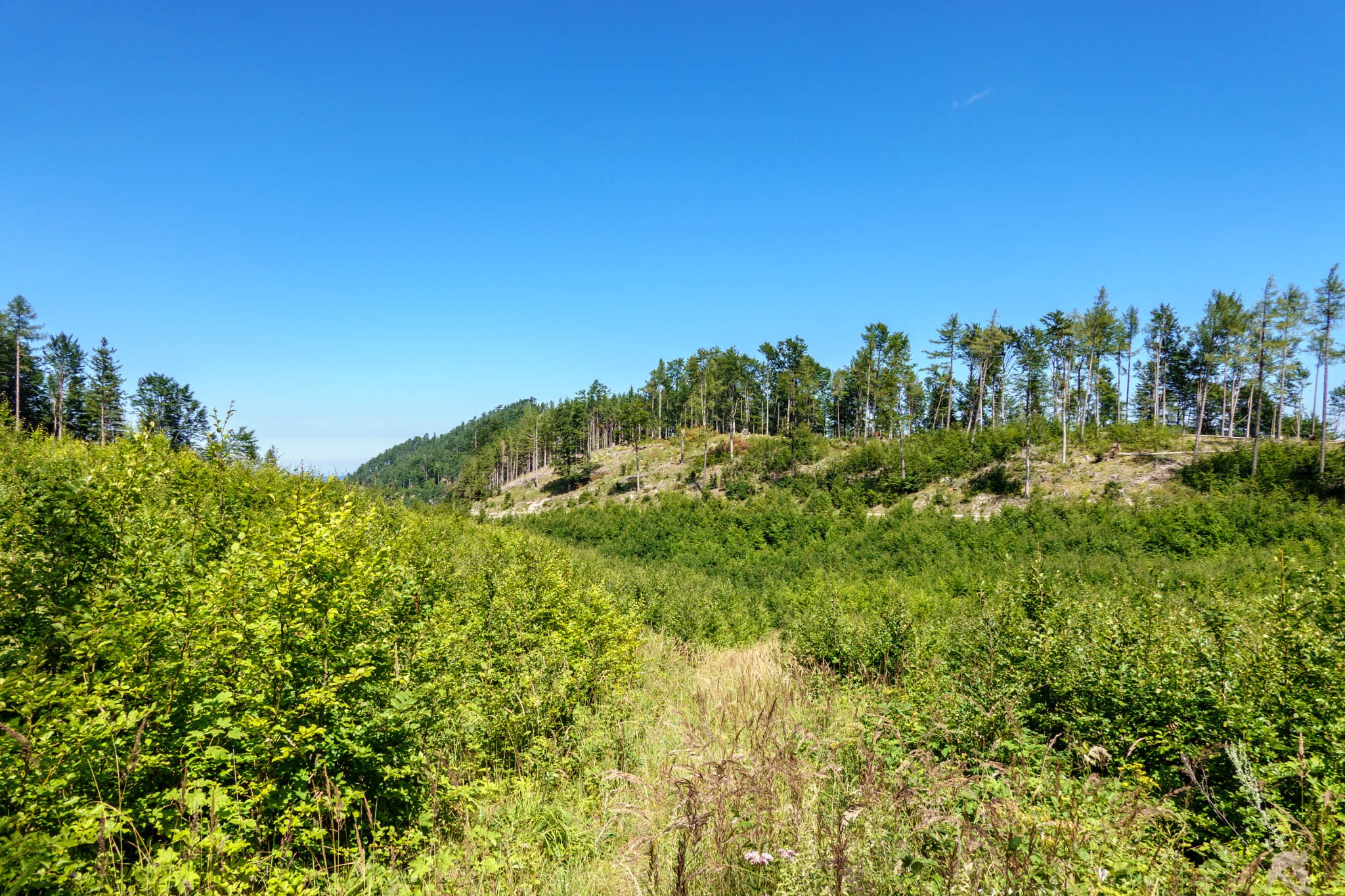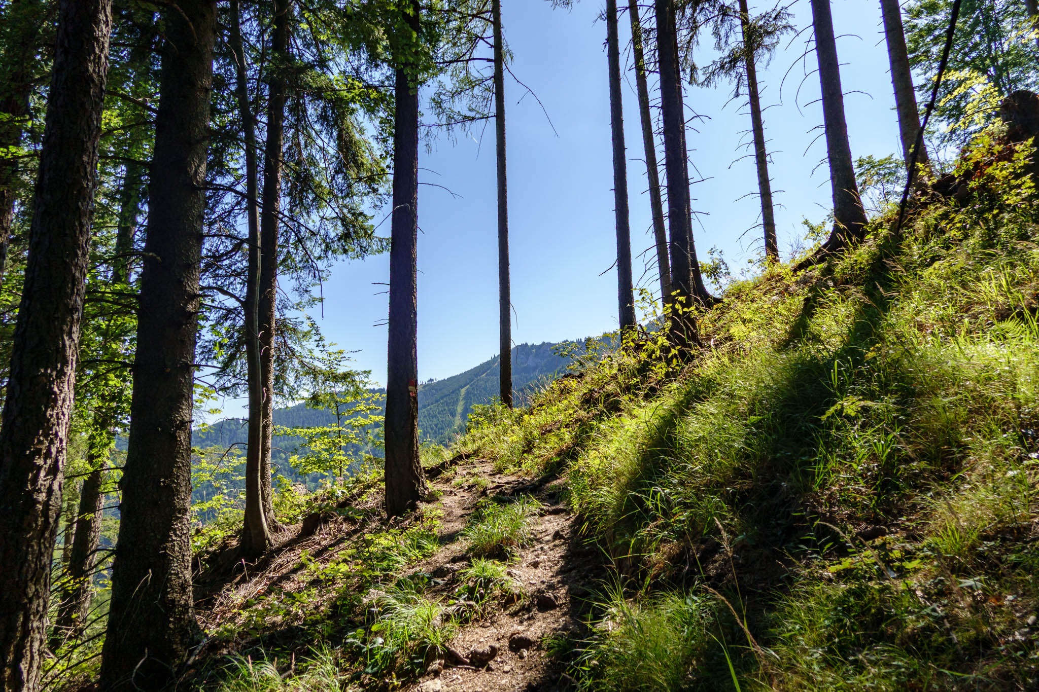 Nos tehát, a rövidítés minden gond nélkül megmegy és kiérek egy nevenincs nyeregbe, ahol két kisebb parkoló is áll a túrázók rendelkezésére. Tudniillik, akiknek lentről túl hosszú és túl magas lenne. Megspórolhatnak 100 m szintet és 3 kilométert (egy irányban). A turistaút ezután egy széles erdészeti úton folytatja, majd egy balra letérő ösvény végre bevisz az erdőbe és teketória nélkül kezd kunkorodni, neki az Unterberg északi lejtőinek.