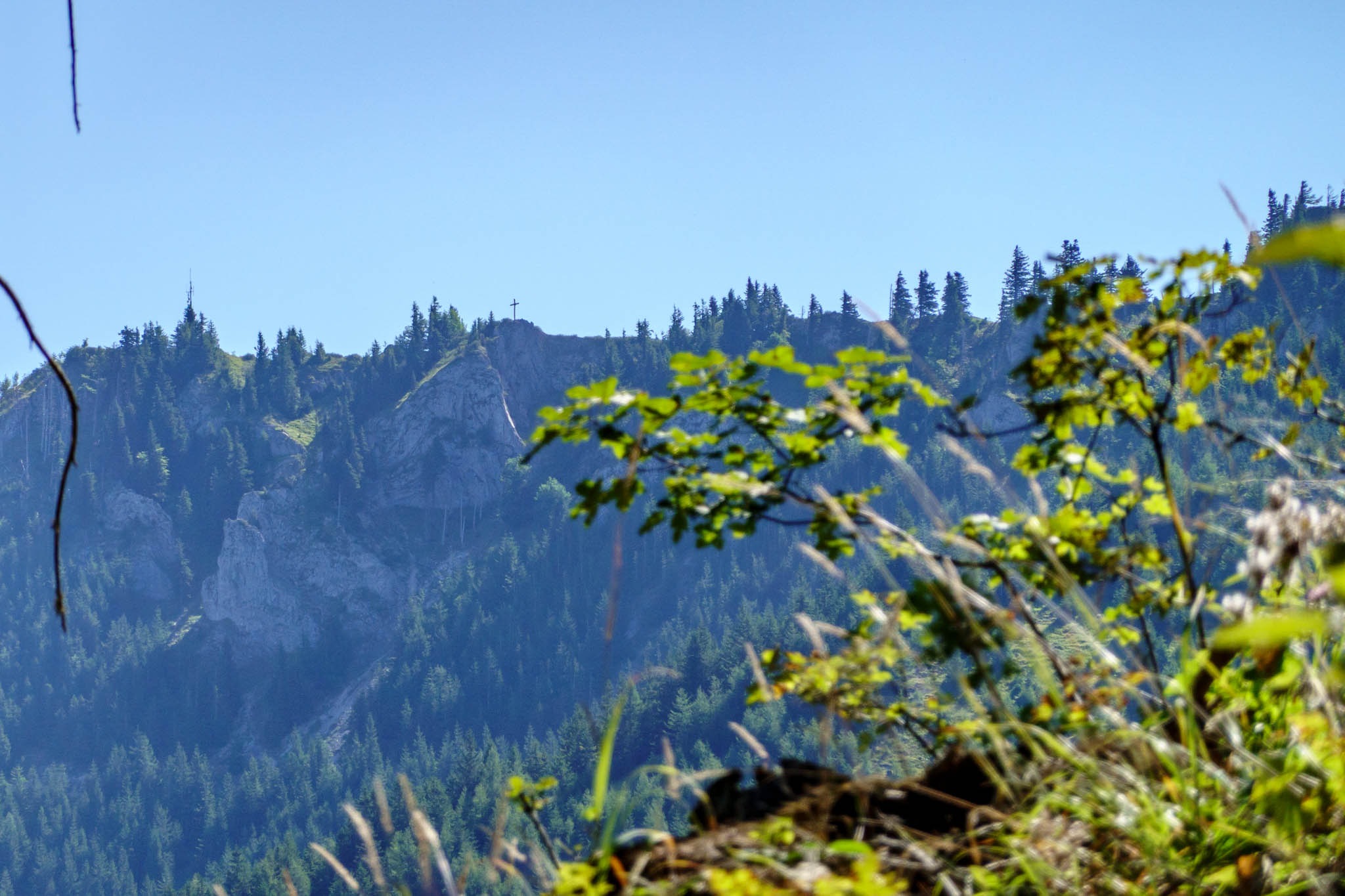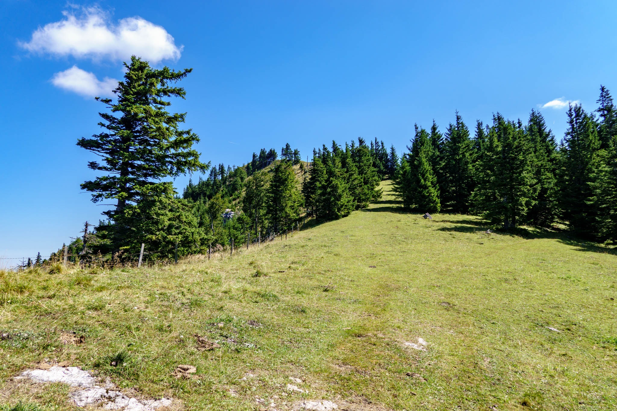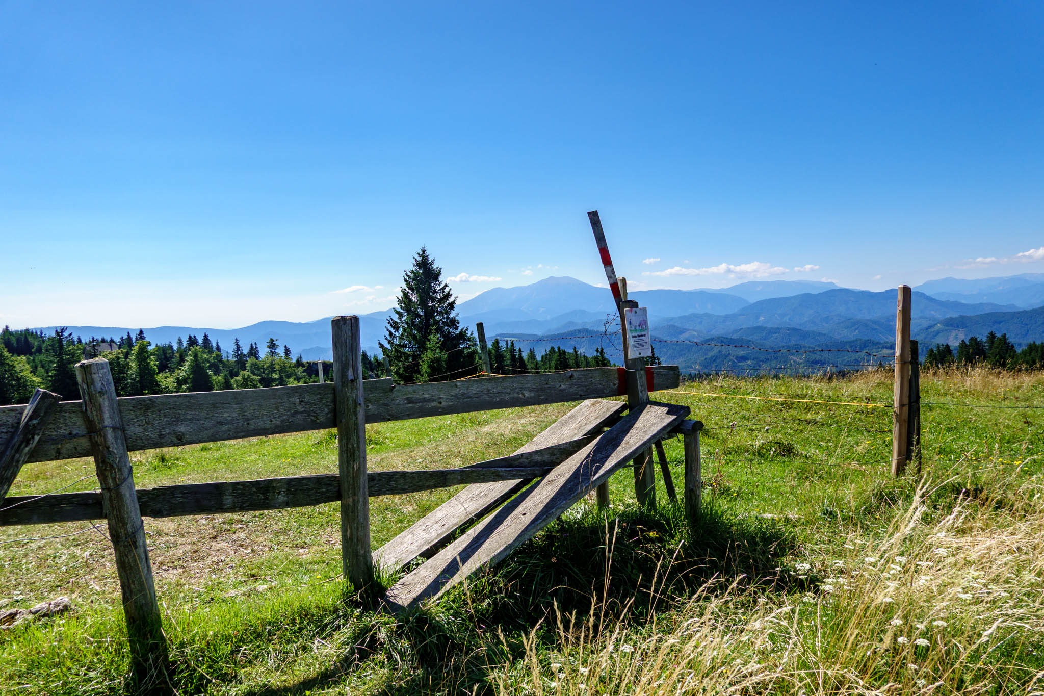 Szűk két óra alatt érkezem a Blochbodenra, ami egy tágas nagy legelő, szép kilátással a környező hegyvilágra (fenti képek). Ezután balra fordulok és egyenesen az Unterberg füves gerincén kaptatok fel a csúcsra. Indulástól számítva 2:30 óra után huppanhatok le kedvenc padomra a csúcskereszt tövében. Balzsam a léleknek, testnek. A hegy teljesen kihalt, ami feltehetően annak tudható be, hogy bár még iskolai szünidő van, de kedd lévén, a kunyhó (Unerberg Schutzhaus) nincs nyitva. Szerdától vasárnapig üzemel.