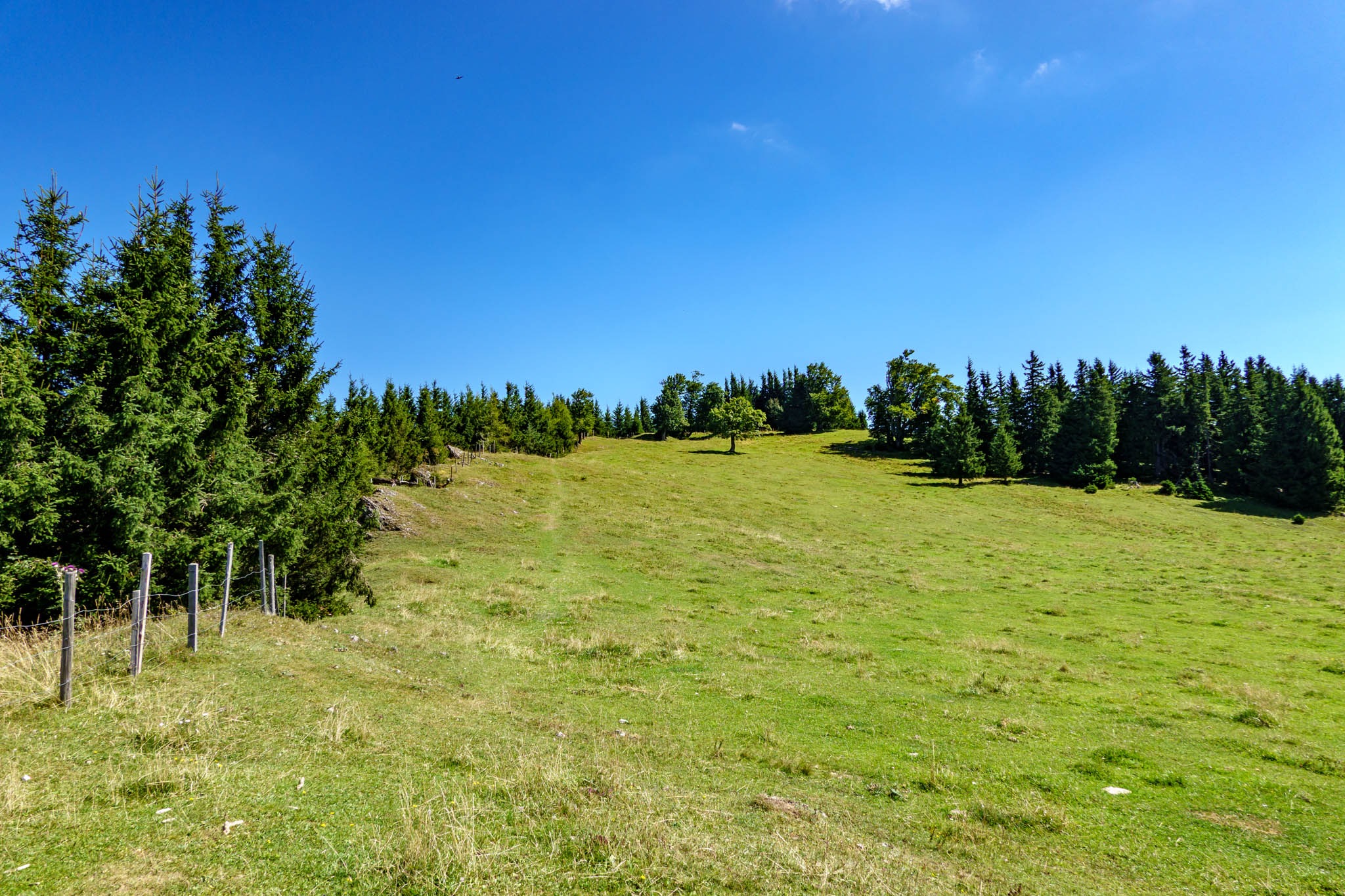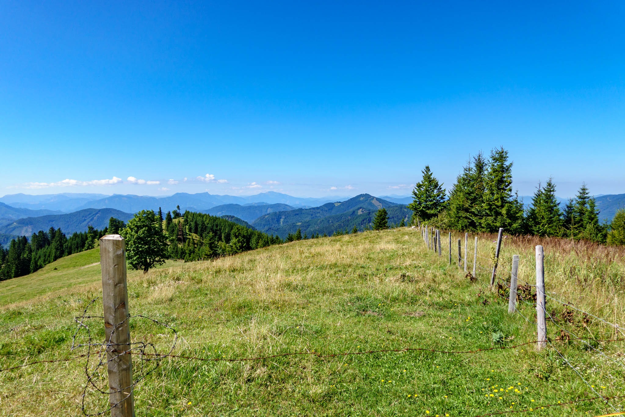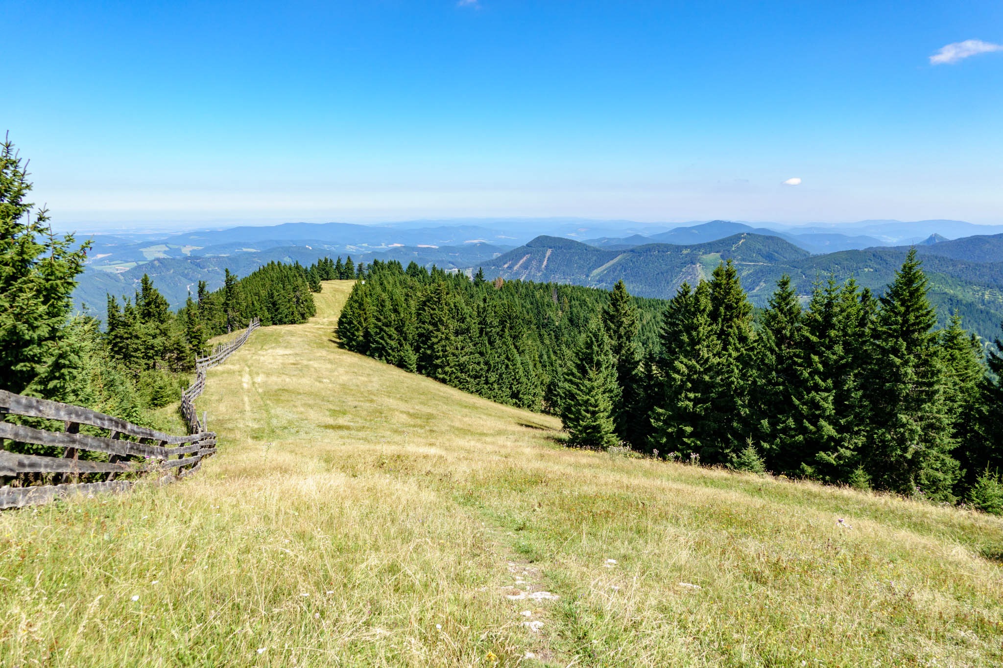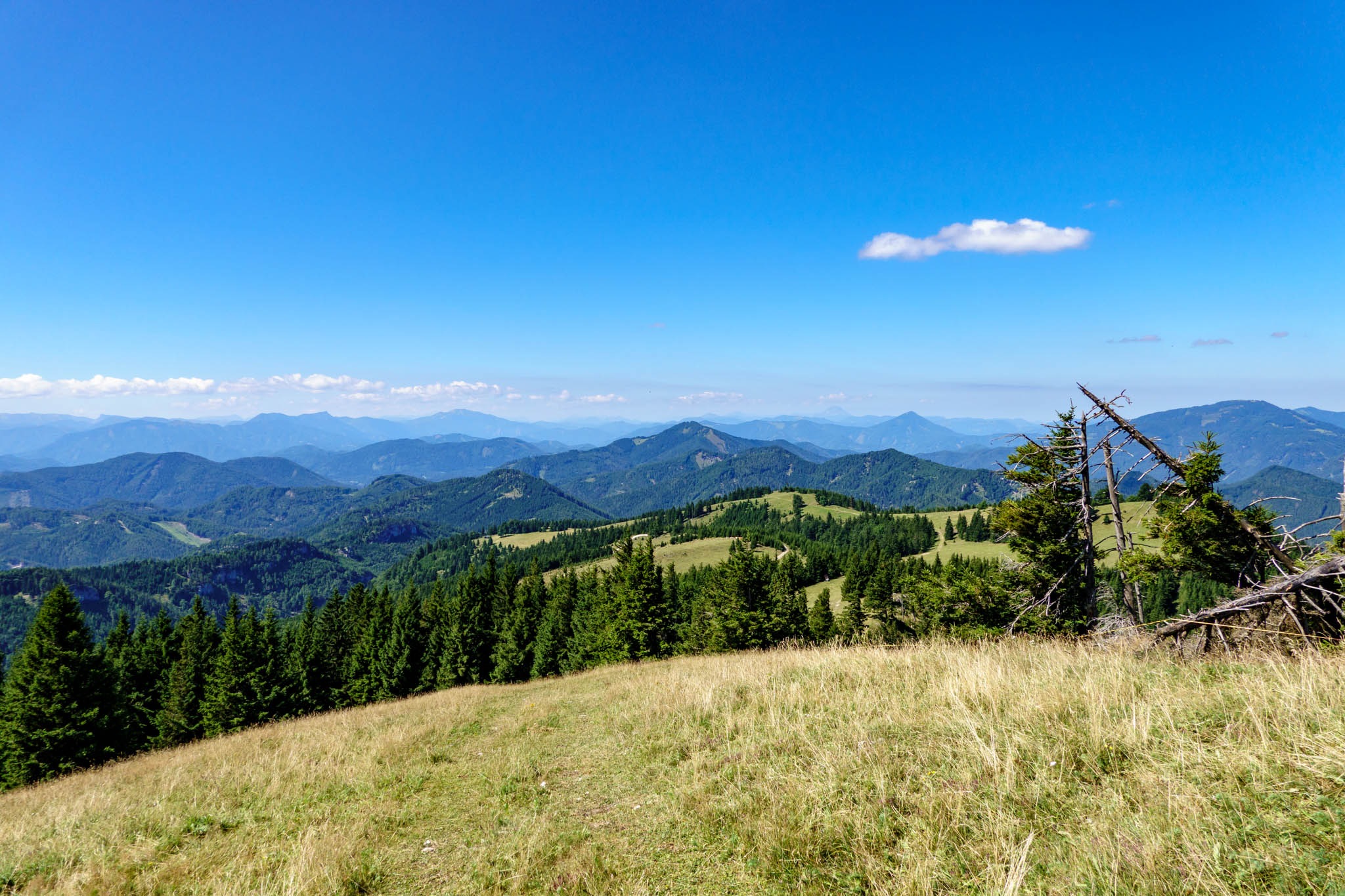 Szűk két óra alatt érkezem a Blochbodenra, ami egy tágas nagy legelő, szép kilátással a környező hegyvilágra (fenti képek). Ezután balra fordulok és egyenesen az Unterberg füves gerincén kaptatok fel a csúcsra. Indulástól számítva 2:30 óra után huppanhatok le kedvenc padomra a csúcskereszt tövében. Balzsam a léleknek, testnek. A hegy teljesen kihalt, ami feltehetően annak tudható be, hogy bár még iskolai szünidő van, de kedd lévén, a kunyhó (Unerberg Schutzhaus) nincs nyitva. Szerdától vasárnapig üzemel.