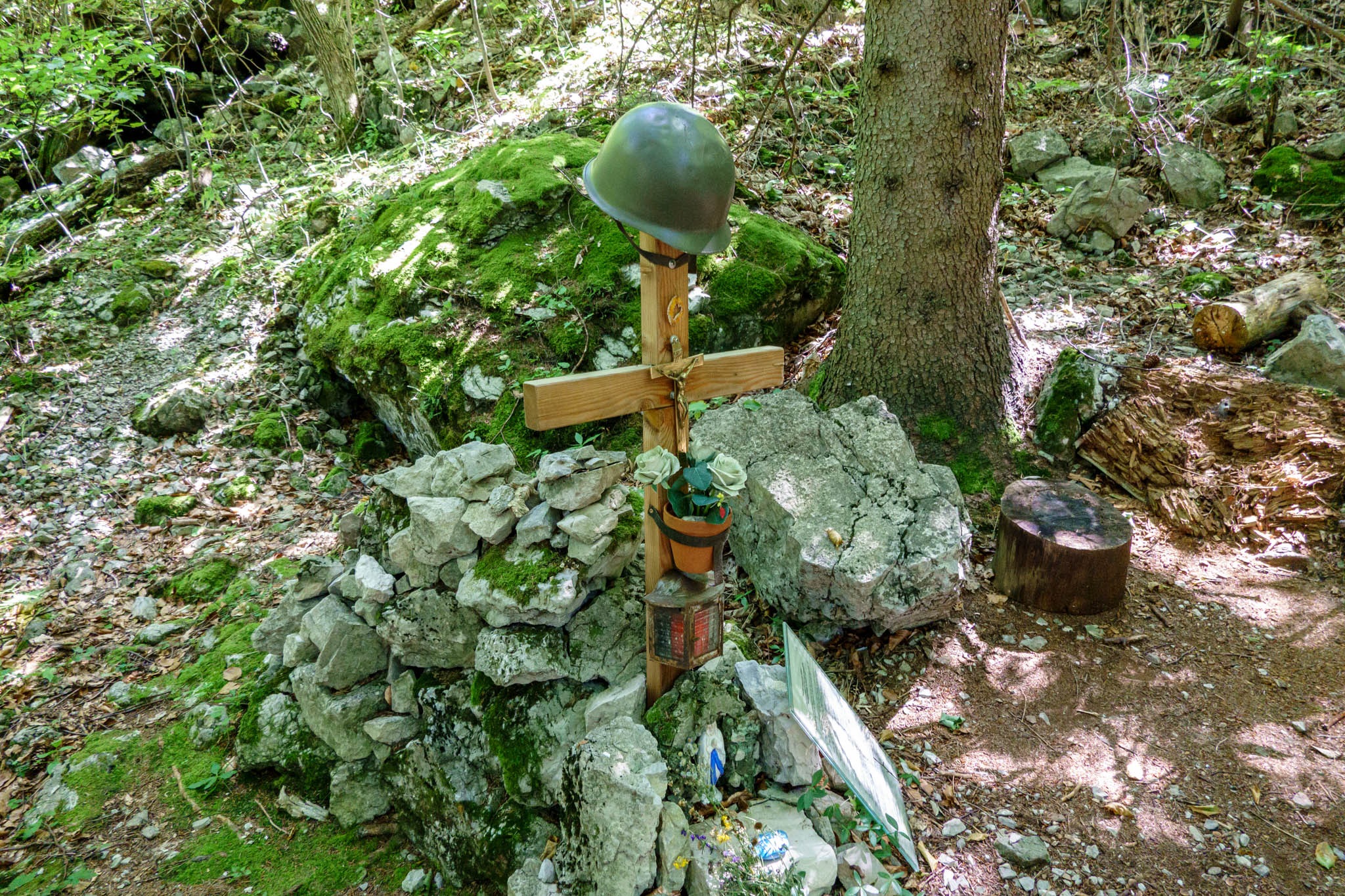 Továbbra is a gerincen maradok a már kívülről ismert csapáson. Egy táblával is jól jelzett helyen (fenti képen), mai utam balra letér a fő turistaútról. Ezen ereszkedem tovább a Wallerbachtalban. Érkezem a német katona szép kis kereszttel jelzett sírjához. A történetét taglaló beszámolót a múltkor lefényképeztem, ott lehet olvasni (teljes felbontásban). Közben az eredeti vas sisakot közönséges mai katonai pléhsisakra cserélték. Talán kárt tett benne már a rozsda, vagy ellopták, ki tudja.