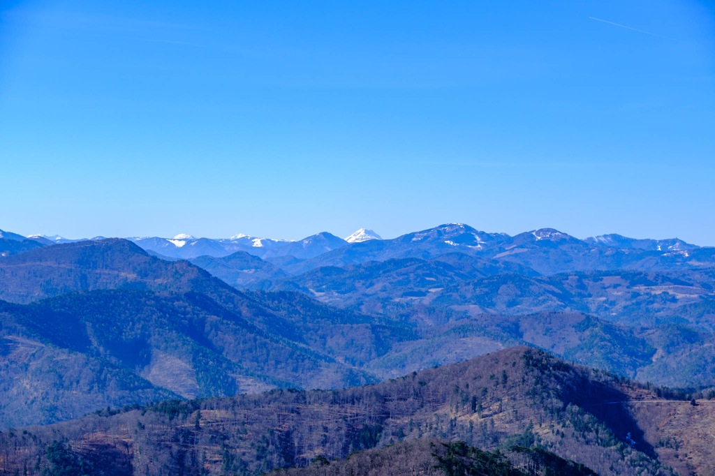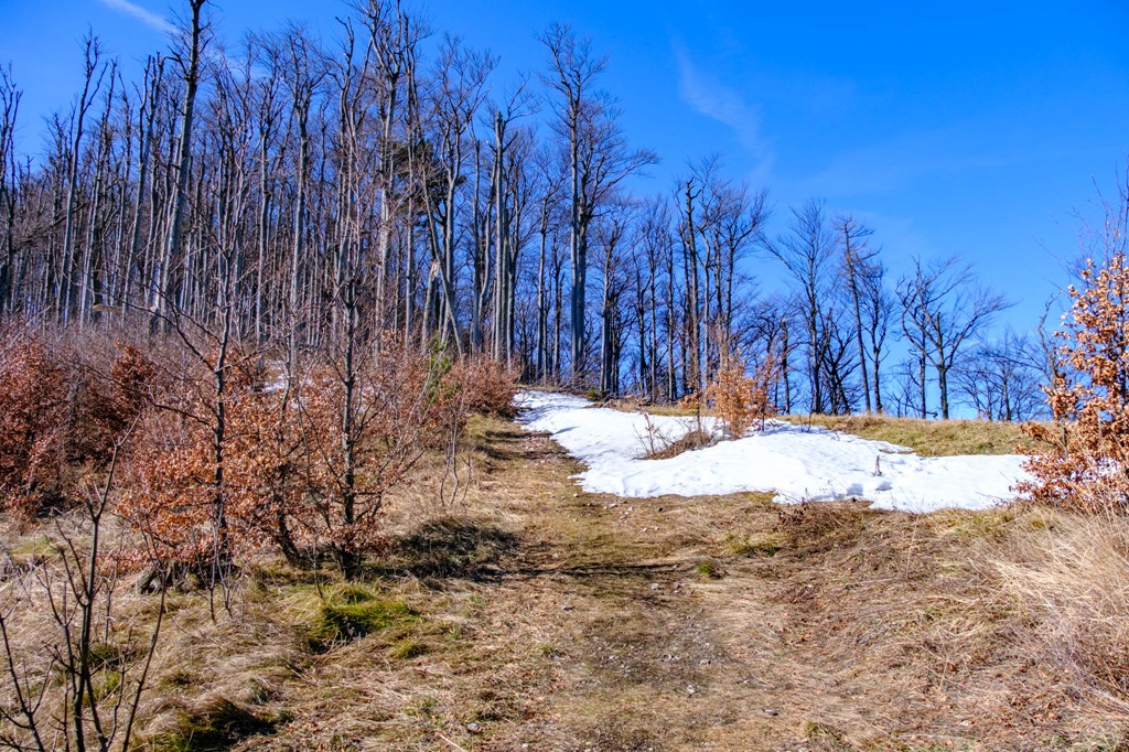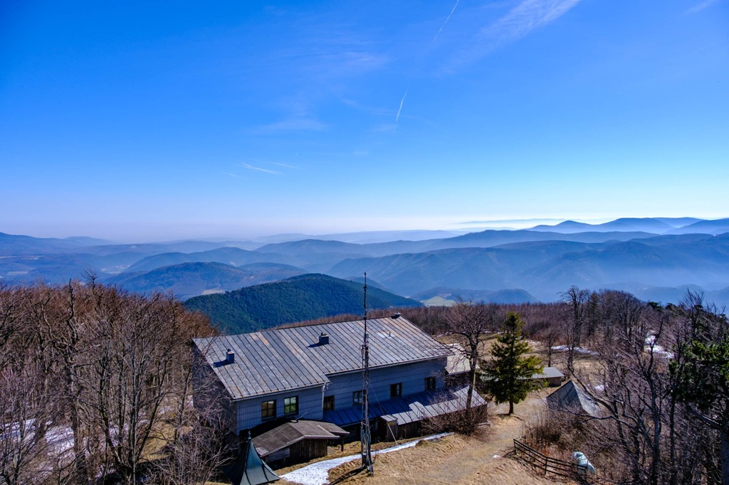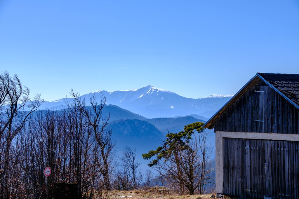 Remélem havat nem kell taposnom. Ezért is választom ezt a szerényke kis magaslatot célomul. Máshol. kissé feljebb, még akad szépszerével. Ha már tavasz, akkor legyen úgy. Aztán kiderül, hogy maradt még némi fehérség itt is. Nem számottevő. Az évek óta bezárt vendégház tövében kell egy rövidke szakaszon hókását kell mégis dagasztanom. Ez minden. A kilátó ma hívogat, kihagyni bűn lenne. Ellátni jó messzire. Schneebrg, Unterberg, Ötscher jól kivehetőek.